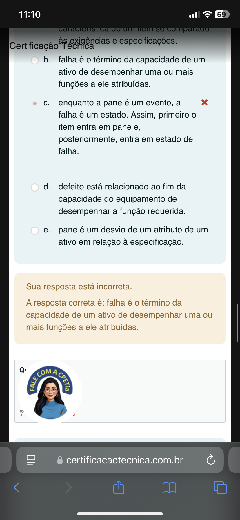 11:10 59 um se Certificação Tecnica às exigências e especificações. b. falha é o término da capacidade de um ativo de desempenhar uma ou mais funções a ele atribuídas. C. enquanto a pane é um evento, a x falha é um estado. Assim, primeiro o item entra em pane e, posteriormente, entra em estado de falha. d. defeito está relacionado ao fim da capacidade do equipamento de desempenhar a função requerida. e. pane é um desvio de um atributo de um ativo em relação à especificação. Sua resposta está incorreta. A resposta correta é: falha é o término da capacidade de um ativo de desempenhar uma ou mais funções a ele atribuídas. COM A CP certificacaotecnica.com.br