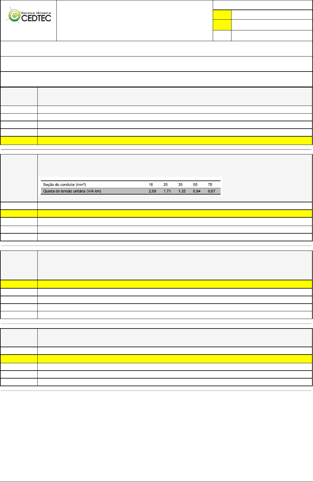 Pincel Atômico - 06/04/2025 14:41:57 1/1 MARCELA NASCIMENTO SOUTO Exercício Caminho do Conhecimento - Etapa 8 (21794) Atividade finalizada em 02/02/2025 14:20:04 (3347458 / 2) LEGENDA Resposta correta na questão # Resposta correta - Questão Anulada X Resposta selecionada pelo Aluno Disciplina: PROJETOS ELÉTRICOS [1029168] - Avaliação com 4 questões, com o peso total de 13,00 pontos [capítulos - 112] Turma: Curso Técnico: Eletrotécnica - Grupo: EAD - 02/24 - EAD ELE [113127] Aluno(a): 91577545 - MARCELA NASCIMENTO SOUTO - Respondeu 3 questões corretas, obtendo um total de 9,75 pontos como nota [350065_133434] Questão 001 Dez cargas residenciais de 15W, cada, são alimentadas por um mesmo transformador. O fator de demanda do grupo de cargas é 0,70 e o fator de diversidade é 1,20. A demanda diversificada do grupo de cargas para o transformador, em KW, é: 257,1 120 214,3 125 X 87,5 [350063_133467] Questão 002 Em um circuito que alimenta um chuveiro monofásico, potência 6600 W e tensão 110 V, possuindo 40 m de comprimento, deseja-se dimensionar o seu condutor apenas pelo critério da queda de tensão. Admite-se um máximo de queda de tensão de 3%. O condutor será de PVC, instalado em eletroduto embutido exclusivo para esse circuito, sendo que a queda de tensão unitária, conforme dados do fabricante, pode ser obtida a partir da tabela a seguir: A bitola do condutor escolhido deverá ser de: #50 mm² #16 mm² X #35 mm² #25 mm² #70 mm² [350064_133451] Questão 003 O dimensionamento correto dos condutores de uma instalação é primordial para garantir a segurança das pessoas e equipamentos, evitando o risco de incêndio. Nas instalações elétricas de baixa tensão, os condutores devem ser dimensionados pelo critério do limite de queda de tensão e pelo critério da capacidade de condução de corrente dos condutores. São dados utilizados para o dimensionamento de condutores pelo critério da capacidade de condução de corrente: X Modo e local de instalação e agrupamento dos circuitos. Modo e local de instalação e número de emendas do circuito. Comprimento do circuito e número de emendas do circuito. Agrupamento dos circuitos e comprimento do circuito. Número de emendas do circuito e agrupamento dos circuitos. [350065_133438] Questão 004 Uma instalação elétrica possui um fator de carga muito baixo. Uma maneira de melhorar esse fator é: Utilizar equipamentos com maior tensão de alimentação. X Redistribuir as cargas elétricas de modo a evitar a superposição no tempo. Dar preferência a equipamento com melhor fator de potência. Dar preferência a equipamento com melhor rendimento. Melhorar o fator de utilização dos equipamentos.