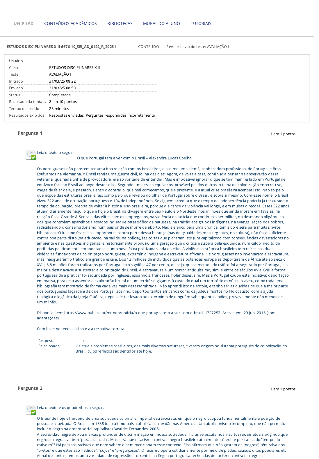 Revisar envio do teste: AVALIAÇÃO IESTUDOS DISCIPLINARES XIII 6676-10_SEI_AD_0122_R_20251 CONTEÚDO Usuário joseli.rodrigues1 @aluno.unip.br Curso ESTUDOS DISCIPLINARES XIII Teste AVALIAÇÃO I Iniciado 31/03/25 08:22 Enviado 31/03/25 08:50 Status Completada Resultado da tentativa 8 em 10 pontos Tempo decorrido 28 minutos Resultados exibidos Respostas enviadas, Perguntas respondidas incorretamente Pergunta 1 Resposta Selecionada: b. Leia o texto a seguir. O que Portugal tem a ver com o Brasil – Alexandra Lucas Coelho Os portugueses não parecem ter uma boa relação com os brasileiros, disse-me uma alemã, conhecedora profissional de Portugal e Brasil. Estávamos na Alemanha, o Brasil temia uma guerra civil, foi há dez dias. Agora, de volta à casa, continuo a pensar na observação dessa veterana, que nada tinha de provocadora, era só vontade de entender. Mas é impossível ignorar o que se tem manifestado em Portugal de equívoco face ao Brasil ao longo destes dias. Segundo um desses equívocos, provável pai dos outros, o tema da colonização encerrou-se, chega de falar dele, é passado. Penso o contrário, que mal começamos, que é presente, e a atual crise brasileira acentua isso. Não só pelo que expõe das estruturas brasileiras, como pelo que revelou do olhar de Portugal sobre o Brasil, e sobre si mesmo. Com esse nome, o Brasil viveu 322 anos de ocupação portuguesa e 194 de independência. Se alguém acredita que o tempo da independência poderia já ter curado o tempo da ocupação, precisa de voltar à história luso-brasileira, porque o alcance da violência vai longe, e em muitas direções. Esses 322 anos atuam diariamente naquilo que é hoje o Brasil, na clivagem entre São Paulo e o Nordeste, nos milhões que ainda moram em favelas, na relação Casa-Grande & Senzala das elites com os empregados, na violência da polícia que continua a ser militar, no desmando oligárquico dos que controlam aparelhos e estados, no saque catastrófico da natureza, na traição aos grupos indígenas, na evangelização dos pobres, radicalizando o conservadorismo num país onde se morre de aborto. Não é elenco para uma crônica, tem sido e será para muitas, livros, bibliotecas. O lulismo fez coisas importantes contra parte dessa herança (nas desigualdades mais urgentes, na cultura), não fez o suficiente contra boa parte disto (na educação, na saúde, na polícia), fez coisas que pioraram isto (um capitalismo com consequências devastadoras no ambiente e nas questões indígenas) e historicamente produziu uma geração que o critica e supera pela esquerda, num caldo inédito de periferias politicamente empoderadas e uma nova faixa politizada vinda da elite. A violência sistêmica brasileira tem raízes nas duas violências fundadoras da colonização portuguesa, extermínio indígena e escravatura africana. Os portugueses não inventaram a escravatura, mas inauguraram o tráfico em grande escala. Dos 12 milhões de indivíduos que as potências europeias deportaram de África até ao século XVIII, 5,8 milhões foram traficados por Portugal. Isto significa 47 por cento, ou seja, quase metade do tráfico foi assegurado por Portugal, e a maioria destinava-se a sustentar a colonização do Brasil. A escravatura é um horror antiquíssimo, sim, e entre os séculos XV e XVIII a forma portuguesa de a praticar foi secundada por ingleses, espanhóis, franceses, holandeses, sim. Mas a Portugal coube esta iniciativa: deportação em massa, para nela assentar a exploração brutal de um território gigante, à custa do qual um território minúsculo viveu, como toda uma bibliografia tem mostrado de forma cada vez mais desassombrada. Não aprendi isto na escola, e tenho sérias dúvidas de que a maior parte dos portugueses faça ideia de que Portugal, sozinho, deportou tantos africanos como os judeus mortos no Holocausto, com a ajuda teológica e logística da Igreja Católica, depois de ter levado ao extermínio de ninguém sabe quantos índios, provavelmente não menos de um milhão. Disponível em: https://www.publico.pt/mundo/noticia/o-que-portugal-tem-a-ver-com-o-brasil-1727252. Acesso em: 29 jun. 2016 (com adaptações). Com base no texto, assinale a alternativa correta. Os atuais problemas brasileiros, das mais diversas naturezas, tiveram origem no sistema português de colonização do Brasil, cujos reflexos são sentidos até hoje. Pergunta 2 Leia o texto e os quadrinhos a seguir. O Brasil de hoje é herdeiro de uma sociedade colonial e imperial escravocrata, em que o negro ocupou fundamentalmente a posição de pessoa escravizada. O Brasil em 1888 foi o último país a abolir a escravidão nas Américas. Um abolicionismo incompleto, que não permitiu incluir o negro na ordem social capitalista (Bastide; Fernandes, 2008). A escravidão negra deixou marcas profundas de discriminação em nossa sociedade, inclusive escutamos insultos raciais atuais exigindo que negros e negras voltem “para a senzala”. Mas será que o racismo contra o negro brasileiro atualmente só existe por causa do “tempo do cativeiro”? Há pessoas racistas que nem sabem e nem mencionam esse contexto. Elas afirmam que não gostam de “negros”, têm raiva dos “pretos” e que estes são “fedidos”, “sujos” e “preguiçosos”. O racismo opera cotidianamente por meio de piadas, causos, ditos populares etc. Afinal de contas, temos uma variedade de expressões correntes na língua portuguesa recheadas de racismo contra os negros. CONTEÚDOS ACADÊMICOS BIBLIOTECAS MURAL DO ALUNO TUTORIAIS joseli.rodrigues1 @aluno.unip.br UNIP EAD 1 em 1 pontos 1 em 1 pontos http://company.blackboard.com/ https://ava.ead.unip.br/webapps/blackboard/execute/courseMain?course_id=_400456_1 https://ava.ead.unip.br/webapps/blackboard/content/listContent.jsp?course_id=_400456_1&content_id=_4508855_1&mode=reset https://ava.ead.unip.br/webapps/portal/execute/tabs/tabAction?tab_tab_group_id=_25_1 https://ava.ead.unip.b