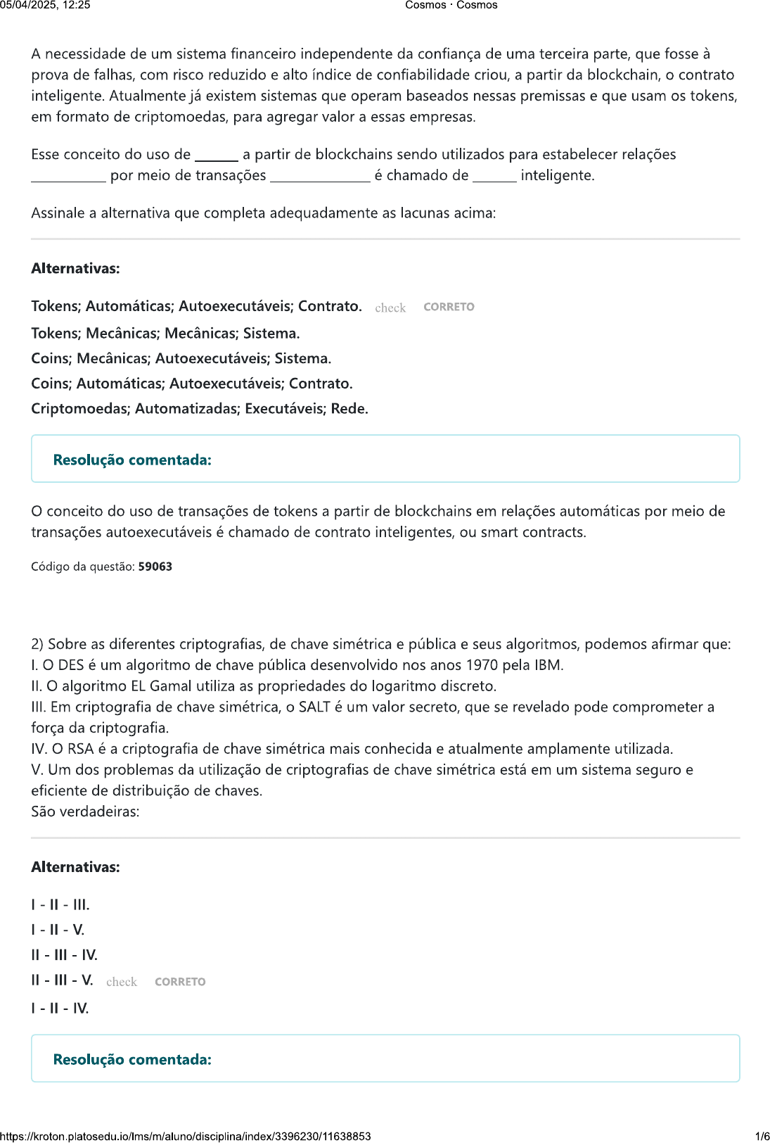 05/04/2025, 12:25 Cosmos Cosmos A necessidade de um sistema financeiro independente da confiança de uma terceira parte, que fosse à prova de falhas, com risco reduzido e alto índice de confiabilidade criou, a partir da blockchain, o contrato inteligente. Atualmente já existem sistemas que operam baseados nessas premissas e que usam os tokens, em formato de criptomoedas, para agregar valor a essas empresas. Esse conceito do uso de a partir de blockchains sendo utilizados para estabelecer relações por meio de transações é chamado de inteligente. Assinale a alternativa que completa adequadamente as lacunas acima: Alternativas: Tokens; Automáticas; Autoexecutáveis; Contrato. check CORRETO Tokens; Mecânicas; Mecânicas; Sistema. Coins; Mecânicas; Autoexecutáveis; Sistema. Coins; Automáticas; Autoexecutáveis; Contrato. Criptomoedas; Automatizadas; Executáveis; Rede. Resolução comentada: O conceito do uso de transações de tokens a partir de blockchains em relações automáticas por meio de transações autoexecutáveis é chamado de contrato inteligentes, ou smart contracts. Código da questão: 59063 2) Sobre as diferentes criptografias, de chave simétrica e pública e seus algoritmos, podemos afirmar que: I. O DES é um algoritmo de chave pública desenvolvido nos anos 1970 pela IBM. II. O algoritmo EL Gamal utiliza as propriedades do logaritmo discreto. III. Em criptografia de chave simétrica, o SALT é um valor secreto, que se revelado pode comprometer a força da criptografia. IV. O RSA é a criptografia de chave simétrica mais conhecida e atualmente amplamente utilizada. V. Um dos problemas da utilização de criptografias de chave simétrica está em um sistema seguro e eficiente de distribuição de chaves. São verdadeiras: Alternativas: III. V. II III IV. check CORRETO Resolução comentada: 1/605/04/2025, 12:25 Cosmos Cosmos O PBE usa o SALT, um número público e randômico, para a geração de chaves a partir de uma senha. DES é um algoritmo de chave simétrica, cuja distribuição de chaves é um problema quando não existe um canal seguro disponível. Já El Gama e o RSA são criptografias de chave pública que utilizam propriedades do logaritmo discreto. Código da questão: 59038 3) O conceito de transação de uma blockchain é a concepção de que é mais fácil controlar os registros das transações dentro da rede do que controlar o saldo em si. Portanto, em um sistema fechado não se possui saldo, mas sim registra-se a diferença entre entrada e saída de cada bloco. Acerca dos registros de dados na blockchain, assinale a alternativa correta: Alternativas: Não faz registro da diferença entre entrada e saída. Faz registro de valores que entram, mas não controla as saídas. Faz registro de fluxo de valor. check CORRETO Faz registro de valor. Faz registro do saldo final. Resolução comentada: Por se tratar de um sistema descentralizado e autor replicável, o conceito de transação é o que a blockchain utiliza para saber quais valores cada endereço possui, acessando assim os valores das transações na blockchain, de qual endereço cada valor foi enviado, e não apenas as entradas e saídas, e sim o seu fluxo. Código da questão: 59062 4) Algumas das formas de se garantir a segurança das informações na internet são assegurar a originalidade, sua fidelidade e autenticação. Um dos pilares da Segurança da Informação é o uma característica que impede que pessoas e instituições a autoria de determinadas Assinale a alternativa que completa adequadamente as lacunas acima Alternativas: Repúdio; Afirmem; Mensagens. Não repúdio; Neguem; Mensagens. check CORRETO Recusa da autoria; Neguem; Mensagens. Não repúdio; Confirmem; Informações. Não repúdio; Afirmem; Informações. 2/612:25 Cosmos Cosmos Resolução comentada: Não repúdio é uma característica que confirma a autoria de determinadas mensagens de pessoas ou instituições, pois autentica a origem e autoria dessas mensagens. Código da questão: 59048 5) A invenção de Satoshi Nakamoto que sustenta a bitcoin e todos os outros sistemas de criptomoedas se chama: Alternativas: Blockchain. check CORRETO Chave privada. Criptografia. Rede de computadores. Base de dados. Resolução comentada: Satoshi Nakamoto é o pseudônimo do inventor da blockchain e da bitcoin. Código da questão: 59060 6) Certificados digitais são arquivos emitidos com informações para facilitar o processo de relação confiável entre pessoas por meio da internet. Sobre certificados digitais, analise as seguintes asserções: I. Certificados digitais são emitidos apenas pelos donos de sites e são gratuitos. II. Além da assinatura e da validade, presente em todas as versões, a Versão 3 do x.509 tem informações sobre a ID do emissor. III. Certificados digitais não podem ser criados por qualquer pessoa, pois só podem ser gerados por meio da chave privada de uma CA. IV. O protocolo x.509 é um padrão recomendado por uma organização que surgiu a partir de um comitê da ONU. V. O x.509 é utilizado em sistemas de e-mail como o S/MIME e em sites equipados com o protocolo SSL/TLS. São verdadeiras: Alternativas: - III. - III IV. - III V. 3/605/04/2025, 12:25 Cosmos Cosmos check CORRETO Resolução comentada: Certificados digitais, embora possam ser emitidos por qualquer pessoa, normalmente são assinados por CAs para garantir a identidade da chave pública do emissor. Utilizando o protocolo x.509, recomendado pelo ITU-T, uma organização surgida a partir de um comitê da ONU, sua versão mais recente, v3, possui informações como dados do emissor e do sujeito e é implementado como padrão em protocolos como o s/MIME e o SSL/TLS. Código da questão: 59052 7) A invenção da blockchain gerou um conjunto de elementos intelectualmente organizados, com soluções para demandas existentes há muito tempo no que diz respeito à descentralização, anonimato e liberdade nas transações financeiras. É 