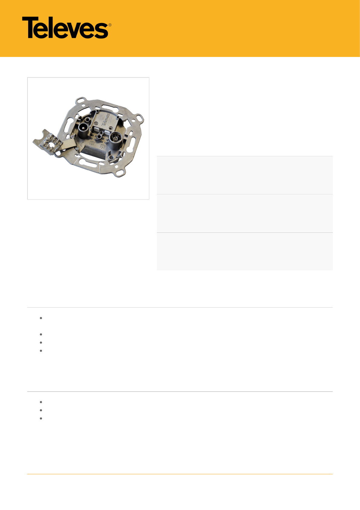 https://www.televes.com 1 Televés se reserva el derecho de modificar el producto Toma terminal separadora 2 conectores: FM/TV-SAT Toma terminal separadora con dos conectores CEI. El de la izquierda es un CEI macho para FM (radio) y TV terrestre y el de la derecha es un CEI hembra para TV satélite (FI). Ref.4301 Diseño de la toma: Con garras, 1. Embalaje: Blister, Complementos: Toma + Embellecedor Ref. lógica EAN13 8424450043011 Ref.5226 Diseño de la toma: Con garras, 1. Embalaje: Caja, Complementos: Toma Ref. lógica EAN13 8424450052266 Ref.5276 Diseño de la toma: Sin garras, 1. Embalaje: Caja, Complementos: Toma Ref. lógica EAN13 8424450122853 Destaca por Filtro separador de gran rechazo: la señal SAT se filtra en el conector CEI macho de FM/TV, y la FM/TV terrestre se filtra en el conector CEI hembra de satélite. Fabricación automatizada en línea robotizada Apantallamiento elevado Gran aislamiento entre salidas Características principales Fabricada en Zamak, de gran resistencia Paso de DC desde el conector SAT hacia la entrada Compatibles con cables coaxiales de diámetro de cubierta Ø 5...7mm https://www.televes.com 2 Descubre Tomas Televés: Fijación sin tornillo Una toma de clase A llena de ventajas: El vivo se conecta por simple empuje, no hay que apretar ningún tornillo, pero con una fuerza de sujeción equivalente Soporta diámetros del vivo entre 0,65 a 1,2mm y diámetros exteriores del cable de 5 a 6,9mm Guía cónica, tipo conector "F" para introducir de forma fácil el vivo Margen amplio en la longitud del vivo (5 a 15mm) que dificulta los cortos entre vivo y malla Abrazadera basculante y autoestable de abertura total La abrazadera consta de 3 filas dentadas en 9mm para una perfecta sujeción de la malla Perforación del circuito impreso para compatibilizar el tornillo de fijación de los embellecedores Bordes redondeados para evitar cortes Apantallamientos Clase A Además, esta gama de producto lleva varios grabados sobre el chasis: Marcado CE Referencia numérica y lógica Indicaciones de entradas y salidas Dimensiones del pelado del cable https://www.televes.com 3 Especificaciones técnicas Método de anclaje Sin tornillos Número de conectores 2 Conector R/TV "CEI" macho Conector SAT "CEI" hembra Salida de paso No Bandas TV SAT Margen de frecuencia MHz 5 ... 862 950 ... 2400 Rechazo entre salidas dB > 10 > 15 Atenuación: Conector R/TV dB 0,6 -- Atenuación: Conector SAT dB -- 1,5 Paso DC SAT→Entr. Corriente máx. mA 350