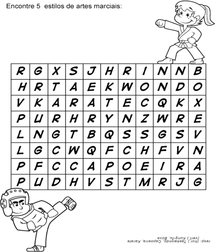 1ª Aula de Educação Física 08/10/2021 AS ARTES MARCIAIS As artes marciais e as lutas possuem alguns aspectos que as tonam diferentes. As lutas consistem no combate direto com o adversário. Já as artes maciais diz respeito às técnicas de lutas desenvolvidas para utilizar em batalhas, no intuito de defender um povo ou uma nação. No entanto, com o uso de armamentos de fogo, essa modalidade passou perder função para esse fim. Porém, o termo continuou em utilização. O taekwondo, assim como o judô, caratê, muay thai, esgrima, dentre outros depostos são exemplos de artes marciais. Atividade 2ª Aula de Educação física 22/10/2021 A luta Taekwondo O taekwondo é uma arte marcial originalmente coreana, que teria surgido por volta do século VII d.C. No “TAEKWONDO”, são utilizados alguns conceitos norteadores para a arte marcial: cortesia, integridade, perseverança e autocontrole e espírito indomável. "Tae", refere-se ao "pé" ; "Kwon", refere-se a "mão" ; "Do", refere-se a "arte" ou ao "caminho". Portanto, coletiva e literalmente, "Taekwondo" significa "O caminho do pé e da mão". No Brasil, acredita-se que o taekwondo tenha sido introduzido em 1970. No entanto, esse dado não é confiável, uma vez que o primeiro campeonato brasileiro dessa arte marcial ocorreu em 1973. O fato de o tempo de diferença entre sua introdução e o primeiro campeonato nacional ser de apenas três anos faz com que os dados referentes à sua introdução em nosso país sejam duvidosos. Entretanto, o local onde se acredita que tenha sido a primeira academia voltada ao ensino do taekwondo hoje se transformou em sede da Federação Paulista de Taekwondo, que é localizada no bairro da Liberdade, na cidade de São Paulo. Atividade 1)O que é Taekwondo? ______________________________________________________________________________________________________________________________________ 2)Qual e o significa a palavra Taekwondo? ______________________________________________________________________________________________________________________________________ 3) Em que ano, acredita-se que o Taekwondo tenha sido introduzido no Brasil ? ___________________________________________________________________ 4) Colorir o desenho do lutador de Taekwondo. 3ª aula de Educação física 29/10/2021 Lutas brasileiras Existem várias lutas genuinamente brasileira. A capoeira, o Huka - Huka e o Jiu-jitsu brasileiro são alguns exemplos. As lutas são caracterizadas por serem ações de combate e incluem o uso de técnicas como agarramento, derrubadas e golpes. Elas podem ser realizadas por dois ou mais competidores e variam de acordo com as regras. A capoeira é uma das mais conhecidas lutas de origem brasileira. Ela é uma luta que mistura dança e música. É nosso legado afro-indígena-brasileiro e representa a resistência do nosso povo. A malemolência e o gingado da capoeira é a cara do Brasil. A roda de capoeira não é somente o local onde se pratica a capoeira, é onde ocorre a manifestação cultural, de ancestralidade, de integração e saúde. A capoeira pode ser praticada em todas as idades. Ela traz inúmeros benefícios a saúde, proporcionando o desenvolvimento da força, flexibilidade, coordenação, agilidade e equilíbrio. O Huka-Huka é uma competição de luta de origem indígena, tradicionalmente realizada no final do guarupe (festa em homenagem aos mortos). ATIVIDADE 1) Existem várias lutas genuinamente brasileiras. Cite três exemplos: ______________________________________________________________________________________________________________________________________________________________ 2) Marque um X na resposta correta. a)A capoeira é uma luta de origem: ( ) indígena ( ) americana ( ) africana ( ) europeia b)Qual a diferença entre lutar e brigar: ( )Lutar é uma modalidade onde se tem regras e lugar apropriado e profissionais adequados que garantem a integridade dos atletas, já a briga é desleal e uma forma de impor suas escolhas, sem respeitar ao próximo ( )Brigar é uma modalidade onde se tem regras e lugar apropriado e profissionais adequados que garantem a integridade dos atletas, já a luta é desleal e uma forma de impor suas escolhas, sem respeitar ao próximo ( )Não existe diferença. c) A arte Marcial dos povos indígenas do Xingu e dos Índios Bakairis é conhecido como: ( ) Boxe ( )Huka-Huka ( )Capoeira ( )Judô 4ª aula de Educação Física 05/11/2021 Luta caratê O CARATÊ é uma arte onde uma pessoa aprende a utilizar as suas mãos ou outros membros do corpo (pés, joelhos…) para se defender. TE significa em japonês Mão; KARA significa em japonês Vazio. Deste modo, KARATE = KARA + TE significa então “Mão vazia”. ____________________________________________________________________________________________________________________________________________________________________________________________________________________________________________________________________________ 5ª Aula de Educação Física 12/11/2021 O MUAY THAI O MUAY THAI é uma luta originária da Tailândia, também conhecido como boxe tailandês. Arte marcial tailandesa com mais de 2000 anos de existência usada como forma de defesa nas guerras. MU = marcial; AY = arte; THAI = referente ao povo tailandês. Na Tailândia também é chamada de "LUTA DA LIBERDADE", pois era com ela que o povo tailandês se defendia dos inimigos que tentavam ocupar o seu território. É conhecida mundialmente como a Arte das Oito Armas, pois se caracteriza pelo uso combinado dos dois punhos + dois cotovelos + dois joelhos + duas 'canelas e pés‘. Basicamente seriam os movimentos do boxe acrescidos de joelhadas, cotoveladas e caneladas. image4.jpeg image5.jpeg image1.png image2.jpeg image3.jpeg