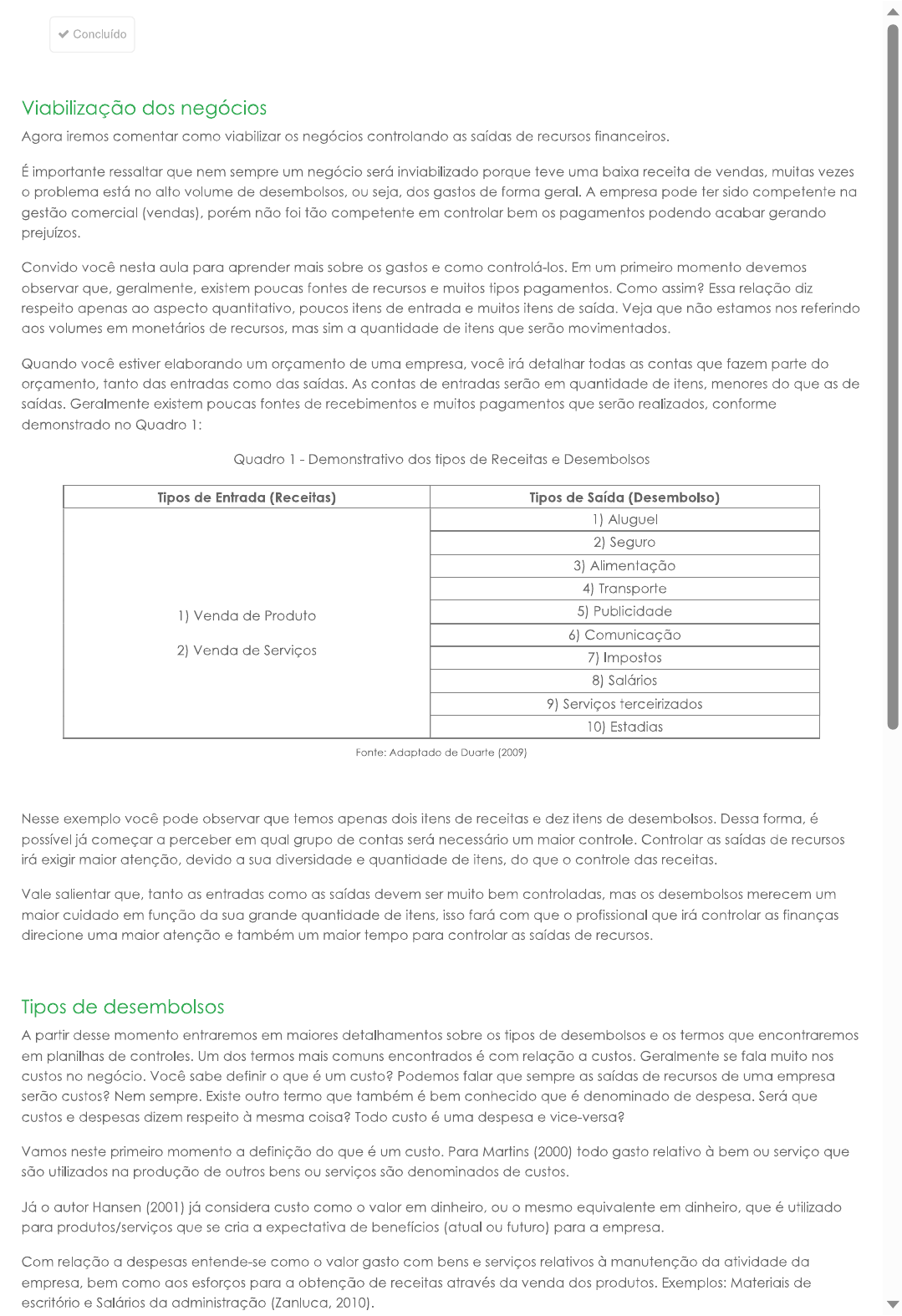 Concluído Viabilização dos negócios Agora iremos comentar como viabilizar os negócios controlando as saídas de recursos financeiros. É importante ressaltar que nem sempre um negócio será inviabilizado porque teve uma baixa receita de vendas, muitas vezes problema está no alto volume de desembolsos, ou seja, dos gastos de forma geral. A empresa pode ter sido competente na gestão comercial (vendas), porém não foi tão competente em controlar bem os pagamentos podendo acabar gerando prejuízos. Convido você nesta para aprender mais sobre os gastos e como controlá-los. Em um primeiro momento devemos observar que, geralmente, existem poucas fontes de recursos e muitos tipos pagamentos. Como assim? Essa relação diz respeito apenas ao aspecto quantitativo, poucos itens de entrada e muitos itens de saída. Veja que não estamos nos referindo aos volumes em monetários de recursos, mas sim a quantidade de itens que serão movimentados. Quando você estiver elaborando um orçamento de uma empresa, você irá detalhar todas as contas que fazem parte do orçamento, tanto das entradas como das As contas de entradas serão em quantidade de itens, menores do que as de saídas. Geralmente existem poucas fontes de recebimentos e muitos pagamentos que serão realizados, conforme demonstrado no Quadro 1: Quadro 1 Demonstrativo dos tipos de Receitas e Desembolsos Tipos de Entrada (Receitas) Tipos de Saída (Desembolso) 1) Aluguel 2) Seguro 3) Alimentação 4) Transporte 1) Venda de Produto 5) Publicidade 6) Comunicação 2) Venda de Serviços 7) Impostos 8) Salários 9) Serviços terceirizados 10) Estadias Fonte: Adaptado de Duarte (2009) Nesse exemplo você pode observar que temos apenas dois itens de receitas e dez itens de desembolsos. Dessa forma, é possível já começar a perceber em qual grupo de contas será necessário um maior controle. Controlar as saídas de recursos irá exigir maior atenção, devido a sua diversidade e quantidade de itens, do que controle das receitas. Vale salientar que, tanto as entradas como as saídas devem ser muito bem controladas, mas os desembolsos merecem um maior cuidado em função da sua grande quantidade de itens, isso fará com que profissional que irá controlar as finanças direcione uma maior atenção e também um maior tempo para controlar as saídas de recursos. Tipos de desembolsos A partir desse momento entraremos em maiores detalhamentos sobre os tipos de desembolsos e os termos que encontraremos em planilhas de controles. Um dos termos mais comuns encontrados é com relação a custos. Geralmente se fala muito nos custos no negócio. Você sabe definir que é um custo? Podemos falar que sempre as saídas de recursos de uma empresa serão custos? Nem sempre. Existe outro termo que também é bem conhecido que é denominado de despesa. Será que custos e despesas dizem respeito à mesma coisa? Todo custo é uma despesa e vice-versa? Vamos neste primeiro momento a definição do que é um custo. Para Martins (2000) todo gasto relativo à bem ou serviço que são utilizados na produção de outros bens ou serviços são denominados de custos. Já autor Hansen (2001) já considera custo como valor em dinheiro, ou mesmo equivalente em dinheiro, que é utilizado para produtos/serviços que se cria a expectativa de benefícios (atual ou futuro) para a empresa. Com relação a despesas entende-se como valor gasto com bens e serviços relativos à manutenção da atividade da empresa, bem como aos esforços para a obtenção de receitas através da venda dos produtos. Exemplos: Materiais de escritório e Salários da administração (Zanluca, 2010).