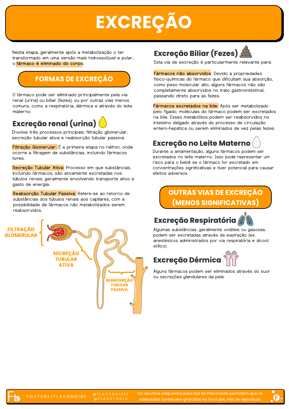t ít u lo Y O U T U B E / F L A V O N O I D E EXCREÇÃO FORMAS DE EXCREÇÃO OUTRAS VIAS DE EXCREÇÃO ( MENOS SIGNIFICATIVAS) Nesta etapa, geralmente após a metabolização o ter transformado em uma versão mais hidrossolúvel e polar, o fármaco é eliminado do corpo. Fármacos excretados na bile: Após ser metabolizado pelo fígado, moléculas do fármaco podem ser excretados na bile. Esses metabólitos podem ser reabsorvidos no intestino delgado através do processo de circulação entero-hepática ou serem eliminados de vez pelas fezes. O fármaco pode ser eliminado principalmente pela via renal (urina) ou biliar (fezes), ou por outras vias menos comuns, como a respiratória, dérmica e através do leite materno. Envolve três processos principais: filtração glomerular, secreção tubular ativa e reabsorção tubular passiva. Filtração Glomerular: É a primeira etapa no néfron, onde ocorre a filtragem de substâncias, incluindo fármacos livres. Secreção Tubular Ativa: Processo em que substâncias, incluindo fármacos, são ativamente excretadas nos túbulos renais, geralmente envolvendo transporte ativo e gasto de energia. Reabsorção Tubular Passiva: Refere-se ao retorno de substâncias dos túbulos renais aos capilares, com a possibilidade de fármacos não metabolizados serem reabsorvidos. Esta via de excreção é particularmente relevante para: Fármacos não absorvidos: Devido a propriedades físico-químicas do fármaco que dificultam sua absorção, como peso molecular alto, alguns fármacos não são completamente absorvidos no trato gastrointestinal, passando direto para as fezes. Excreção rena l ( u r ina) Excreção Bilia r ( Fezes) Excreção no Leite Materno Durante a amamentação, alguns fármacos podem ser excretados no leite materno. Isso pode representar um risco para o bebê se o fármaco for excretado em concentrações significativas e tiver potencial para causar efeitos adversos. Excreção Resp ira tór ia Algumas substâncias, geralmente voláteis ou gasosas, podem ser excretadas através da expiração (ex: anestésicos administrados por via respiratória e álcool etílico). Excreção Dérm ica Alguns fármacos podem ser eliminados através do suor ou secreções glandulares da pele. FILTRAÇÃO GLOMERULAR SECREÇÃO TUBULAR ATIVA REABSORÇÃO TUBULAR PASSIVA Os resum os adquiridos pela loja do Flavonoide perm item que as videoaulas continuem gra tuitas no YouTube, não os reproduza. Y O U T U B E / F L A V O N O I D E @ F L A V O N O I D E E @ F L A V O T O O L S Y O U T U B E / F L A V O N O I D E Em um ambiente ácido (pH baixo), os fármacos ácidos fracos tendem a permanecer na forma não ionizada, o que facilita sua reabsorção pelos túbulos renais. Por outro lado, os fármacos básicos tendem a se ionizar mais facilmente em um ambiente ácido, tornando-se mais solúveis em água e, portanto, mais facilmente excretados na urina. In terações Med icam entosas: Genét ica : Variações genéticas podem influenciar as enzimas envolvidas no metabolismo e na excreção de fármacos, levando a diferenças na taxa de excreção entre os indivíduos. A administração concomitante de múltiplos fármacos pode afetar a excreção de um ou mais fármacos, seja competindo pelos mesmos sistemas de excreção, inibindo ou induzindo enzimas metabólicas, ou alterando o pH urinário. PH DA URINA Urina Ácida : Urina Alca lina : Em um ambiente alcalino (pH alto), os fármacos ácidos fracos tendem a se ionizar mais facilmente, tornando-se mais solúveis em água e, consequentemente, mais facilmente excretados na urina. Por outro lado, os fármacos básicos tendem a permanecer na forma não ionizada em um ambiente alcalino, o que dificulta sua excreção na urina. Prisão Iôn ica : É possível manipular o pH da urina para acelerar ou retardar a excreção de fármacos, dependendo da necessidade clínica. MÓDULO 1 - FARMACOCINÉTICA E FARMACODINÂMICA: EXCREÇÃO FATORES QUE INFLUENCIAM A EXCREÇÃO Fatores Fisiológ icos e cond ições c lin icas: A função renal e hepática afetam a capacidade do organismo de filtrar e metabolizar os fármacos para excreção. Característ icas Físico- Quím icas do Fárm aco: Propriedades como peso molecular, lipossolubilidade, grau de ionização e ligação a proteínas. Fármacos com alta lipossolubilidade tendem a ser reabsorvidos nos túbulos renais, enquanto fármacos mais hidrofílicos são excretados mais facilmente na urina. Via de Adm in ist ração: A via pela qual o fármaco é administrado pode afetar sua excreção. Por exemplo, fármacos administrados por via oral são sujeitos à circulação entero-hepática, afetando sua disponibilidade para excreção renal ou biliar. Idade: A função renal e hepática pode variar com a idade, o que pode afetar a taxa de excreção de fármacos, especialmente em crianças e idosos. HAH A + - + URINA ALCALINA URINA ÁCIDA BH H B + + ÁCIDO FRACO BASE FRACA + EXCRETADO + - + EXCRETADO + EXCRETADO Os resum os adquiridos pela loja do Flavonoide perm item que as videoaulas continuem gra tuitas no YouTube, não os reproduza. Y O U T U B E / F L A V O N O I D E @ F L A V O N O I D E E @ F L A V O T O O L S @ F L A V O N O I D E E @ F L A V O T O O L S Resumo Excreção Página 1 Página 2