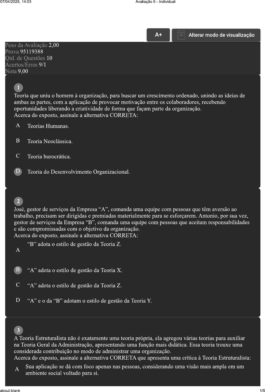 07/04/2025, 14:03 Avaliação Individual A+ Alterar modo de visualização Peso da Avaliação 2,00 Prova 95119388 Qtd. de Questões 10 Acertos/Erros 9/1 Nota 9,00 1 Teoria que uniu homem à organização, para buscar um crescimento ordenado, unindo as ideias de ambas as partes, com a aplicação de provocar motivação entre os colaboradores, recebendo oportunidades liberando a criatividade de forma que façam parte da organização. Acerca do exposto, assinale a alternativa CORRETA: A Teorias Humanas. B Teoria Neoclássica. C Teoria burocrática. D Teoria do Desenvolvimento Organizacional. 2 José, gestor de serviços da Empresa "A", comanda uma equipe com pessoas que têm aversão ao trabalho, precisam ser dirigidas e premiadas materialmente para se esforçarem. Antonio, por sua vez, gestor de serviços da Empresa "B". comanda uma equipe com pessoas que aceitam responsabilidades e são compromissadas com objetivo da organização. Acerca do exposto, assinale a alternativa CORRETA: "B" adota estilo de gestão da Teoria Z. A B "A" adota estilo de gestão da Teoria X. C "A" adota estilo de gestão da Teoria Z. D "A" e da "B" adotam estilo de gestão da Teoria Y. 3 A Teoria Estruturalista não é exatamente uma teoria própria, ela agregou várias teorias para auxiliar na Teoria Geral da Administração, apresentando uma função mais didática. Essa teoria trouxe uma considerada contribuição no modo de administrar uma organização. Acerca do exposto, assinale a alternativa CORRETA que apresenta uma crítica à Teoria Estruturalista: A Sua aplicação se dá com foco apenas nas pessoas, considerando uma visão mais ampla em um ambiente social voltado para about:blank 1/507/04/2025, 14:03 Avaliação Individual B Possui uma visão pequena em relação aos conflitos interpessoais; sua compreensão não necessita uma maior atenção. C Seus objetos de estudos foram realizados em apenas sindicatos, trata de organizações mais simples e análise de organizações informais. É considerada uma união entre várias abordagens das escolas, como a Clássica, Relações D Humanas e a Burocrática, conhecida como abordagem múltipla na tentativa de integração dos seus conceitos. 4 Na Teoria das Relações Humanas, um novo modelo de administração das pessoas passou a ter maior do que na Teoria Clássica, ou da autocracia que era a única forma de gerenciar os indivíduos a realizarem suas tarefas. Com uma abordagem mais de liderança do que os resultados foram alterando de forma satisfatória, referindo-se ao comportamento de liderar pessoas. Existem três estilos de lideranças: autoritária, liberal e democrática. Em relação aos três estilos de liderança, associe os itens, utilizando código a seguir: I- Autocrática. Liberal. III- Democrática. ( ) Nesse modelo de liderança, as pessoas criavam grupos de amizade e a forma de questionamentos e a distribuição das tarefas eram realizadas de forma aberta com comprometimento dos indivíduos sendo espontâneos, cordiais e francos. ) Modelo de liderança, geralmente de modo agressivo e Os trabalhos sempre estavam em forte tensão, a frustração era eminente nas pessoas, sem iniciativa e Nesse tipo de liderança, assim que "chefe" se ausentava, os indivíduos demonstravam sua agressividade, explosões de revoltas, causando até perda de produtividade. ( Modelo de liderança que tinha como objetivo a delegação dos trabalhos aos indivíduos, deixando-os totalmente à vontade na realização das tarefas e com pouco controle no ambiente de trabalho, no entanto, a desvantagem era que não havia participação de grupos e sim de indivíduos, tarefas feitas ao acaso e a perda de tempo provocava uma baixa produtividade e a falta de respeito com líder era constante. Assinale a alternativa que apresenta a sequência CORRETA: A I II III. B II III - I - II. D II I III. 5 Dentro do conjunto das teorias da Administração, temos a Abordagem Humanística, que surge ao final da década de 1930, contestando a forma como as pessoas eram vistas no ambiente organizacional na abordagem clássica, sobretudo por Taylor e Fayol. Uma das experiências marcantes dessa abordagem das relações humanas ocorreu em uma fábrica da Western Eletric, no estado de Chicago/USA, no bairro de Hawthorne, coordenada pelo psicólogo e sociólogo australiano Elton Mayo. Essa experiência de Hawthorne teve quatro fases principais que contribuíram decisivamente para entendimento da pessoa no contexto do mundo do trabalho. Quanto à dos estudos da segunda fase da Experiência de Hawthorne, conduzida por Mayo, assinale a alternativa CORRETA: about:blank 2/507/04/2025, 14:03 Avaliação Individual A ênfase foi nas entrevistas dos colaboradores, buscando novas melhorias no processo e A ambiente. B A foi no formato da supervisão, contrapondo simplesmente controle rígido com participação. C A ênfase foi na busca por novas alternativas de recompensas e benefícios que mantivessem as pessoas motivadas. D A foi nos aspectos da luminosidade das salas de produção. Revisar Conteúdo do Livro 6 Determinado estilo de liderança tinha como objetivo a delegação dos trabalhos aos indivíduos, deixando-os totalmente à vontade na realização das tarefas e com pouco controle no ambiente de trabalho. No entanto, a desvantagem era que não havia participação de grupos e sim de indivíduos, tarefas feitas ao acaso e a perda de tempo provocava uma baixa produtividade e a falta de respeito com líder era constante. Acerca do estilo de liderança a qual enunciado se refere, assinale a alternativa CORRETA: A Burocrática. B Democrática. Liberal. D Autocrática. 7 Com as teorias das Relações Humanas, a motivação passou a ser pesquisada e experienciada pelo fato de poder fazer com que desempenho dos colaboradores se mantivesse constante a partir da comunhão de seus objetivos pessoais com os organizacionais. Chiavenato (2011) desenvolve a ideia de um ciclo pelo qual as pessoas passam ao 