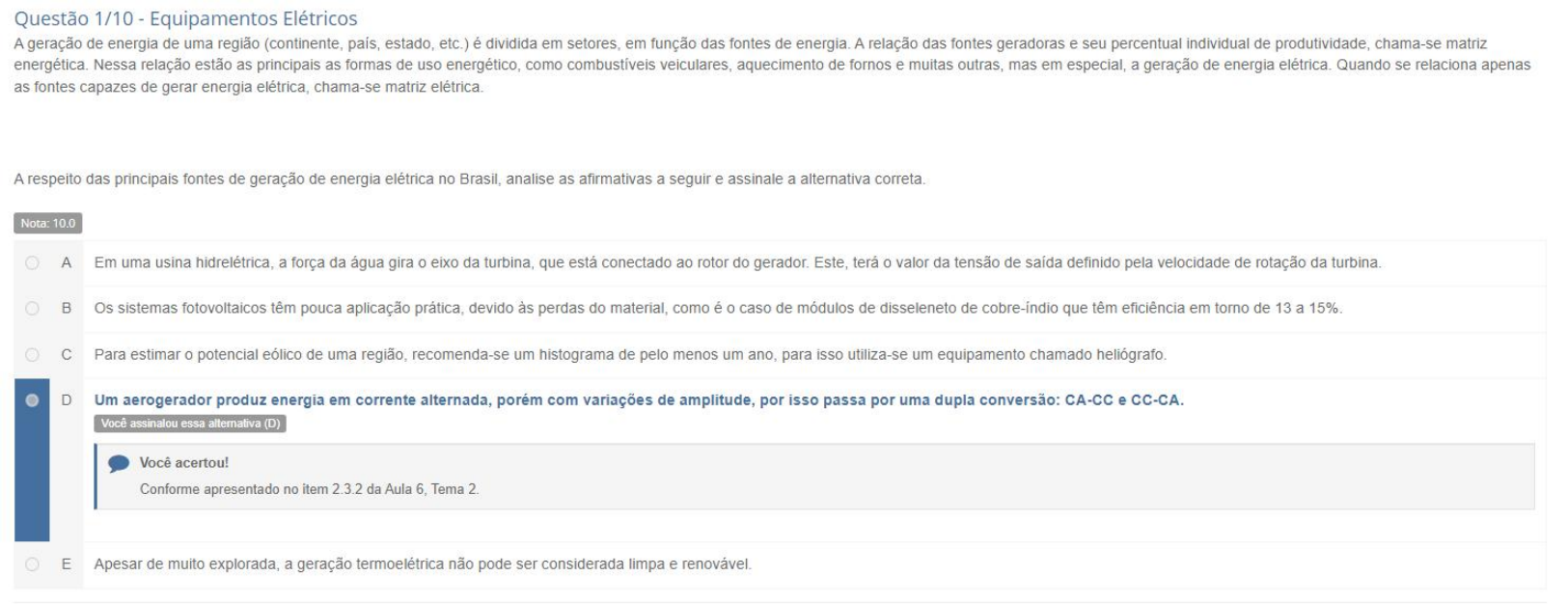 Questão 1/10 - Equipamentos Elétricos A geração de energia de uma região (continente, país, estado, etc.) é dividida em setores, em função das fontes de energia. A relação das fontes geradoras e seu percentual individual de produtividade, chama-se matriz energética. Nessa relação estão as principais as formas de uso como combustíveis veiculares, aquecimento de fornos e muitas outras, mas em especial, a geração de energia elétrica. Quando se relaciona apenas as fontes capazes de gerar energia elétrica, chama-se matriz elétrica. A respeito das principais fontes de geração de energia elétrica no Brasil, analise as afirmativas a seguir e assinale a alternativa correta. Nota: A Em uma usina hidrelétrica, a força da água gira o eixo da turbina, que está conectado ao rotor do gerador. Este, terá o valor da tensão de saída definido pela velocidade de rotação da turbina. B Os sistemas fotovoltaicos têm pouca aplicação prática, devido às perdas do material, como é o caso de módulos de disseleneto de que têm eficiência em torno de 13 a C Para estimar o potencial eólico de uma região, recomenda-se um histograma de pelo menos um ano, para isso utiliza-se um equipamento chamado heliógrafo. D Um aerogerador produz energia em corrente alternada, porém com variações de amplitude, por isso passa por uma dupla conversão: CA-CC e CC-CA. Você assinalou essa alternativa (D) Você acertou! Conforme apresentado no item 2.3.2 da Aula 6, Tema 2. E Apesar de muito explorada, a geração termoelétrica não pode ser considerada limpa eQuestão 2/10 - Equipamentos Elétricos As buchas de passagem são utilizadas para realizar a transição de um circuito entre dois ambientes, podendo ser esses ambientes, cubículos de alvenaria ou metálicos além de equipamentos como transformadores, por exemplo. A figura abaixo mostra três tipos de buchas de passagem, analise as afirmativas a seguir de acordo com tipo de bucha e o seu local de instalação. A - A bucha "A" é usada em casos especiais, nos quais é necessário separar dois ambientes que estejam expostos ao meio exterior, como barreiras corta-fogo usadas para proteger II - A bucha "B" é de larga aplicação em subestações abrigadas e em cabines primárias, quando é necessário que sistema de alimentação externo adentre ambiente abrigado. III - Em uma subestação abrigada de alvenaria, quando se deseja fazer a passagem entre cubículos adjacentes, utiliza-se a bucha que pode ser de porcelana ou resina IV - A bucha "B" também é utilizada para fazer a passagem do meio externo ao interior de um equipamento, como transformadores, disjuntores a óleo e religadores. Com base nas afirmativas, é correto o que se diz em: Nota: 10.0 A I, II e IV B II e III II III D II e IV Você assinalou essa alternativa (D) Você acertou! Conforme apresentado no item 3.2 da Aula Tema 3. Todas estão corretasQuestão 3/10 - Equipamentos Elétricos Os capacitores são dispositivos muito versáteis, atuando nos mais variados níveis, desde pequenos circuitos eletrônicos até nas altas tensões do setor elétrico. Um capacitor é basicamente constituído de um par placas condutoras, instaladas paralelamente e separadas por um material dielétrico. o seu funcionamento está baseado na capacidade de armazenar uma certa quantidade de energia no campo elétrico formado entre as placas. A respeito da aplicação de bancos de capacitores, analise as afirmativas a seguir. - o uso de capacitores para correção do fator de potência, baseia-se em cancelar efeito indutivo da carga, deixando sistema com comportamento resistivo. II - Os bancos em derivação ou bancos em derivância, são usados em geradores para que consigam maior potência ativa. III - Para as instalações de média tensão, entre 2,4 e 25 com potência reativa abaixo de 400 o uso de capacitores é inviável para correção do fator de potência. Com base nas afirmativas, é correto o que se diz em: Nota: 10.0 A Somente a I B Somente a III C D E lell Você assinalou essa (E) Você acertou! Conforme apresentado na Aula 4. Tema 4.Questão 4/10 - Equipamentos Elétricos Um sistema de subtransmissão é responsável por realizar o transporte da energia entre as subestações de subtransmissão e distribuição. Algumas indústrias de grande porte como estações de tratamento e bombeamento de água, são alimentadas diretamente com tensão de subtransmissão, entre 69 e 138 ou mais raramente em 34,5 A respeito das topologias para a ligação de um sistema de subtransmissão, analise as afirmativas a seguir. - A topologia radial recebe esse nome por manter os circuitos interligados em torno de um raio, de modo que exista uma redundância para a alimentação das subestações de distribuição. II - o sistema reticulado ou grid, é um sistema típico para regiões com alta densidade de cargas ou circuitos que não possam ser interrompidos. Por isso é ligado em circuitos independentes evitando possíveis falhas de circuitos adjacentes. III - No sistema radial com recurso, se ocorre um defeito na subestação de distribuição, uma chave de transferência permite reconectar o sistema a outro circuito de Com base nas afirmativas, é correto o que se diz em: Nota: 10.0 A II B II III C Somente a D Somente a III Você assinalou essa alternativa (D) Você acertou! Conforme apresentado na Aula 6. Tema 3. E Todas estão corretasQuestão 5/10 - Equipamentos Elétricos Quando ocorre um curto-circuito, a corrente pode ser tão elevada a ponto de danificar a isolação de cabos, transformadores e demais equipamentos, gerando um efeito cascata e provocando diversas consequências. Por isso os são dispositivos fundamentais em uma instalação, especialmente para sistemas a surtos. A respeito do elo analise as afirmativas a seguir e assinale a alternativa correta. Nota: 10.0 A elemento fusível é feito de um material condutor de alto ponto de fusão, que não sofre alterações mecânicas e el