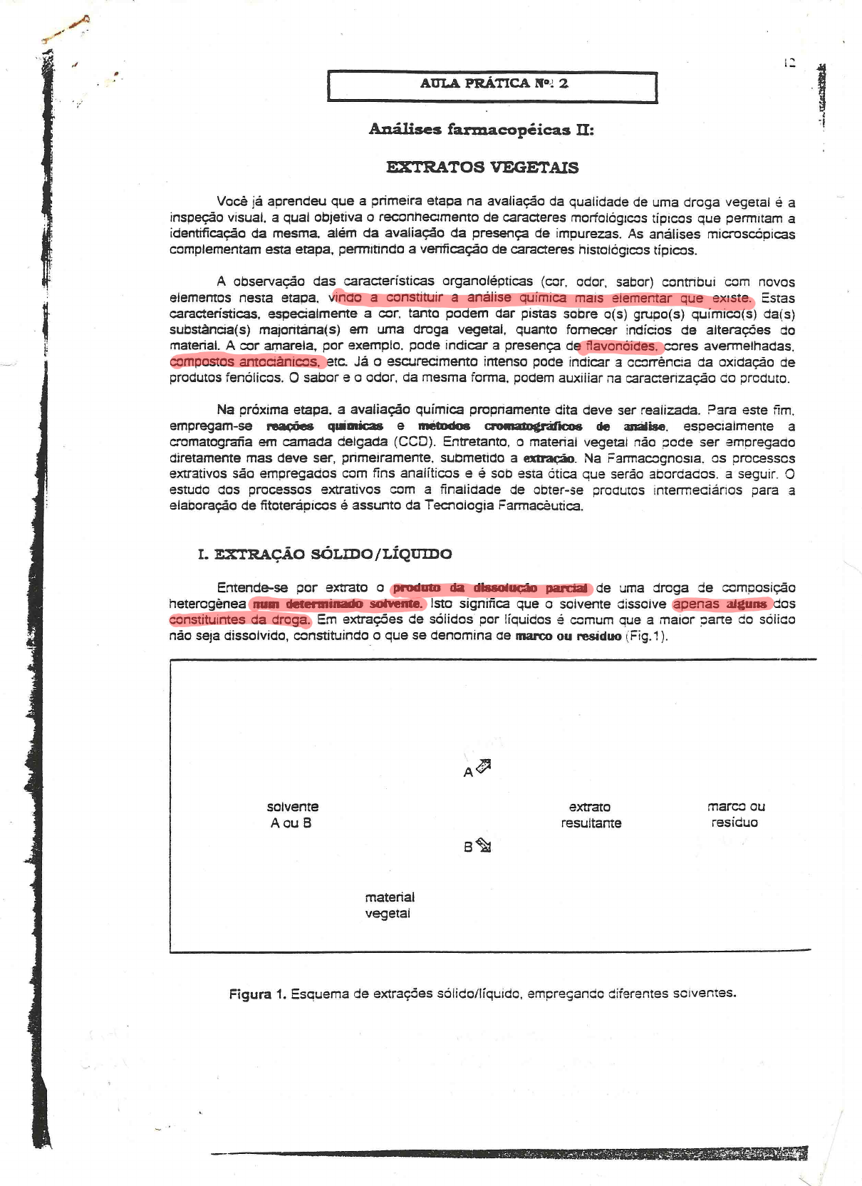 12 AULA PRÁTICA 2 Análises II: EXTRATOS VEGETAIS já aprendeu que a primeira etapa na avaliação da qualidade de uma droga vegetal é a inspeção visual, a qual objetiva o reconhecimento de caracteres morfológicos típicos que permitam a identificação da além da avaliação da presença de impurezas. As análises microscópicas complementam esta etapa, permitindo a verificação de caracteres histológicos típicos. A observação das características organolépticas odor, sabor) contribui com novos elementos nesta etapa, vindo a constituir a análise mais elementar que existe. Estas caracteristicas, especialmente a cor, tanto podem dar pistas sobre o(s) grupo(s) químico(s) da(s) em uma droga vegetal, quanto fornecer de alterações do material. A con amarela, por pode indicar a presença de cores avermelhadas, compostos etc. Já o escurecimento intenso pode indicar a da oxidação de produtos sabor e odor. da mesma podem auxiliar na caracterização do produto. Na próxima etapa. a avaliação química propriamente dita deve ser realizada. Para este empregam-se reações e métodos cromatograficos de analise. especialmente a em camada delgada (CCD). Entretanto, material vegetal não pode ser empregado diretamente mas deve ser, primeiramente, submetido a extração. Na as processos extrativos são empregados com fins e é sob esta ótica que serão abordados. a seguir. estudo dos processos extrativos com a finalidade de obter-se produtos intermeciários para elaboração de fitoterápicos é assunto da Tecnoiogia I. SÓLIDO/LÍQUIDO Entende-se por extrato o produto da dissolução parcial de uma droga de composição heterogènea num determinado Isto significa que o dissolve apenas alguns constituintes da droga. Em extrações de sólidos por líquidos é comum que a maior parte do sólico não seja dissolvido, constituindo o que se denomina de marco ou residuo A solvente extrato marco ou A ou B resultante B material Figura 1. Esquema de extrações empreçando diferentes sciventes.13 Fatores envolvidos na extração sólido/liquido Uma série de fatores interferem no processo extrativo e. por isso. devem ser levados em consideração, quando da sua definição. A) Fatores relacionados à droga vegetal Estado de divisão dos farmacógenos Na extração de o solvente deve embeben as células retirar delas (dissolver) as substâncias ativas ai existentes. Quanto a área de contato entre o material sólido e o líquido mais eficiente será processo. Por isso. é fragmentar e/ou material vegetal, anteriormente à extração. A estrutura histológica das diversas partes componentes de uma planta é bastante havendo como as raizes e as caules tecidos estão compactados (xilema), ao passo que em folhas e flores tecidos se apresentam com textura mais delicada. Como o poder de penetração dos solventes depende. entre autros da consistência dos tecidos que formam o material a extrair, quanto mais os tecidos. maior será de divisão necessário para se uma boa As para grau a tenuidade que mesmos devem apresentar (desde pó grosso até po grosso S dependendo da textura do farmacógeno em questão) antes de serem submetidos a ) 3 Interferência de algumas substâncias solubilidade de outras Numa droga vegetal por vezes. substâncias capazes de solubilizarem determinado solvente. podendo também ocorrer o oposto. os num carciotônicos da dedaleira são muito pouco solúveis na água. a presenca de saponinas (substâncias na pianta, permite a utilização da infusão aquosa como método de extração dos B) Fatores relacionados ao solvente Polaridade do solvente A polaridade indica separação de cargas dentro das moléculas (=caráter e portanto, compostos são altamente polares. No entanto. alguns compostos covalentes apresentam um certo caráter já que existe um certo dos de ligação dentro da molécula (origem da carga). na água, os elétrons de valência encontram-se muito mais tempo próximos ao núcleo do que do hidrogènio e portanto, a molécula apresenta uma carga negativa junto ao e outra positiva junto aos a água é um soivente Já, no hexano (um solvente os elétrons de valência encontram-se igualmente distribuídos entre os átomos que formam cada ligação, não ocorrendo separação de cargas dentro da molécula. A polaridade é um fator decisivo na seletividade de um solvente. É graças à seletividade que, tanto quanto pode-se conseguir extrair apenas as substâncias desejadas, mantendo no resíduo os compostos fisiologicamente inativos Conhecendo-se a do grupo de substâncias que se deseja extrair pode-se determinar qual solvente ou mistura de soiventes aproxima-se do ideal de seletividade para aquela extração. Em análises fitoquímicas, quando não se conhece previamente o conteúdodo material a ser analisado, costuma-se submeter o material vegetal a sucessivas extrações, com solventes de polaridade crescente, conseguindo-se, assim, uma extração fracionada. ande as diferentes frações contém compostos de polaridade também crescente. Alguns exemplos de solventes (em polaridade progressiva): hexano, tetracioreto de carbono, tolueno, éter acetato de etila. metanol, misturas Influência da tensão superficial A tensão superficial de um líquido é a força que impede que ele se espalhe sobre uma obrigando-o a ocupar a menor área possível e, determinando a formação de esféricas. Na extração de um sólido, especiaimente se for um material (como écaso dos materiais vegetais secos), é fundamental que o líquido penetre nos da estrutura sólida. Quanto menor for a tensão superficial do líquido extrator, maior será o seu poder de penetração e, de Para facilitar a extração de determinados pode-se adicionar, ao líquido um agente tensoativo que reduzirá a tensão superficial do extrator, aumentando a eficiência do processo. do pH A extração de determinadas substâncias pode ser influenciada pelo pH do líquido extrator exemplo clássico é a extr