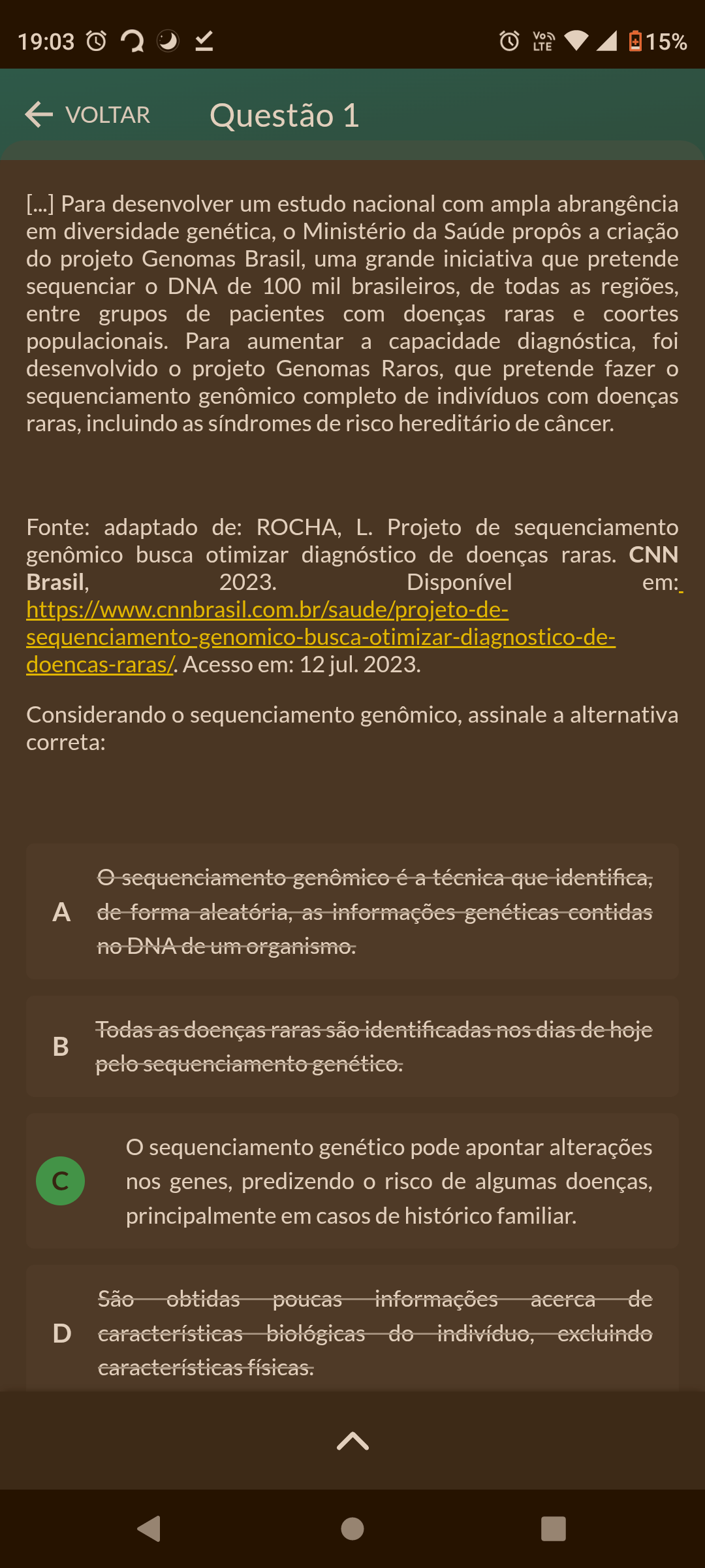 19:03 LTE 15% VOLTAR Questão 1 [...] Para desenvolver um estudo nacional com ampla abrangência em diversidade genética, O Ministério da Saúde propôs a criação do projeto Genomas Brasil, uma grande iniciativa que pretende sequenciar O DNA de 100 mil brasileiros, de todas as regiões, entre grupos de pacientes com doenças raras e coortes populacionais. Para aumentar a capacidade diagnóstica, foi desenvolvido O projeto Genomas Raros, que pretende fazer O sequenciamento genômico completo de indivíduos com doenças raras, incluindo as síndromes de risco hereditário de câncer. Fonte: adaptado de: ROCHA, L. Projeto de sequenciamento genômico busca otimizar diagnóstico de doenças raras. CNN Brasil, 2023. Disponível em: https://www.cnnbrasil.com.br/saude/projeto-de- Acesso em: 12 jul. 2023. Considerando O sequenciamento genômico, assinale a alternativa correta: e é a técnica que identifica, A de forma aleatória, as informações genéticas contidas um Todas as doenças raras são identificadas nos dias de hoje pelo sequenciamento genético. O sequenciamento genético pode apontar alterações C nos genes, predizendo O risco de algumas doenças, principalmente em casos de histórico familiar. São obtidas poucas informações acerca de D características biológicas do excluindo características físicas.