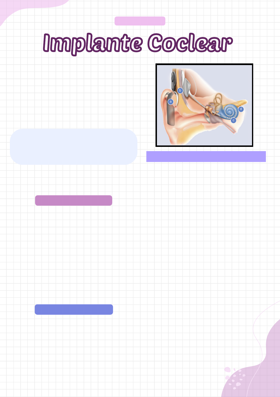 Implante Coclear Implante Coclear Referência Bibliografia: Tratado de Audiologia, segunda edição. Capítulo 43. @fonoarielcecon Esse permitiu que pessoas com deficiência auditiva de grau severo e/ou profundo consigam ter acesso ao mundo sonoro. O implante coclear é um dispositivo eletrônico desenvolvido para realizar a função das células ciliadas que estão danificadas ou ausentes, transformando a energia sonora em baixos níveis de corrente elétrica, de modo a proporcionar a estimulação elétrica das fibras remanescentes do nervo auditivo. O implante coclear é constituído de componente externo e componente interno: COMPONENTES INTERNOS A unidade interna é implantada cirurgicamente dentro o ouvido do paciente. Possui um feixe de eletrodos que será posicionado dentro da cóclea (órgão da audição com formato de caracol). Este feixe de eletrodos se conecta a um receptor (decodificador) que ficará localizado na região atrás da orelha, implantado por baixo da pele. Junto ao receptor fica a antena e o imã que servem para fixar a unidade externa e captar os sinais elétricos. COMPONENTES EXTERNOS A unidade externa é constituída por um processador de fala, uma antena transmissora e um microfone. A unidade externa é a parte do implante que fica aparente e pode ser de dois tipos: retroauricular ou tipo caixa. A antena transmissora possui um imã que serve para fixá-lo magneticamente junto a antena da unidade interna (que possui um imã). COMO FUNCIONA? O estímulo acústico é detectado pelo microfone e transmitido por um cabo ao processador de fala, o qual codifica os impulsos elétricos recebidos e envia a informação codificada para a antena transmissora. Um ímã é colocado em ambos os componentes externo e interno (antena transmissora e receptor estimulador) dessa forma faz com que os dois componentes, separados pela pele, possam ser conectados. O sinal codificado é transmitido através da pele (transcutânea) por radiofrequência. A informação é captada pelo receptor estimulador interno, que converte os códigos em sinais elétricos e libera os impulsos elétricos para os eletrodos intra-cocleares programados separadamente, transmitindo os impulsos elétricos para fibras nervosas específicas ao longo da cóclea. Sendo assim, após a interpretação da informação no cérebro o usuário de implante coclear poderá ser capaz de experimentar a sensação auditiva. Implante Coclear Implante Coclear @fonoarielcecon É um dispositivo que trás muitos benefícios ao usuário, inclusive em crianças com deficiência auditiva pré - lingual de grau severo e/ou profundo o implante coclear tem se tornado prática clínica padrão. A triagem auditiva neonatal, o diagnóstico da deficiência auditiva no primeiro ano de vida, a terapia fonoaudiológica fundamentada pela abordagem aurioral desde a identificação da deficiência auditiva e ao longo de todo o processo terapêutico são essenciais para a decisão do melhor tratamento para o paciente. Dependendo do grau de perda auditiva o implante coclear pode potencializar a aquisição da linguagem oral para as crianças. QUAL A MELHOR IDADE PARA FAZER A CIRURGIA DE IMPLANTE COCLEAR? Existem critérios de seleção de candidatos e indicação do implante coclear nas diferentes faixas etárias. Referência Bibliografia: Tratado de Audiologia, segunda edição. Capítulo 43. O período ideal para implantar uma criança com deficiência auditiva pré - lingual está dentro dos primeiros 3,5 anos de vida, quando as vias auditivas centrais apresentam plasticidade neuronal máxima, tendo uma diminuição expressiva desta plasticidade neuronal auditiva após os 7 anos de idade. Inclusive alguns estudos indicam que crianças implantadas antes de um ano de idade que estejam em programas terapêuticos com ênfase nas habilidades auditivas e na linguagem oral podem ter resultados melhores se comparadas às crianças que receberam implante coclear entre 12 e 18 meses de idade . CONDIÇÕES PARA IMPLANTE COCLEAR Condições para criançasCondições para crianças Deficiência auditiva neurossensorial de grau severo e ou profundo bilateral Idade mínima de 6 meses para deficiência auditiva profunda ou 18 meses para deficiência auditiva de grau severo Idade máxima de 36 meses para deficiência auditiva pré-lingual Permeabilidade coclear para a inserção dos eletrodos Limiares auditivos tonais iguais ou superiores a 70 dBNA a partir da frequência de 1000Hz Benefícios limitado das habilidades auditivas com o uso de AASI (aparelhos de amplificação sonora individual) Baixo índice de reconhecimento auditivo em testes de percepção da fala com amplificação Implante Coclear Implante Coclear @fonoarielcecon Deficiência auditiva sensorioneural de grau severo a profundo ou profundo pós-lingual bilateral. Referência Bibliografia: Tratado de Audiologia, segunda edição. Capítulo 43. Condições para Adultos Surdez pré-lingual com código linguístico oral estabelecido. Deficiência auditiva progressiva. Deficiência auditiva súbita, de preferência uma surdez inferior à metade do tempo de vida sem deficiência auditiva. limiares auditivos com aparelhos de amplificação sonora individual >60 dBNA nas frequências de fala, escore de percepção de falaauditivo resultando em uma sensação de audição. Na deficiência auditiva pré- lingual os resultados são melhores quando o implante coclear é realizado nos primeiros anos de vida. Resultados excelentes podem também ser obtidos em crianças e em adultos com deficiência auditiva pós -lingual, ou seja, quando a linguagem oral já está estabelecida. A permeabilidade coclear para a inserção cirúrgica dos eletrodos (ausência de fibrose ou de ossificação) deve ser comprovada antes da cirurgia. O diagnóstico por imagem dos temporais, realizado por meio da tomografia computadorizada e da ressonância magnética, possibilita a avaliação pré- - cirúrgica da cóclea, dos