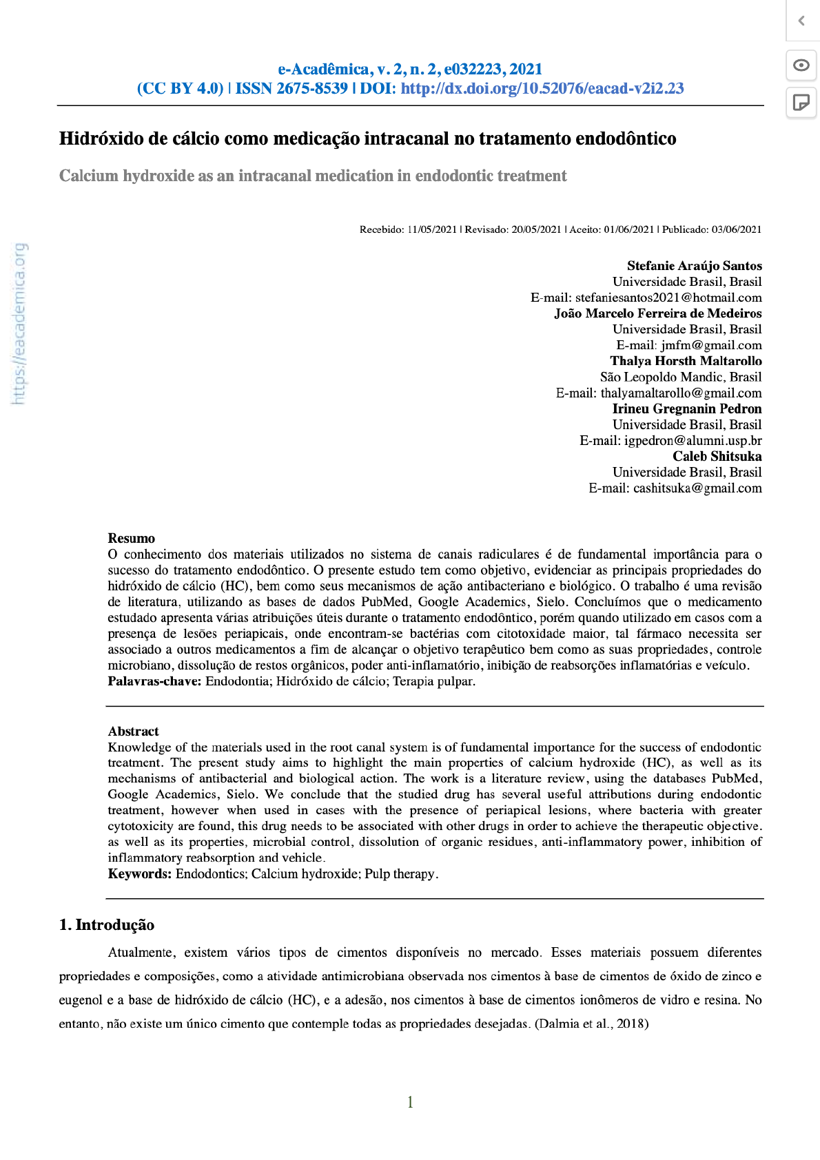 e-Acadêmica, V. 2, n. 2, e032223, 2021 (CC BY 4.0) ISSN 2675-8539 DOI: http://dx.doi.org/10.52076/eacad-v2i2.23 Hidróxido de cálcio como medicação intracanal no tratamento endodôntico Calcium hydroxide as an intracanal medication in endodontic treatment Recebido: 11/05/2021 Revisado: 20/05/2021 Aceito: 01/06/2021 Publicado: 03/06/2021 Stefanie Araújo Santos Universidade Brasil, Brasil E-mail: stefaniesantos2021@hotmail.com João Marcelo Ferreira de Medeiros Universidade Brasil, Brasil E-mail: jmfm@gmail.com Thalya Horsth Maltarollo São Leopoldo Mandic, Brasil E-mail: thalyamaltarollo@gmail.com Irineu Gregnanin Pedron Universidade Brasil, Brasil E-mail: igpedron@alumni.usp.br Caleb Shitsuka Universidade Brasil, Brasil E-mail: cashitsuka@gmail.com Resumo o conhecimento dos materiais utilizados no sistema de canais radiculares é de fundamental importância para o sucesso do tratamento endodôntico. o presente estudo tem como objetivo, evidenciar as principais propriedades do hidróxido de cálcio (HC), bem como seus mecanismos de ação antibacteriano e biológico. trabalho é uma revisão de literatura, utilizando as bases de dados PubMed, Google Academics, Sielo. Concluímos que o medicamento estudado apresenta várias atribuições úteis durante o tratamento endodôntico, porém quando utilizado em casos com a presença de lesões periapicais, onde encontram-se bactérias com citotoxidade maior, tal fármaco necessita ser associado a outros medicamentos a fim de alcançar o objetivo terapêutico bem como as suas propriedades, controle microbiano, dissolução de restos orgânicos, poder anti-inflamatório. inibição de reabsorções inflamatórias e veículo. Palavras-chave: Endodontia; Hidróxido de cálcio; Terapia pulpar. Abstract Knowledge of the materials used in the root canal system is of fundamental importance for the success of endodontic treatment. The present study aims to highlight the main properties of calcium hydroxide (HC), as well as its mechanisms of antibacterial and biological action. The work is a literature review, using the databases PubMed, Google Academics, Sielo. We conclude that the studied drug has several useful attributions during endodontic treatment, however when used in cases with the presence of periapical where bacteria with greater cytotoxicity are found, this drug needs to be associated with other drugs in order to achieve the therapeutic objective. as well as its properties, microbial control, dissolution of organic residues, anti-inflammatory power, inhibition of inflammatory reabsorption and vehicle. Keywords: Endodontics; Calcium hydroxide; Pulp therapy. 1. Introdução Atualmente, existem vários tipos de cimentos disponíveis no mercado. Esses materiais possuem diferentes propriedades e composições, como a atividade antimicrobiana observada nos cimentos à base de cimentos de óxido de zinco e eugenol e a base de hidróxido de cálcio (HC), e a adesão, nos cimentos à base de cimentos ionômeros de vidro e resina. No entanto, não existe um único cimento que contemple todas as propriedades desejadas. (Dalmia et al., 2018) 1e-Acadêmica, V. 2, n. 2, e032223, 2021 (CC BY 4.0) ISSN 2675-8539 DOI: http://dx.doi.org/10.52076/eacad-v2i2.23 o preparo biomecânico é um dos fatores mais importantes resultantes do sucesso da endodontia, visando à limpeza do canal radicular e contribuindo para a construção de um canal cirúrgico que esteja apto a receber a medicação intracanal, como a pasta de HC, no comprimento total do elemento a ser tratado, aumentando a eficácia antimicrobiana. A escolha da medicação intracanal nas terapias endodônticas pode ser um dos fatores que contribuem para que se obtenha o resultado esperado. o HC é o medicamento de escolha mais utilizado na endodontia, foi utilizado pela primeira vez em 1930 por Hermann, aumentando seu uso até os dias de hoje. (Gomes & Ferraz, 2002) Atualmente a odontologia se encontra em uma constante evolução, com a preocupação de reabilitar a função fisiológica e estética do paciente. uso de curativo intracanal à base de HC entre as sessões tem um papel importante na diminuição da população microbiana dentro dos canais radiculares. presente trabalho tem a finalidade de mostrar a eficiência do HC como medicação intracanal no tratamento endodôntico. 2. Metodologia o presente trabalho é uma revisão de literatura no qual foram utilizadas as bases de dados: PubMed, Google Academics, Sielo. Foram selecionados 29 trabalhos (artigos e livros), nos idiomas: português e inglês com recorte temporal de: 1997 a 2021. Para a seleção dos artigos, a procura foi feita a partir dos descritores: tratamento endodôntico, infecções endodônticas, lesões periapicais, lesões pulpares, medicação intracanal, hidróxido de cálcio, hidróxido de cálcio como medicação intracanal. 3. Revisão da Literatura Atualmente uma das grandes preocupações da endodontia é promover a completa eliminação dos microrganismos localizados nos canais radiculares e tecidos periapicais. (Oliveira et al, 2016). Estudos relatam que a permanência de microorganismos no interior do canal tem sido a principal causa do insucesso endodôntico. HC tem sido considerado a medicação intracanal de escolha por apresentar propriedades como: a) controle microbiano, b) dissolução de restos orgânicos, c) poder anti-inflamatório, d) inibição de reabsorções inflamatórias. (Lopes & Siqueira, 2010). tratamento endodôntico é composto por várias etapas, tais como: diagnóstico, reconhecimento da anatomia, instrumentação, irrigação, modelagem para a desinfecção, medicação intracanal, obturação, preservação e sucesso. Dentre as etapas da terapia endodôntica é realizado o preparo químico mecânico, com instrumentos endodôntico e soluções irrigadoras, tendo a função de promover à remoção mecânica dos microrganismos e seus tecidos degenerados. Após o preparo biomecânico o canal e