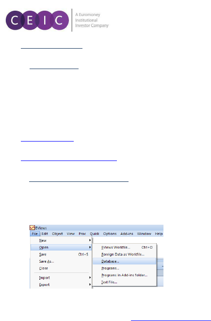 Page 1 of 6 EViews-CEIC Interface - Quick Start Guide 1. What You Will Need i. Any version of CEIC Data Manager (CDM). ii. Your CDM user name and password. iii. Your CEIC customer support to have enabled “CEIC EViews Interface” for you. iv. EViews 7 or above Enterprise Edition 1. v. EViews serial number. vi. CEIC-EViews Interface software 2 . 1. Install Eviews 7 or above Enterprise Edition from Eviews: http://www.eviews.com 2. Install CEIC-EViews Interface software from CEIC Downloads Area: http://www.ceicdata.com/client/downloads 2. Opening the CEIC Databases from EViews A. Via The User Interface ⇒ Open EViews ⇒ Select File > Open > Database ⇒ Select CEIC Database and enter your existing CDM user name and password (To save time opening the CEIC databases, see Using The EViews Database Registry below.) Page 2 of 6 Enter CDM user name and password B. Via The Command Window or a Program ⇒ Open EViews 7 ⇒ Type dbopen(t=ceic, u=username, p=password) Or, if the database is already in the Database Registry (see Using The EViews Database Registry below) ⇒ type dbopen my_database_alias Routes A and B will both open the query dialog window shown below. ⇒ Use Query-Select to perform a new query or Query AppendSelect to add to a current query. Query-Select and Query AppendSelect Page 3 of 6 The CEIC Data Tree and Search tool will open. Note the two tabs – Tree and Search. 3. Selecting Series and Importing to EViews A. Via The User Interface You will be familiar with the tree layout and basic search UI from CDM. ⇒ Use Tree and Search to locate and check the series you wish to use in EViews, and then click the Import to EViews button. The EViews database window will open. EViews Database Window ⇒ In the database window, use Ctrl to select series for export, and click the Export button. Page 4 of 6 Export Button You will be prompted for the EViews destination workfile (see right image). Note that if you have not subscribed to some of the series that you try to export, you will receive an error message. If a workfile is not currently open, you can create a new one. If the frequency of the series does not match the frequency of the destination workfile, EViews will perform the frequency conversion for you. Create EViews Workfile Note on CEIC series codes: In CDM data series are associated with a unique numeric code (e.g. 130004908), and sometimes also an alphabetic code (e.g. CABBA). When you import CEIC series to EViews the interface exposes a third code type starting in SR (e.g. sr3310915). You can see these codes in the Export Button image above. You will need to use these “sr” codes in EViews fetch commands. B. Via The Command Window or a Program To select series via the command window or a program you need to know their “sr” codes. ⇒ Type fetch “sr” code, e.g. fetch sr3310915 Page 5 of 6 In general the EViews command window, programs and other functionality can be used to avoid repetitive retrieval of CEIC series via Tree and Search. For example, create Q 2000 2012, dbopen CEIC and fetch sr3549979 will create a quarterly workfile, open the CEIC Database (if “CEIC” is your database alias) and fetch GDP Canada. 4. Support The EViews-CEIC Interface is software developed by CEIC Data. Your CEIC customer service representative is your support contact. Note that your CEIC support representative is not expert on the EViews 7 software itself. Note - Using The EViews Database Registry You can save time opening the CEIC databases by saving your CDM user name and password in the EViews Database Registry. ⇒ In EViews select Options > Database Registry ⇒ Click Add new entry, and then CEIC Database from the Database / File Type drop-down. Page 6 of 6 ⇒ Create a database alias, and fill in your CDM user-name and password. Click OK. ⇒ Click OK in the Database Registry window.