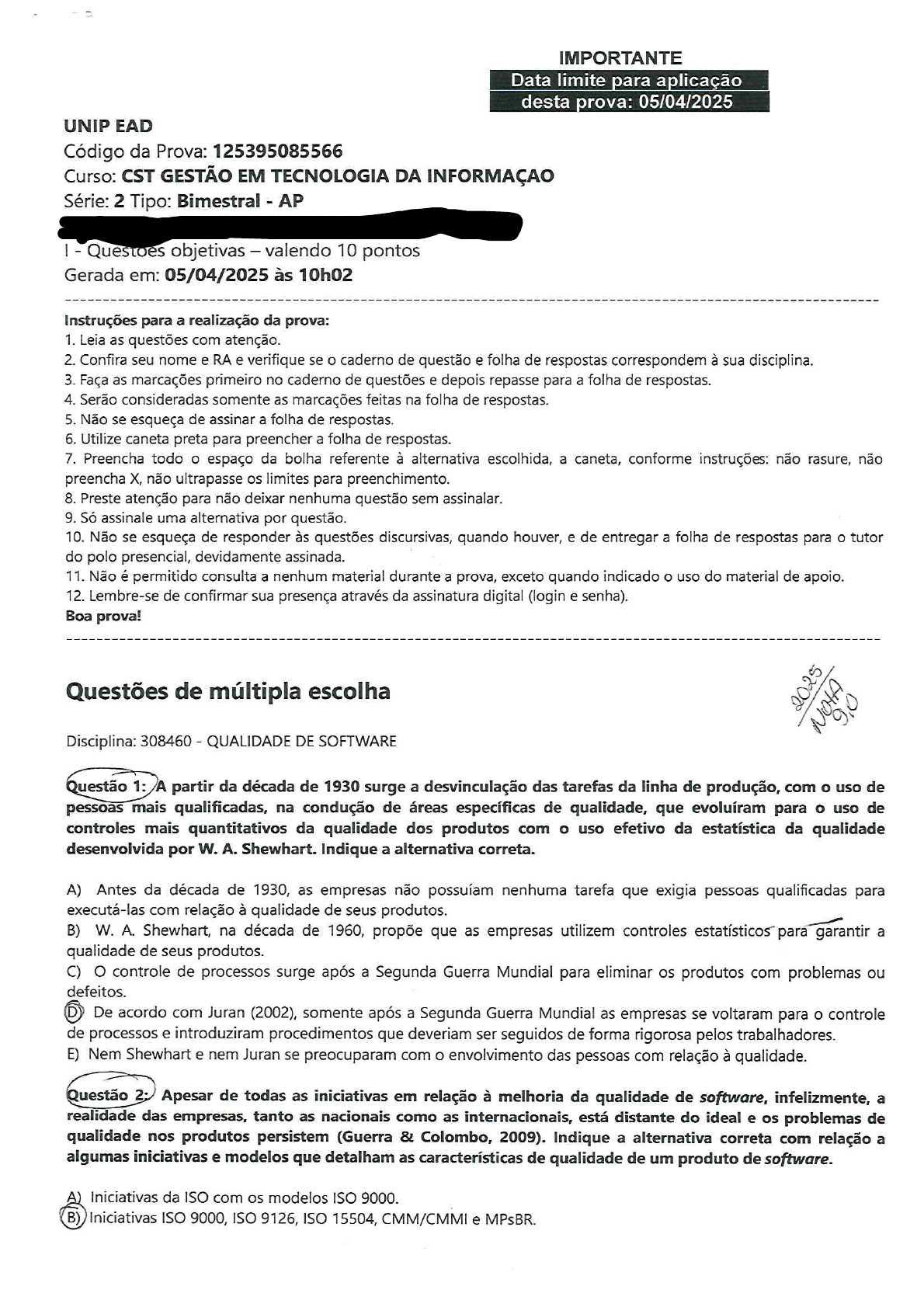IMPORTANTE Data limite para aplicação desta prova: 05/04/2025 UNIP EAD Código da Prova: 125395085566 Curso: CST GESTÃO EM TECNOLOGIA DA INFORMAÇÃO Série: 2 Tipo: Bimestral AP Questoes objetivas valendo 10 pontos Gerada em: 05/04/2025 às 10h02 Instruções para a realização da prova: 1. Leia as questões com atenção. 2. Confira seu nome e RA e verifique se o caderno de questão e folha de respostas correspondem à sua disciplina. 3. Faça as marcações primeiro no caderno de questões e depois repasse para a folha de respostas. 4. Serão consideradas somente as marcações feitas na folha de respostas. 5. Não se esqueça de assinar a folha de respostas. 6. Utilize caneta preta para preencher a folha de respostas. 7. Preencha todo o espaço da bolha referente à alternativa escolhida, a caneta, conforme instruções: não rasure, não preencha X, não ultrapasse os limites para preenchimento. 8. Preste atenção para não deixar nenhuma questão sem assinalar. 9. Só assinale uma alternativa por questão. 10. Não se esqueça de responder às questões discursivas, quando houver, e de entregar a folha de respostas para o tutor do polo presencial, devidamente assinada. 11. Não é permitido consulta a nenhum material durante a prova, exceto quando indicado o uso do material de apoio. 12. Lembre-se de confirmar sua presença através da assinatura digital (login e senha). Boa prova! Questões de múltipla escolha Disciplina: 308460 QUALIDADE DE SOFTWARE Questão 1: A partir da década de 1930 surge a desvinculação das tarefas da linha de produção, com o uso de pessoas mais qualificadas, na condução de áreas específicas de qualidade, que evoluíram para o uso de controles mais quantitativos da qualidade dos produtos com o uso efetivo da estatística da qualidade desenvolvida por W. Shewhart. Indique a alternativa correta. A) Antes da década de 1930, as empresas não possuíam nenhuma tarefa que exigia pessoas qualificadas para executá-las com relação à qualidade de seus produtos. B) W. A. Shewhart, na década de 1960, propõe que as empresas utilizem controles estatísticos para garantir a qualidade de seus produtos. C) controle de processos surge após a Segunda Guerra Mundial para eliminar os produtos com problemas ou defeitos. De acordo com Juran (2002), somente após a Segunda Guerra Mundial as empresas se voltaram para o controle de processos e introduziram procedimentos que deveriam ser seguidos de forma rigorosa pelos trabalhadores. E) Nem Shewhart e nem Juran se preocuparam com o envolvimento das pessoas com relação à qualidade. Questão 2: Apesar de todas as iniciativas em relação à melhoria da qualidade de software, infelizmente, a realidade das empresas, tanto as nacionais como as internacionais, está distante do ideal e os problemas de qualidade nos produtos persistem (Guerra & Colombo, 2009). Indique a alternativa correta com relação a algumas iniciativas e modelos que detalham as características de qualidade de um produto de software. A) Iniciativas da ISO com os modelos ISO 9000. B) Iniciativas ISO 9000, ISO 9126, ISO 15504, CMM/CMMI e MPsBR.C) Iniciativas americanas com os modelos ISO e MPsBR. D) Iniciativas brasileiras com os modelos CMM/CMMI, MPsBR e E) Iniciativas da ABNT, que adapta e padroniza os processos de software brasileiros. Questão Outra visão histórica da qualidade foi apresentada por Shiba em 1997, que mostra a evolução da qualidade total também, ao longo do tempo, mas com foco nos objetivos da qualidade. Indique a alternativa correta, cronologicamente, para a visão de Shiba. A) Adequação ao padrão, Adequação ao uso, Adequação ao custo e Adequação às necessidades latentes. B Adequação ao uso, Adequação ao padrão, Adequação ao custo e Adequação às necessidades latentes. C) Adequação ao padrão, Adequação ao uso, Adequação às latentes Adequação ao custo. D) Adequação ao padrão, Adequação ao custo, Adequação ao uso e Adequação às necessidades latentes. E) Adequação às necessidades, Adequação ao uso, Adequação ao custo e Adequação ao padrão. Questão 4: Um conjunto de atividades que assegura que todos os esforços serão feitos para garantir que os produtos de software tenham a qualidade desejada. Esta é a descrição de qual item a seguir? A) Garantia de qualidade de software SQA. B) Garantia de atendimento de software SCA. C) Garantia de qualidade de serviços. D) Garantia de levantamento de requisitos. E) Gerenciamento de projetos. Questão A norma ISO 12207 define Modelo de ciclo de vida, como: uma estrutura contendo processos, atividades e tarefas envolvidas no desenvolvimento, operação e manutenção de um produto de software, abrangendo a vida do sistema desde a definição de seus requisitos até o término de seu uso. Porque a vida de um sistema ou o ciclo de vida de um sistema vai desde a definição de suas funcionalidades (necessidades que serão atendidas para o cliente/usuário) até que o mesmo fique obsoleto e seja retirado de produção. Acerca dessas afirmativas, assinale a alternativa correta. A) A primeira é uma proposição verdadeira e a segunda é uma proposição falsa. B) As duas são proposições verdadeiras e a segunda não é uma justificativa correta da primeira. As duas são proposições verdadeiras e a segunda é uma justificativa correta da primeira. D) A primeira afirmativa é uma proposição falsa e a segunda é uma proposição verdadeira. E) As duas afirmativas são proposições falsas. Questão 6: De acordo com Côrtes e Chiossi (2001), hoje em dia, muita gente fala em qualidade de software, mas nem sempre as pessoas têm uma noção clara desse conceito. Pode-se considerar qualidade sob diferentes pontos de vista e, portanto, ter diferentes definições, sendo algumas das mais comuns apresentadas nas alternativas a seguir. Indique a alternativa correta, de acordo com os autores citados. A) Qualidade de Software é Software que ate