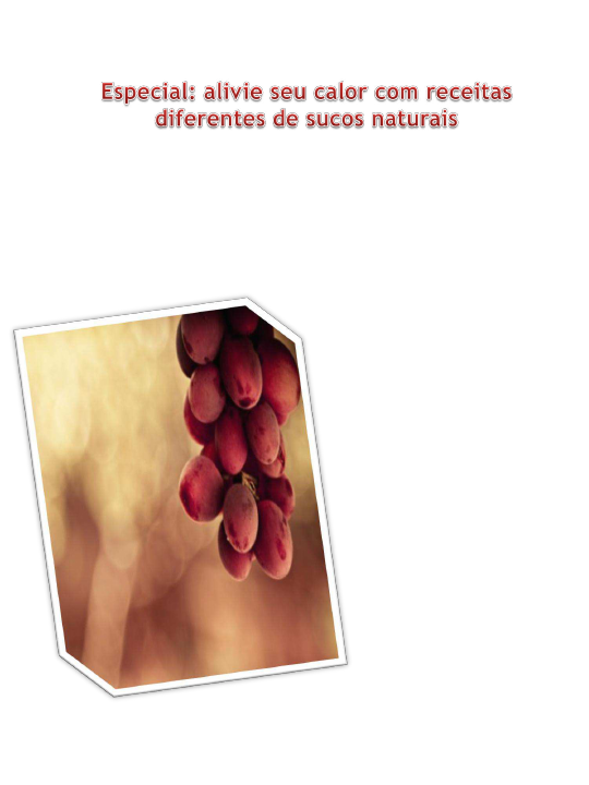 Através do projeto vivenciando valores na saúde o Colégio Adventista Ellen G. White com informações do site R7.com, fornecerão a você receitas de refrescos rápidos e saudáveis para os dias quentes. Confira, pois o festival de sucos acaba de começar... Bebida leva suco concentrado de uva e de maracujá, além do abacaxi Ingredientes: 500 ml de suco concentrado de maracujá Um litro de suco concentrado de uva Um abacaxi inteiro, cortado em cubos Dois copos de cubos de gelo Modo de preparo: Bata todos os ingredientes no liquidificador. Sirva em seguida. Suco leva beterraba e cenoura e é indicado antes de tomar sol Quem não quer ter a pele sempre firme e com o bronzeado em cima? Uma boa dica é experimentar o suco que promete trazer estes dois benefícios à pele. A receita é da loja Suco Bagaço. Ingredientes 2 a 3 colheres de beterraba picada em cubos ou ralada 1/2 cenoura média 700 ml de suco de laranja Açúcar a gosto ou adoçante Modo de preparo Bata tudo no liquidificador, coe e sirva. A aveia é misturada à água no liquidificador Ingredientes 1 xícara (chá) de água 2 colheres (sopa) de aveia 1 xícara (chá) de suco de goiaba 1 xícara (chá) de suco de laranja 2 colheres (sopa) de açúcar Modo de preparo Bata bem no liquidificador a água com a aveia. Despeje em uma jarra, acrescente o suco de goiaba, o suco de laranja, o açúcar e misture até que fique homogêneo. Sirva gelado. Suco especial de kiwi, melão e água de coco Bebidas refrescantes são um atrativo e tanto para aguentar dias quentes, principalmente se forem sucos de frutas. Além de saborosos, são uma alternativa saudável para o corpo. Ingredientes 1 kiwi 1 fatia média de melão 1 xícara (chá) de água de coco gelada 1 colher (sopa) de mel Folhas de hortelã a gosto Modo de preparo Descasque o kiwi, retire as sementes e pique-o. Faça o mesmo com o melão. Bata no liquidificador o kiwi, o melão, a água de coco, o mel e as folhas de hortelã até que fique homogêneo. Suco de Melancia com maracujá Ingredientes: Meio quilo de melancia Meia xícara de chá de açúcar Gelo a gosto Polpa de dois maracujás Modo de preparo: Descasque e retire os caroços da melancia. Bata-a no liquidificador juntamente com o açúcar e o gelo. Acrescente a polpa do maracujá e bata rapidamente para que não triture as sementes. Coe. Rendimento: dez copos Tempo de Preparo: dez minutos Suco de iogurte, abacaxi, hortelã e mel Ingredientes: Uma xícara de chá de iogurte natural Meia xícara de chá de abacaxi picado Três folhas de hortelã Uma colher de sopa de mel Duas pedras de gelo Modo de preparo: Bata no liquidificador o iogurte, o abacaxi, as folhas de hortelã, o mel e o gelo até que fique homogêneo. Rendimento: Uma porção Tempo de Preparo: Cinco minutos Suco de pêssego com laranja Quer uma idéia bem gostosa de suco para alegrar seu café da manhã? E para refrescar seu almoço, jantar e lanche da tarde? Aposte nesta receita com pêssegos e laranjas. O mais bacana dessa bebida é que, além de deliciosa, ela é feita com pêssegos em calda. Portanto, não depende da estação das frutas. Sem contar que ela é para lá de tropical... Tome nota! Ingredientes: Quatro pêssegos em calda Duas xícaras de chá de suco de laranja Meia xícara de chá de calda do pêssego Três pedras de gelo Modo de preparo: Bata no liquidificador o pêssego, o suco de laranja, a calda e o gelo até que fique homogêneo. Rendimento: quatro porções Tempo de Preparo: cinco minutos Suco de manga com morango Ingredientes: Duas xícaras de chá de manga picada Uma xícara e meia de chá de morangos picado Três xícaras de chá de água gelada Uma colher de sopa de açúcar Modo de preparo: Bata no liquidificador a manga, o morango, a água e o açúcar até que fique homogêneo. Rendimento: 5 porções Tempo de Preparo: 5 minutos Suco de laranja, kiwi, cenouras e folhas frescas de manjerião Após um período de doença, restaure a imunidade com este suco nutritivo. Ele leva laranja, rica em vitamina C, kiwi, que é rico em betacaroteno e vitamina C, cenoura e folhas de manjericão. E além de todos esses benefícios, o suco ainda é delicioso! Ingredientes Raminhos de manjericão fresco 2 laranjas em gomos (sem sementes) 2 kiwis cortados no sentido do comprimento 2 cenouras grandes sem as pontas cortadas em pedaços grossos Modo de preparo Enrole as folhas de manjericão nos gomos de laranja e passe pela centrífuga, alternando com as outras frutas. Mexa e beba imediatamente. Combata a TPM e o inchaço com suco de framboesa A framboesa é uma grande fonte de nutrientes; ela alivia as cólicas menstruais e diminui as oscilações de humor que ocorrem na TPM. A ameixa acrescenta ao suco altos níveis de vitamina C, que combate infecções, além de betacaroteno e manganês, que são importantes estimulantes da imunidade em períodos de estresse. Já o gengibre alivia as cólicas menstruais e a náusea, estimula a circulação e previne o entupimento das artérias, protegendo contra doenças cardíacas, que em geral estão relacionadas ao estresse. Ingredientes - 5 ameixas cortadas ao meio - 1 pedaço grande (4 cm) de gengibre fresco sem casca cortado em pedaços grandes - 25 framboesas Modo de preparo Passe os ingredientes pela centrífuga alternadamente. Mexa e beba em seguida. Suco de maçã, uva e romã Frutas ricas em fibras e com muita água são excelentes para auxiliar na perda de peso. Segundo pesquisas, a pectina – fibra solúvel presente na maçã – sacia o apetite mais que as outras fibras. O alto teor de água da uva ajuda na perda de peso porque a hidratação do organismo estimula o metabolismo: quanto mais acelerado o metabolismo, mais rapidamente as calorias são queimadas. As sementes da romã também contêm muitas fibras que moderam o apetite. Ingredientes - 4 maçãs cortadas em fatias grossas - 25 uvas sem sementes - 1 romã cortada ao meio Modo de preparo Passe a maçã e a uva pela centrífuga altern