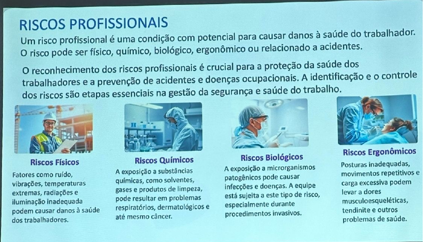 Bom, na sequência, a gente tem que ter um preparado. Antes do primeiro período da semana que a gente vai, é só voltar para o final passada, lembrando que nós temos cinco tipos de riscos profissionais a expor. Risco físico, risco químico, risco econômico, risco de acidentes e risco biológico. O risco biológico é o que mais nos assusta, mas existe uma série de situações que podem gerar problemas ou doenças ocupacionais. Existe também o risco físico-social, que é o risco do profissional, quando ele acende o trabalho, pode desenvolver uma série de condições. Estresse, etc. O hormônio, o profissional já expõe, isso vai carregar em relação ao exercício profissional. A gente vai prosseguir, como a gente falou na palestra passada, uma chamada já subiu para você, o risco físico e o risco econômico. Qual é o risco físico? Alguns tipos de condições, especificamente para a odontologia, o primeiro deles é nível. O nível excessivo pode gerar perda de habilidade auditiva, a gente vai ver isso na segunda parte da aula. O profissional saúde, em função dos diversos barulhos que ocorrem no ambulatório. Por exemplo, vocês estão ouvindo o ar condicionado funcionar, certo? É um tipo de ruído que vai provocando uma certa irritação no profissional e é um dos motivos que a gente tem na oncologia o profissional mais irritado. São esses barulhos constantes, mesmo de baixa intensidade. Se o barulho passar de 60 decibéis, já vai gerar desgaste com o ouvido interno. E a maioria dos nossos instrumentos produzem ruídos. E ruídos acima de 60 decibéis, como por exemplo a caneta de alta vocação, caneta de baixa vocação, o ultrassom, o compressor que existe no consultório, isso também vai gerar barulho. Por esse motivo o compressor deve ser colocado à distância do consultório, normalmente do lado de fora do consultório, se for possível, claro. Ou quando a gente trabalha dentro de um empreendimento, de uma sala comercial, normalmente se coloca o compressor dentro do banheiro. E ainda usa uma lavadora, ele tem um equipamento para abafar o som. E não é suficiente, só o fato de colocar em outro ambiente e abafar, então esse ruído vai causar estresse, e também cresce a audição. É muito comum o dentista testar e perder a audição do ouvido direito e o dentista ganhar e perder a audição do ouvido esquerdo. O que tem relação com essa questão da perda em função desse teste ou de outras? O que é que está mais perdido? A caneta de alta rotação. Então assim, a gente não tem como abandonar o uso da caneta de alta rotação, até existe caneta que produz menos barulho, existem canetas que não produz barulho nenhum, porém não está no nosso mercado a venda do dentista. Por quê? Porque não é barato. Não é barato no sentido da manutenção. As empresas que vendem as canetas de alta rotação precisam ficar com vocês no caso da venda, no caso da venda. Precisam dar manutenção, trocar rolamento da caneta, isso gera um ganho indireto da empresa ao roubo da venda. Então elas não colocam a caneta que é sem rolamento a venda, e aí vai sendo estressante por esse ruído que é isso. Além disso, nós sabemos que são pessoas e é importante usar a proteção auditiva, só que é quase impossível a gente usar a proteção auditiva. Normalmente são abafadores de som, porque a gente interage com o paciente. Então essa interação, quando a gente usa a proteção auditiva, a gente acaba perdendo a sensibilidade, a possibilidade de interagir com o paciente. Outro risco físico é a vibração, a vibração constante vai provocar desgaste físico, e a vibração também está na caneta de alta voltação, no ultrassom. Então essa tremedeira provocada pelo uso da caneta, vai provocar também lesões no corpo profissional. A radiação ionizante, para quem trabalha com a X, a gente tem claro que existe uma série de cuidados que vocês vão aprender ao longo do curso como evitar ou como se distanciar da radiação ionizante, usando barreiras inclusive, só que existe a radiação principal e existe a radiação secundária. Quem trabalha com a química de radiologia na área de radiologia, normalmente usa um dosímetro, um equipamento, parece um crachá comprimido no corpo profissional, e ele vai oculando a radiação secundária ao longo do dia, da semana, do mês, e ao final do mês é feita a molécula dessa radiação ocular. Gente, a radiação ela é muito boa, né? E por que que eu uso o dosímetro? Porque às vezes o equipamento pode estar descalibrado, pode estar tendo vazamento de radiação, o polimador, aquele cano que tem no equipamento da X pode não estar adaptado ao polimador, ele é feito de material polífero, de chumbo, para evitar que a radiação secundária se espalhe no dente. Então, se ele tiver uma rachadura, trigo, quebra, vazamento, a radiação se espalha com o microdente. Então, por isso que trabalha com radiologia, eu uso o dosímetro, né? Para verificar se existe alguma falha de radiação ocular. E as radiações, como eu mencionei antes, né? Eu uso o microdente. E essa luz aqui, ó, que é uma luz que causa também desgaste emocional, a gente sempre vai trabalhar no ambiente com esse tipo de luz, que é a luz florentada, né? Florentada. Flor incandescente. E ela provoca também radiação não ionizante, né? Então, ela vai gerar também desgaste físico dos profissionais que trabalham em ambientes que tem essa iluminação, não é a iluminação ocular. Em relação aos riscos químicos, alguns deles são propícios do construtor, outros não, né? Poeira é um deles. Então, a poeira presente no ambiente, principalmente em poeira de gesso, em trabalho com prótese, laboratório de prótese, vai fazer desgaste, corte em gesso. Essa poeira, ela fica suspensa porque deu ponto. E isso pode gerar também algumas alterações no processo respiratório. Então, pode manter partidas. Quando, na lasca, há problemas 