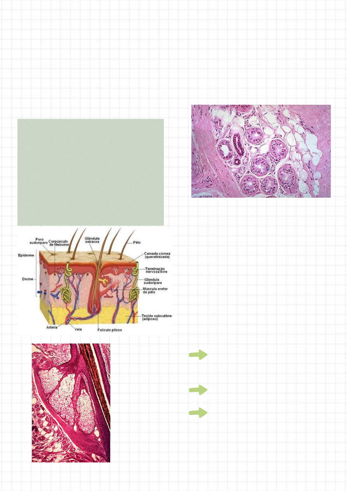 Pele: Histologia e Fisiologia da Pele TECIDO EPITELIAL: CÉLS. UNIDAS – FORMAM UMA BARREIRA RECOBRINDO O CORPO. MEMBRANA BASAL: INTERMEDIÁRIA – TECIDO EPITELIAL E TECIDO CONJUNTIVO. TECIDO CONJUNTIVO:POSSUI ABUNDANTE MATERIAL ( FIBRAS E GLICOSAMINOGLICANOS-SUBSTANCIA FUNDAMENTAL AMORFA). PELE MAIOR ÓRGÃO SENSORIAL DO CORPO. • CONTÉM 20% DO CONTEÚDO TOTAL DE ÁGUA DO ORGANISMO. • ESPESSURA: VARIÁVEL DE 0,5MM A 4 MM • RENOVAÇÃO SE DÁ A CADA 20 A 30 DIAS. • DERMATÓGLIFOS • MELANÓCITOS –MELANINA • SINTETIZA VITAMINA D • EPIDERME – ECTODÉRMICA • DERME – MESODÉRMICA EPIDERME: TECIDO EPITELIAL PAVIMENTOSO ESTRATIFICADO E QUERATINIZADO REVESTIMENTO. DERME: TECIDO CONJUNTIVO HIPODERME TECIDO CONJUNTIVO FROUXO. NÃO FAZ PARTE DA PELE. O PIGMENTO É MAIS FORTE NAS CÉLULAS DA CAMADA BASAL. O PIGMENTO (MELANINA) CONSISTE EM GRÂNULOS MUITO PEQUENOS, MARROM-ESCURO OU PRETOS, INTIMAMENTE AGRUPADOS, DENTRO DAS CÉLULAS. Epiderme 1- CAMADA CÓRNEA: PROTEÍNA A QUERATINA. IMPERMEABILIDADE E PROTEÇÃO. 2- CAMADA LÚCIDA 3- CAMADA GRANULOSA CAMADA PAPILAR: É DELGADA, CONSTITUÍDA POR TECIDO CONJUNTIVO FROUXO CAMADA RETICULAR: TECIDO CONJUNTIVO DENSO, É MAIS ESPESSA, CONTEM FEIXES DE FIBRAS COLÁGENAS. • ELASTICIDADE DA PELE – LINHAS DE FENDA 4- CAMADA ESPINHOSA 5- CAMADA GERMINATIVA OU BASAL: CÉLULAS BASAIS OU MELANÓCITOS. Derme RENOVAÇÃO DA EPIDERME 5 DIAS • 21 A 28 DIAS(DERME) • EPIDERME É AVASCULAR: É NUTRIDA POR DIFUSÃO Glandulas Sebáceas Anexos ANEXOS DA PELE 1- PÊLOS: FOLÍCULO PILOSO –DERME • FUNÇÃO: PROTEÇÃO • ATIVIDADE CÍCLICA, ENVELHECIMENTO- COLORAÇÃO DOS PÊLOS INEXISTEM NAS REGIÕES PALMAR E PLANTAR SEUS DUCTOS ABREM-SE NOS FOLÍCULOS PILOSOS SUA SECREÇÃO (SEBO) SERVE PARA LUBRIFICAR A PELE E OS PELOS2- GLÂNDULAS SEBÁCEAS: • ANEXAS AOS PÊLOS • SECREÇÃO: MISTURA COMPLEXA DE LIPÍDIOS (CONTÉM ÁCIDOS GRAXOS, COLESTEROL, TRIGLICÉRIDES). • FUNÇÃO: LUBRIFICAÇÃO E BACTERICIDA 3- GLÂNDULAS SUDORÍPARAS • VARIÁVEL – RAÇA NEGRA • SECREÇÃO: SECREÇÃO AQUOSA DE SÓDIO, URÉIA, ÁCIDO ÚRICO, SULFATOS E FOSFATOS. • FUNÇÃO: EQUILÍBRIO TÉRMICO, EQUILÍBRIO ELETROLÍTICO, E RESPIRAÇÃO DA PELE. 4- UNHAS • FORMAÇÃO: CAMADA CÓRNEA E LÚCIDA CONTÉM PLACA CÓRNEA.. • CRESCIMENTO: 1MM POR SEMANA. TEXTURA CÓRNEA APLICADAS SOBRE AS SUPERFÍCIES DORSAIS DAS FALANGES Glandulas Sudoríparas ENCONTRADAS EM QUASE TODA PELE CONSISTE NUM SIMPLES TUBO COM UMA PORÇÃO DILATADA DENOMINADA CORPO DA GL. NA PORÇÃO MAIS PROFUNDA O DUCTO É ENROLADO (ENOVELADO) ENQUANTO QUE NA SUPERFICIAL RETIFICADO SÃO ABUNDANTES NA PALMA DAS MÃOS E PLANTA DOS PÉS. 1 – AREOLAR, ADIPÓCITOS VOLUMOSOS E NUMEROSOS 2 – LAMELAR, HIPERPLASIA(AUMENTA A ESPESSURA COM GANHO DE PESO) • TECIDO CONJUNTIVO FROUXO OU ADIPOSO AO DENSO. FIXAR A PELE ÀS ESTRUTURAS SUBJACENTES (FÁSCIA MUSCULAR). • FUNÇÃO: 1- ISOLAMENTO TÉRMICO 2- MODELA A SUPERFÍCIE CORPORAL 3- ABSORÇÃO DE CHOQUES PREENCHIMENTO E AJUDA NA FIXAÇÃO DOS ÓRGÃOS Receptores Especializados da Pele TATÉIS: CORPÚSCULO DE PACCINI-PRESSÃO TATO LEVE-MEISSNER FIBRAS NERVOSAS AO REDOR DOS FOLÍCULOS PILOSOS. DOR: TERMINAÇÕES NERVOSAS LIVRES SITUADAS ABAIXO DA CAMADA PROFUNDA DA EPIDERME. FUNÇÕES DA PELE PROTEÇÃO: CAMADA CÓRNEA E MELANÓCITOS TERMOREGULAÇÃO: REDE VASCULAR CUTÂNEA E PELAS GLÂNDULAS SUDORÍPARAS PERCEPÇÀO: REDE NERVOSA CUTÂNEA Hipoderme CAMADAS: 5- VASOS E NERVOS VASOS E ARTÉRIAS E VASOS LINFÁTICOS - CAMADAS PAPILAR E RETICULAR E HIPODERME • FRIO: CORPÚSCULO DE KRAUSER • CALOR: CORPÚSCULO DE RUFFINE Tecido Conjuntivo: DERME E HIPODERME • TECIDO CONJUNTIVO DENSO IRREGULAR • FEIXES DE COLÁGENO FORMAM UMA TRAMA TRIDIMENCIONAL • IRREGULAR • RESISTENTE EM TODAS AS DIREÇÕES EX: PELE FIBRAS ELÁSTICAS • ESCLEROPROTEÍNA – ELASTINA • RESISTENTE • DISTENDE-SE BASTANTE • AMARELADA • RELACIONADAS AO ENVELHECIMENTO SECREÇÕES DAS GLÂNDULAS SEBÁCEAS, FUNÇÃO: LUBRIFICAÇÃO E PRECURSORA DA VITAMINA D RESPIRATÓRIA: RESPONSÁVEL POR 1/7 DA RESPIRAÇÃO TOTAL DO CORPO ABSORÇÃO: ADMINISTRAÇÃO PERCUTÂNEA DE MEDICAMENTOS