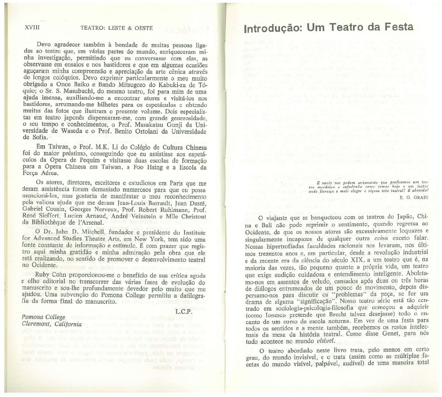 XVIII TEATRO: LESTE & OESTE Introdução: Um Teatro da Festa Devo agradecer também à bondade de muitas pessoas liga- das ao teatro que, em várias partes do mundo, enriqueceram mi- nha investigação, permitindo que eu conversasse com elas, as observasse em ensaios e nos bastidores e que em algumas ocasiões aguçaram minha compreensão e apreciação da arte cênica através de longos colóquios. Devo exprimir particularmente o meu muito obrigado a Onoe Baiko e Bando Mitsugoro do Kabuki-za de Tó- quio; o Sr. S. Masubuchi, do mesmo teatro, foi para mim de uma ajuda imensa, auxiliando-me a encontrar atores e visitá-los nos bastidores, arrumando-me bilhetes para os espetáculos e obtendo muitas das fotos que ilustram o presente volume. Dois especialis- tas em teatro japonês dispensaram-me, com grande generosidade, o seu tempo e conhecimentos, o Prof. Masakatsu Gunji da Uni- versidade de Waseda e o Prof. Benito Ortolani da Universidade de Sofia. Em Taiwan, o Prof. M.K. Li do Colégio de Cultura Chinesa foi do maior préstimo, conseguindo que eu assistisse aos espetá- culos da Ópera de Pequim e visitasse duas escolas de formação para a Ópera Chinesa em Taiwan, a Foo Hsing e a Escola da Força Os atores, diretores, escritores e estudiosos em Paris que me E nos pedem seriamente que prefiramos um tea- deram assistência foram demasiado numerosos para que eu possa tro mecânico enfadonho como temos hoje a um teatro onde a mais alegre e arte teatral? absurdo! mencioná-los, mas gostaria de manifestar o meu reconhecimento E. G. GRAIG pela valiosa ajuda que me deram Jean-Louis Barrault, Jean Dasté, Gabriel Cousin, Georges Nerveux, Prof. Robert Ruhlmann, Prof. Rene Sieffert, Lucien Arnaud, Veinstein e Mlle Christout o viajante que se banqueteou com os teatros do Japão, Chi- da Bibliothèque de l'Arsenal. na e Bali não pode reprimir o sentimento, quando regressa ao o Dr. John D. Mitchell, fundador e presidente do Institute Ocidente, de que os nossos atores são excessivamente loquazes e for Advanced Studies Theater Arts, em New York, tem sido uma singularmente incapazes de qualquer outra coisa exceto falar. fonte constante de informação e É com prazer que regis- Nossas hipertrofiadas faculdades racionais nos levaram, nos últi- tro aqui minha gratidão e minha admiração pela obra que ele mos trezentos anos e, em particular, desde a revolução industrial está realizando, no sentido de promover o desenvolvimento teatral e da recente era da ciência do século XIX, a um teatro que é, na no Ocidente. maioria das vezes, tão pequeno quanto a própria vida, um teatro Ruby Cohn proporcionou-me o benefício de sua crítica aguda que exige audição cuidadosa e entendimento inteligente. Aboleta- e olho editorial no transcorrer das várias fases de evolução do mo-nos em assentos de veludo, cansados após duas ou três horas manuscrito e sou-lhe profundamente devedor pelo muito me que de diálogos entremeados de um pouco de movimento, depois dis- ajudou. Uma subvenção do Pomona College permitiu a datilogra- persamo-nos para discutir os "problemas" da peça, se for um fia da forma final do manuscrito. drama de alguma "significação". Nosso teatro sério está tão cen- L.C.P. trado em sociologia-psicologia-filosofia que começou a adquirir Pomona College (como Ionesco pretende que Brecht talvez desejasse) todo o en- Claremont, California canto de um curso de escola noturna. Em vez de uma festa para todos os sentidos e a mente também, recebemos os restos intelec- tuais da mesa da história teatral. Como disse Genet, para nós tudo acontece no mundo visível. o teatro abordado neste livro trata, pelo menos em certo grau, do mundo invisível, e o trata (assim como as múltiplas fa- cetas do mundo visível, palpável, audível) de uma maneira total2 TEATRO: LESTE & OESTE INTRODUÇÃO: UM TEATRO DA FESTA 3 que o transmuta numa festa - uma festa que a platéia desfruta Nutridos com o diminuto mundo da televisão e da comédia maioria das ocasiões, não por minguadas duas ou três horas, doméstica nos filmes, perdemos contato com a vital e mas por cinco, seis ou sete horas e, por vezes, durante uma noite inteira. É um teatro do olho interno e do olho externo, ao mesmo experiência total do teatro das grandes épocas. Somos covarde- mente mimados, nossa mente amesquinhou-se; tornamo-nos muito tempo. Como os nossos grandes teatros do passado, é quer rea- lista quer teatralizado, quer ilusionista quer presentacional. Possui tímidos, demasiado preguiçosos para nos entregarmos confiante- mente, da cabeça às entranhas, a uma representação teatral de simultaneamente realidade e estilo. Uma razão para esta poliva- lência é o acento dado ao espetáculo, amiúde em detrimento das cinco ou seis horas. o que nos compraz pensar como sendo a vigorosa, completa e saudável experiência teatral dos gregos ou palavras; estamos acostumados ao inverso e tudo o mais nos pa- rece herético, visto que para nós o teatro é acima de tudo litera- elisabetanos, está além de nós. Talvez não haja mais do que um tura dramática. Trabalhando com imagens quer dizer, com grão de verdade na violenta asserção de Artaud, de que o nosso teatro hoje é um "teatro de idiotas, loucos, invertidos, gramáticos, poesia puramente teatral, existente no espaço e no tempo mais do que em algum sentido abstrato sobre a página impressa o antipoetas e positivistas, isto é, ocidentais" oriental pode apelar, de diferentes modos e em graus variá- Prisioneiros do eu, parecemos inaptos, em grau significativo veis, parte da caracterização humana que é refratária a de esforço artístico, a nos soltarmos das amarras que nos prendem estímulos conscientes e intelectuais. Evidentemente, nenhuma ge- à nossa existência quotidiana, incapazes de liberar o espírito que será válida para todos os teatros em discussão. o Ka- poderia permitir-nos ingressar em outras esferas, investigar ou buki, por exemplo, emprega com diál