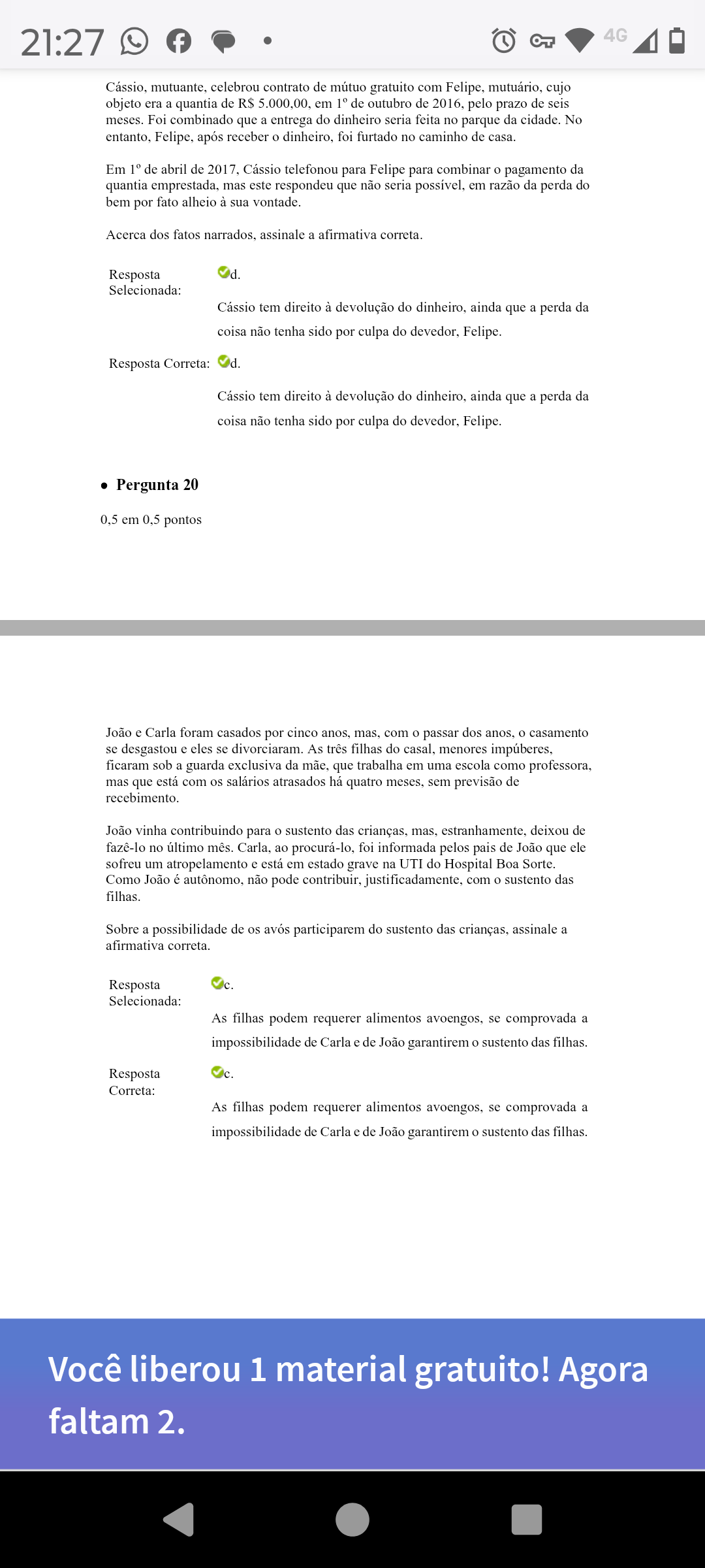 21:27 f 4G Cássio, mutuante, celebrou contrato de mútuo gratuito com Felipe, mutuário. cujo objeto era a quantia de R$ 5.000,00, em de outubro de 2016. pelo prazo de seis meses. Foi combinado que a entrega do dinheiro seria feita no parque da cidade. No entanto, Felipe, após receber o dinheiro. foi furtado no caminho de casa. Em 1° de abril de 2017. Cássio telefonou para Felipe para combinar o pagamento da quantia emprestada, mas este respondeu que não seria possível, em razão da perda do bem por fato alheio à sua vontade. Acerca dos fatos narrados, assinale a afirmativa correta. Resposta Selecionada: Cássio tem direito à devolução do dinheiro, ainda que a perda da coisa não tenha sido por culpa do devedor, Felipe. Resposta Correta: Cássio tem direito à devolução do dinheiro, ainda que a perda da coisa não tenha sido por culpa do devedor, Felipe. Pergunta 20 0,5 em pontos João e Carla foram casados por cinco anos. mas. com o passar dos anos, o casamento se desgastou e eles se divorciaram. As três filhas do casal. menores impúberes, ficaram sob a guarda exclusiva da que trabalha em uma escola como professora, mas que está com os salários atrasados há quatro meses. sem previsão de recebimento. João vinha contribuindo para o sustento das crianças, mas. estranhamente. deixou de fazê-lo no último mês. ao procurá-lo, foi informada pelos pais de João que ele sofreu um atropelamento e está em estado grave na UTI do Hospital Boa Sorte. Como João é autônomo. não pode contribuir, justificadamente, com o sustento das filhas. Sobre a possibilidade de os avós participarem do sustento das crianças, assinale a afirmativa correta. Resposta Selecionada: As filhas podem requerer alimentos avoengos, se comprovada a impossibilidade de Carla e de João garantirem o sustento das filhas. Resposta Correta: As filhas podem requerer alimentos avoengos, se comprovada a impossibilidade de Carla e de João garantirem o sustento das filhas. Você liberou 1 material gratuito! Agora faltam 2.