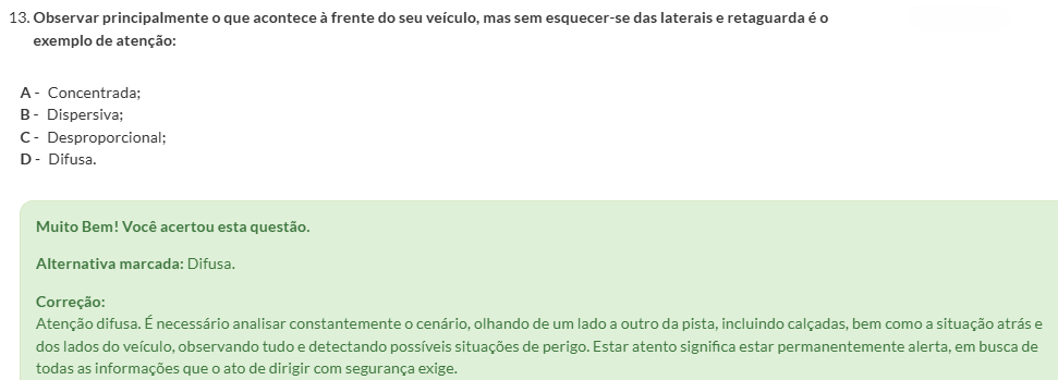 13. Observar principalmente o que acontece à frente do seu veículo, mas sem esquecer-se das laterais e retaguarda é exemplo de atenção: A - Concentrada; B Dispersiva; C - Desproporcional; Difusa. Muito Bem! Você acertou esta questão. Alternativa marcada: Difusa. Correção: Atenção difusa. É necessário analisar constantemente o olhando de um lado a outro da pista, incluindo bem como a situação e dos lados do veículo, observando tudo e detectando possíveis situações de perigo. Estar atento significa estar permanentemente alerta, em busca de todas as informações que o ato de dirigir com segurança exige.
