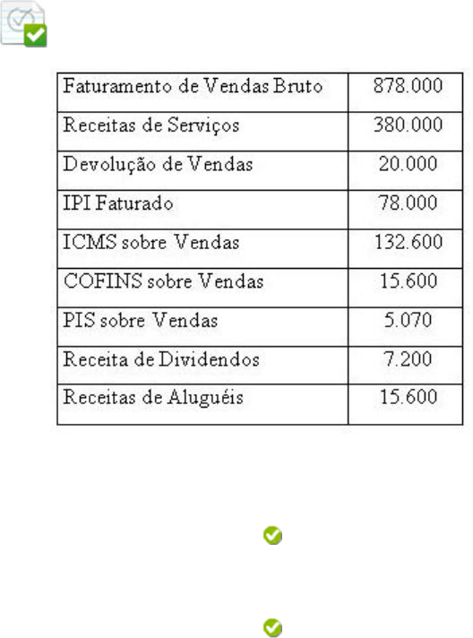 Pergunta 1 0,4 em 0,4 pontos Uma indústria de autopeças, constituída sob a forma de sociedade anônima que, além da atividade industrial também presta serviços de manutenção de peças, apresentou no mês de janeiro de X7 a seguinte Demonstração de Resultados: A empresa é optante pelo Lucro Real por Estimativa. Com base nas informações, a Base de Cálculo da Contribuição Social sobre o Lucro Líquido no mês de janeiro é de: Resposta Selecionada: a. $ 230.800. Respostas: a. $ 230.800. b. $ 199.600. c. $ 242.560. d. $ 215.200. e. $ 154.800. Comentário da resposta: Resposta: A Comentário: Contas Percentual Base de Cálculo Faturamento Bruto 878.000,00 Devolução de Vendas -20.000,00 IPI sobre Vendas -78.000,00 Vendas Líquidas 780.000,00 12% 93.600,00 Receitas de Serviços 380.000,00 32% 121.600,00 Receitas de Aluguéis 15.600,00 15.600,00 Base de Cálculo por Estimativa 230.800,00 A empresa pode fazer a opção pelo recolhimento tanto do imposto de renda como da contribuição social sobre o lucro líquido, utilizando os percentuais aplicáveis sobre as receitas tributáveis e fazendo o ajuste por ocasião do levantamento do Balanço Patrimonial Anual. Os percentuais aplicáveis para determinação da base de cálculo são os mesmos utilizados pelas empresas tributadas pelo lucro presumido. Pergunta 2 0,4 em 0,4 pontos Se considerarmos, em determinada empresa, os elementos abaixo indicados podemos afirmar que a base de cálculo para recolhimento da CSSL, por estimativa, é de: Resposta Selecionada: e. $ 524.000. Respostas: a. $ 192.000. b. $ 444.000. c. $ 252.000. d. $ 440.000. e. $ 524.000. Comentário da resposta: Resposta: E Comentário: Contas Percentual Base de Cálculo Faturamento Bruto 2.100.000,00 12% 252.000,00 Receita de Serviços 600.000,00 32% 192.000,00 Lucro na Venda de Imóvel 80.000,00 80.000,00 Base de Cálculo da CSLL 524.000,00 A empresa pode fazer a opção pelo recolhimento tanto do imposto de renda como da contribuição social sobre o lucro líquido, utilizando os percentuais aplicáveis sobre as receitas tributáveis e fazendo o ajuste por ocasião do levantamento do Balanço Patrimonial Anual. Os percentuais aplicáveis para determinação da base de cálculo são os mesmos utilizados pelas empresas tributadas pelo lucro presumido. Pergunta 3 0,4 em 0,4 pontos Considere as seguintes informações, em 30.06.X1 de uma empresa tributada pela apuração Trimestral do Lucro Real: Lucro Líquido antes do Imposto de Renda: ............$ 200.000 Resultado Positivo de Equivalência Patrimonial: ...$ 20.000 Provisões para Ajustes a Valores de Mercado: .......$ 50.000 Despesas de Depreciação de imóveis alugados: ....$ 80.000 A Base de Cálculo do IR, ao final do trimestre, com base nos dados acima será: Resposta Selecionada: b. $ 310.000,00 Respostas: a. $ 200.000,00 b. $ 310.000,00 c. $ 217.000,00 d. $ 230.000,00 e. $ 161.000,00 Comentário da resposta: Resposta: B Comentário: Demonstração do Lucro Real Lucro Líquido 200.000,00 Adições Provisões para ajustes ao valor de mercado 50.000,00 Despesas de Depreciação com Imóveis Alugados 80.000,00 Dividendos Recebidos (20.000,00) Lucro Real Antes 310.000,00 Pergunta 4 0,4 em 0,4 pontos Considere que uma empresa tenha optado pela apuração do Imposto de Renda e da Contribuição Social sobre o Lucro Líquido pelo Lucro Real anual com recolhimentos mensais por estimativa. Ao final de cada exercício, a empresa deve: I. fazer a apuração do lucro real no Livro de Apuração do Lucro Real, no qual procederá às adições e exclusões ao lucro ou prejuízo contábil, bem como as compensações de prejuízos fiscais anteriores, respeitado o limite de 30%. II. calcular e contabilizar o valor do Imposto de Renda e Contribuição Social sobre o Lucro Líquido, observado as alíquotas vigentes para cada tributo. Para o Imposto de Renda de 15% mais Adicional de 10% que ultrapassar $ 240.000,00 no ano ou $ 20.000,00 mensais. III. compensar o valor do Imposto de Renda e Contribuição Social sobre o Lucro pago por pago mensalmente com base nos balancetes mensais. (Estimativa Monitorada)l. Está correto o afirmado em Resposta Selecionada: d. I, II e III. Respostas: a. I, somente. b. I e II. c. II e III. d. I, II e III. e. I e III. Comentário da resposta: Resposta: D Comentário: Todas as afirmativas estão corretas. Quando a empresa faz a escolha da tributação com base no Balanço Patrimonial levantado anualmente, procederá todas as adições e exclusões ocorridas nos meses de janeiro a dezembro, momento que recolhia os impostos com base nos balancetes mensais (estimativa monitorada). Determinado o Lucro Real Anual, a empresa calculará o IRPJ a razão de 15% e o adicional de 10% sobre o valor que exceder o Lucro Real em $ 240.000, 00. Compensando as antecipações feitas ou pagas por estimativas dos meses de janeiro a novembro. Pergunta 5 0,4 em 0,4 pontos A empresa AMÉRICA S.A. tributada pelo Imposto de Renda e Contribuição Social sobre o Lucro Líquido pelo Lucro Real Trimestral. No último trimestre obteve-se as seguintes informações: • Lucro Líquido do exercício: $ 70.000 • Dentre as despesas estão escriturados os seguintes valores: • Depreciação de imóveis alugados: $ 2.000 • Provisão para Contingências (enchentes que poderão ocorrer no mês de março de exercício seguinte); $ 18.000. • Perdas decorrentes de créditos com clientes não liquidados que excederam aos permitidos por Lei: $ 8.000. • Dividendos de participações societárias: $ 30.000 • O valor de Prejuízos Fiscais compensáveis alcança a importância de $ 40.000 De acordo com as informações, o IR sobre o lucro Líquido a Pagar, será: Resposta Selecionada: e. $ 6.300 Respostas: a. $ 5.040 b. $ 3.690 c. $ 3.528 d. $ 5.880 e. $ 6.300 Comentário da resposta: Resposta: E Comentário: Demonstração do Lucro Real Lucro Líquido 70.000,00 Adições Provisões para Contingências 18.000,00 Despesas de Deprec