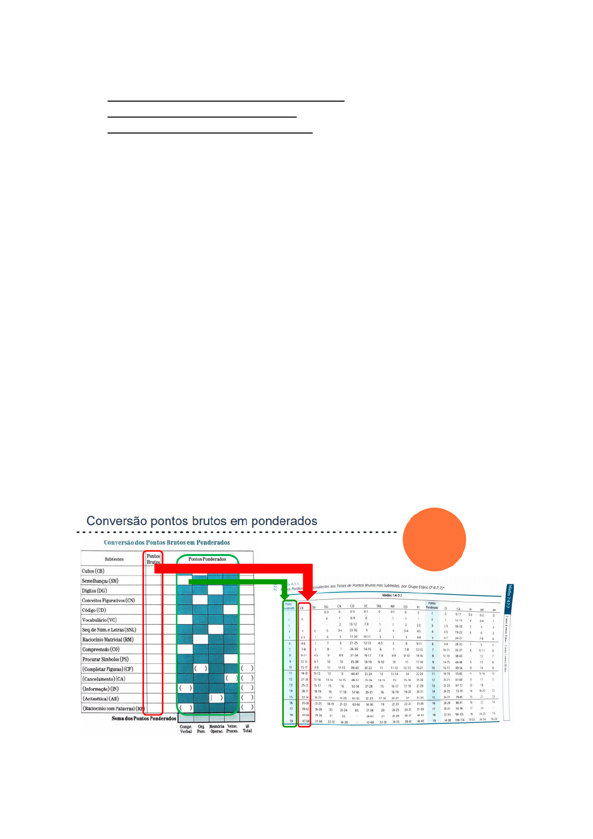 NP2 - TAI Técnicas de Avaliação da Inteligência ● Classificação (ponto ponderado e composto) ● Objetivo de cada subteste do WISC ● Saber a definição do aspecto cognitivo Ordem p/ preenchimento dos dados na prova: 1. Preencher tudo da tabela (de forma horizontal - 1º pontos brutos e depois pontos ponderados) 2. Somar os pontos ponderados respectivos de cada índice (ñ somar os subtestes suplementares - só se for para substituir o principal) 3. Somar pontos ponderados para obter o QI Total - para calcular o QIT só pode ter 2 substituições no WISC todo 4. Preencher o gráfico de colunas do perfil dos pontos ponderados (prestar atenção pois está separado por cada subteste do índice) 5. Preencher o gráfico de colunas do perfil dos pontos compostos (prestar atenção pois está separado por índice) 6. Fazer a classificação de cada subteste 7. Fazer a classificação dos índices 8. Fazer análise descritiva… pontos negativos (prejuízos) e pontos positivos (facilidades) 9. Descrever o que cada subteste avalia Tabelas que já estarão na prova: ● Ponto ponderado (1 tabela) ● Ponto composto de cada índice (5 tabelas) ● Interpretação ICV - ÍNDICE DE COMPREENSÃO VERBAL ● habilidades verbais ● raciocínio ● compreensão e conceitualização ● inteligência cristalizada ● conhecimento prévio adquirido à partir de situações culturais e educacionais 1. SM - SEMELHANÇAS ● raciocínio verbal fluido ● formação de conceitos ● envolve memória, compreensão oral, capacidade de distinguir o essencial do não essencial ● raciocínio lógico abstrato mediante estímulos verbais ● pensamento abstrato 2. VC - VOCABULÁRIO ● conhecimento de palavras ● formação de conceitos verbais ● nível de conhecimento ● habilidade de aprendizagem ● memória de longo prazo ● nível de desenvolvimento linguístico ● avalia memória semântica: ideias e conceitos que não são extraídos da experiência pessoal 3. CO - COMPREENSÃO ● raciocínio verbal e conceituação ● compreensão verbal e expressão ● habilidades para avaliar e utilizar experiências anteriores ● envolve adequação social, julgamento, maturidade e bom senso ● normas e regras sociais ● capacidade para escolher qual é a conduta socialmente esperada 4. (IN) - INFORMAÇÃO ● capacidade de adquirir, reter e recuperar conhecimentos fatuais ● envolve inteligência cristalizada, memória de longo prazo, compreensão e expressão verbal ● conteúdos escolares ● aprendizagem formal (escolar) ● conhecimentos adquiridos pela educação informal, através de experiências culturais ● base geral do conhecimento 5. (RP) - RACIOCÍNIO C/ PALAVRAS ● compreensão verbal ● abstrações verbais ● conhecimento do assunto ● capacidade de integrar e sintetizar vários tipos de informações ● conhecimento e compreensão de vocabulário ● memória semântica ● linguagem compreensiva e expressiva ● conhecimento lexical IOP - ÍNDICE DE ORGANIZAÇÃO PERCEPTUAL ● raciocínio fluido ● processamento e organização visoespacial ● operações mentais de raciocínio lógico ● conceitos abstratos e relações complexas entre estímulos ● manipulação mental de objetos (comparar tamanhos, distâncias, etc) 6. CB - CUBOS ● habilidade de analisar e sintetizar estímulos visuais abstratos ● envolve conceitos não -verbais, percepção visual e organização, coordenação visual e motora, habilidade de separar figura e fundo por estímulos visuais ● processamento visual ● habilidade visoespacial ● velocidade de processamento ● condição psicomotora 7. CN - CONCEITOS FIGURATIVOS ● nível de abstração e a habilidade de raciocinar de forma não-verbal, fazendo montagens conforme uma classe específica ● é similar com Semelhanças, mas aqui a abstração deve ser feita a partir de estímulos visuais ● raciocínio fluido e abstrato ● organização perceptual ● atenção / função executiva 8. RM - RACIOCÍNIO MATRICIAL ● fluidez da inteligência ● estimativa realista da habilidade intelectual de modo geral ● percepção visual 9. (CF) - COMPLETAR FIGURAS ● percepção visual e organização ● concentração e reconhecimento visual de detalhes essenciais dos diferentes objetos ● atenção / função executiva IMO - ÍNDICE DE MEMÓRIA OPERACIONAL ● memória operacional: capacidade de reter informações por curto período de tempo e manipulá-las ● atenção e concentração ● dificuldade em seguir instruções ● dificuldade em cálculos ● dificuldade em absorver informações dadas por meio de leitura 10. DG - DÍGITOS ● memória de curto prazo ● sequenciamento ● atenção ● concentração ● percepção auditiva ● atenção (seletiva) 11. SNL - SEQUÊNCIA DE NÚMEROS E LETRAS ● capacidade de sequenciamento ● agilidade mental ● memória de curto prazo ● memória operacional ● velocidade de processamento ● percepção auditiva ● conhecimento de números e letras ● atenção 12. (AR) - ARITMÉTICA ● agilidade mental ● concentração ● atenção ● memória de curto e longo prazo ● habilidade de raciocínio numérico ● sequenciamento ● fluidez de raciocínio ● lógica ● processamento auditivo ● atenção ● raciocínio matemático IVP - ÍNDICE DE VELOCIDADE DE PROCESSAMENTO ● habilidades visografomotoras ● atenção ● memória de curto prazo ● coordenação visomotora ● velocidade de processamento ● concentração ● trabalhar sob pressão do tempo 13. CD - CÓDIGOS ● velocidade de processamento ● memória de curto prazo ● aprendizado ● percepção visual ● coordenação visual e motora ● atenção seletiva ● processamento visual e sequencial 14. PS - PROCURAR SÍMBOLOS ● velocidade de processamento ● memória visual de curto prazo ● discriminação visual ● concentração ● habilidade de planejar e aprender 15. (CA) - CANCELAMENTO 
