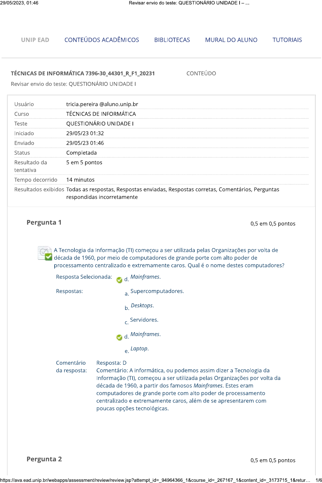 29/05/2023, 01:46 Revisar envio do teste: QUESTIONÁRIO UNIDADE UNIP EAD CONTEÚDOS ACADÊMICOS BIBLIOTECAS MURAL DO ALUNO TUTORIAIS TÉCNICAS DE INFORMÁTICA 7396-30_44301_R_F1_20231 CONTEÚDO Revisar envio do teste: QUESTIONÁRIO UNIDADE Usuário ricia.pereira@aluno.unip.br Curso TÉCNICAS DE INFORMÁTICA Teste QUESTIONÁRIO UNIDADE Iniciado 29/05/23 01:32 Enviado 29/05/23 01:46 Status Completada Resultado da 5 em 5 pontos tentativa Tempo decorrido 14 minutos Resultados exibidos Todas as respostas, Respostas enviadas, Respostas corretas, Comentários, Perguntas respondidas incorretamente Pergunta 1 0,5 em 0,5 pontos A Tecnologia da Informação (TI) começou a ser utilizada pelas Organizações por volta de década de 1960, por meio de computadores de grande porte com alto poder de processamento centralizado e extremamente caros. Qual é o nome destes computadores? Resposta Selecionada: d. Mainframes. Respostas: Supercomputadores. a. b. Desktops. C. Servidores. d. Mainframes. e. Laptop. Comentário Resposta: D da resposta: Comentário: A informática, ou podemos assim dizer a Tecnologia da Informação (TI), começou a ser utilizada pelas Organizações por volta da década de 1960, a partir dos famosos Mainframes. Estes eram computadores de grande porte com alto poder de processamento centralizado e extremamente caros, além de se apresentarem com poucas opções tecnológicas. Pergunta 2 0,5 em 0,5 pontos 1/629/05/2023, 01:46 Revisar envio do teste: QUESTIONÁRIO UNIDADE A ferramenta do Google que apresenta por meio de gráficos e filtros a frequência em que determinados termos e palavras são procurados no buscador é conhecida como: Resposta Selecionada: Google Trends. e. Respostas: Google Docs. a. b. Google Forms Google Drive. C. d. Google Topics. Google Trends. e. Comentário da Resposta: E resposta: Comentário: O Google Trends apresenta por meio de gráficos e filtros a frequência em que determinados termos e palavras são procurados no buscador. Pergunta 3 0,5 em 0,5 pontos A infraestrutura de é todo o aparato que suporta o funcionamento dos sistemas computacionais, considerada a base da construção de toda a Tecnologia da Informação. conjunto de componentes que proporciona a conectividade de dados, voz e imagem entre as pessoas, por meio de uma transmissão eletrônica de sinais integram o item: Resposta Selecionada: d. Telecomunicações. Respostas: a. Hardware. b. Software. Banco de Dados. C. d. Telecomunicações. e. Pessoas. Comentário Resposta: D da resposta: Comentário: último componente da infraestrutura de TI, mas não menos importante, são as redes de computadores e as telecomunicações. Elas consistem no conjunto de componentes que proporciona a conectividade de dados, voz e imagem entre as pessoas, por meio de uma transmissão eletrônica de sinais. Pergunta 4 0,5 em 0,5 pontos 2/629/05/2023, 01:46 Revisar envio do teste: QUESTIONÁRIO UNIDADE Analise as proposições a seguir sobre a evolução da Tecnologia e da Tecnologia da Informação: A evolução tecnológica vivenciada pela humanidade foi muito grande e ela coincide com o surgimento do primeiro computador com caraterísticas modernas. Próximo ao século XIX verifica-se já o surgimento de tecnologias de comunicação, tais como o telégrafo e o telefone, além do uso acelerado da energia elétrica e da própria lâmpada. III - No século XX, impulsionada pela primeira e segunda grande guerra mundial, percebe- se grande evolução das tecnologias, principalmente das tecnologias de informação com características ainda rústicas. É correto o que se afirma em: Resposta Selecionada: b. e III, apenas. Respostas: e II, apenas. a. b. e III, apenas. e III, apenas. C. d. I, apenas. II, apenas. e. Comentário Resposta: B da resposta: Comentário: É importante destacar que a evolução tecnológica vivenciada pela humanidade foi muito grande, antes mesmo de existir o primeiro computador com caraterísticas modernas. Por exemplo, as tecnologias de navegação e de guerra tão presentes na idade média, bem como as técnicas de construção civil e transporte, as evoluções na medicina, na logística de forma geral, dentre outros. Pergunta 5 0,5 em 0,5 pontos Analise as proposições a seguir sobre uso dos buscadores: - Os buscadores são fundamentais na navegação na Internet. É por meio dele que encontramos os conteúdos que desejamos. É possível, por meio do Google, encontrar preços de produtos utilizando a opção shopping nas buscas. III Infelizmente não há uma plataforma de busca de trabalhos acadêmicos no Google, sendo necessário recorrer à busca geral. É correto o que se afirma em: Resposta Selecionada: e II, apenas. a. Respostas: e II, apenas. a. b. e III, apenas. e III, apenas. C. d. I, apenas. e. II, apenas. 3/629/05/2023, 01:46 Revisar envio do teste: QUESTIONÁRIO UNIDADE Comentário Resposta A da resposta: Comentário: Outra opção interessante, principalmente para trabalhos acadêmicos, é a utilização do Google Acadêmico. Neste é possível pesquisar trabalhos acadêmicos, artigos científicos, monografias, dissertações, dentre outros. Podemos inclusive utilizar filtros para melhorar as nossas pesquisas por ano, por relevância e por idioma. Pergunta 6 0,5 em 0,5 pontos Analise as proposições a seguir: Um funcionário de uma empresa utilizou uma planilha eletrônica para criar uma tabela com dados relativos a custos. - Um aluno efetuou a configuração do seu sistema operacional para corrigir uma falha no seu HD. III - Um Instrutor de um treinamento utilizou o PowerPoint para fazer a apresentação do curso para os funcionários de uma empresa. É possível afirmar que foi utilizado um software de aplicação em: Resposta Selecionada: III, apenas. C. Respostas: e II, apenas. a. b. e III, apenas. C. e III, apenas. d. I, apenas. II, apenas. e. Comentário da Resposta: C resposta: Comentário: Os softwares de sistemas comandam o hardware, gerenciando e coordenando as sua