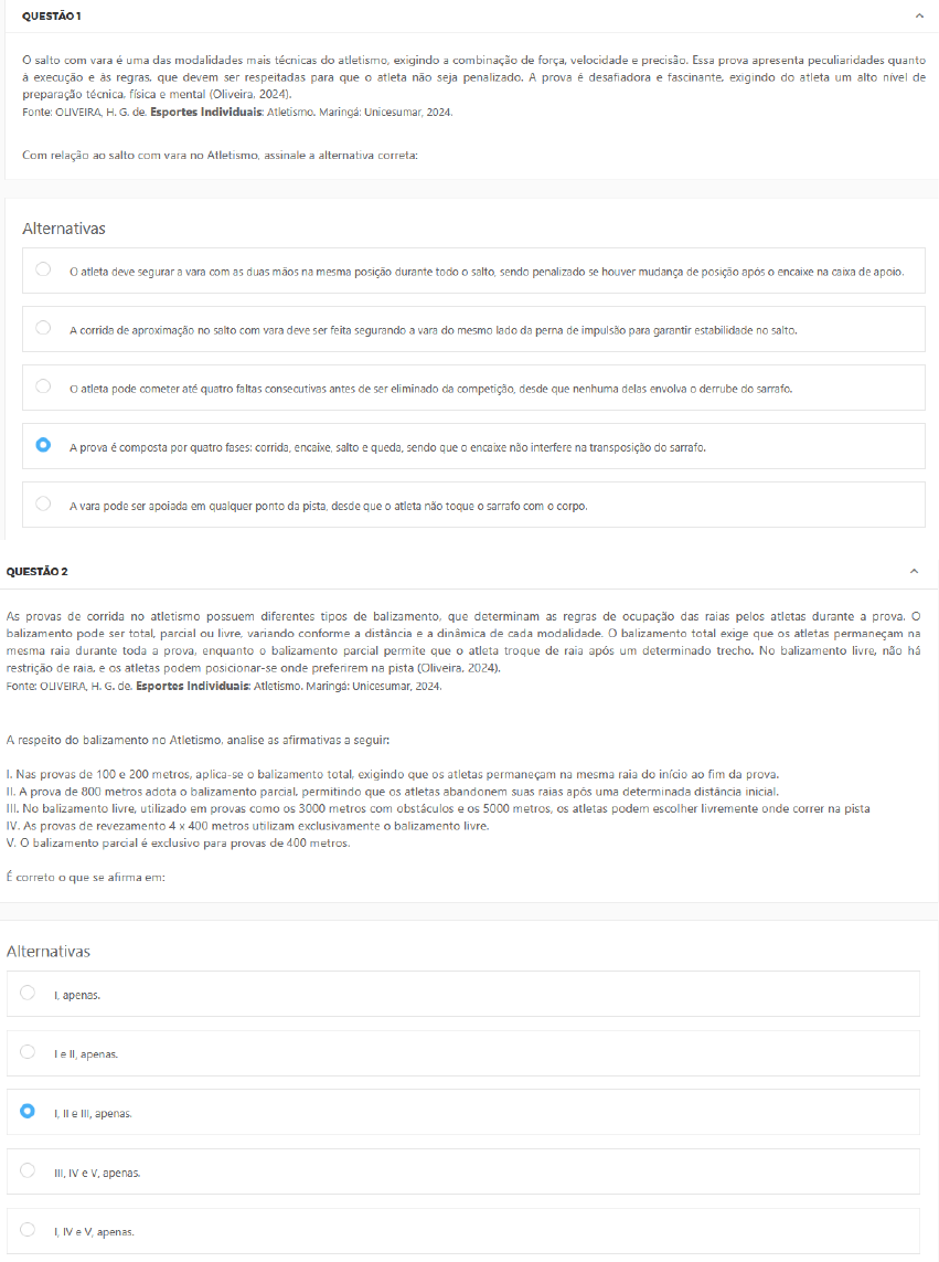 salto com vara é uma das modalidades mais técnicas do atletismo, exigindo a combinação de força, velocidade e precisão. Essa prova apresenta peculiaridades quanto à execução e às regras, que devem ser respeitadas para que atleta não seja penalizado. A prova é desafiadora e fascinante, exigindo do atleta um alto nível de preparação técnica, física e mental (Oliveira, 2024). Fonte: de. Esportes Individuais: Maringá: Unicesumar, 2024 Com relação ao salto com vara no Atletismo, assinale a alternativa correta: Alternativas o atleta deve segurar a vara com as duas mãos na mesma posição durante todo o salto, sendo penalizado se houver mudança de posição após O encaixe na caixa de apoio. A corrida de aproximação no salto com vara deve ser feita segurando a vara do mesmo lado da perna de impulsão para garantir estabilidade no salto. atleta pode cometer até quatro faltas consecutivas antes de ser eliminado da competição, desde que nenhuma delas envolva o derrube do sarrafo. A prova é composta por quatro fases: corrida, encaixe, salto e queda, sendo que encaixe não interfere na transposição do sarrafo. A vara pode ser apoiada em qualquer ponto da pista, desde que atleta não toque sarrafo com corpo. QUESTÃO 2 As provas de corrida no atletismo possuem diferentes tipos de balizamento, que determinam as regras de ocupação das raias pelos atletas durante a prova. balizamento pode ser total, parcial ou livre, variando conforme a distância e a dinâmica de cada modalidade. balizamento total exige que os atletas permaneçam na mesma raia durante toda a prova, enquanto balizamento parcial permite que atleta troque de raia após um determinado trecho. No balizamento livre, não há restrição de raia, e os atletas podem posicionar-se onde preferirem na pista (Oliveira, 2024). Fonte: OLIVEIRA, H.G. Esportes Individuais: Atletismo. Maringá: Unicesumar, 2024. A respeito do balizamento no Atletismo, analise as afirmativas a seguir: I. Nas provas de 100 e 200 metros, aplica-se o balizamento total. exigindo que os atletas permaneçam na mesma raia do início ao fim da prova. II. A prova de 800 metros adota balizamento parcial, permitindo que os atletas abandonem suas após uma determinada distância inicial. III. No balizamento livre, utilizado em provas como os 3000 metros com obstáculos e os 5000 metros, os atletas podem escolher livremente onde correr na pista IV. As provas de revezamento 4 400 metros utilizam exclusivamente balizamento livre. V. balizamento parcial é exclusivo para provas de 400 metros. É correto o que se afirma em: Alternativas apenas. apenas. apenas. III, apenas.QUESTÃO 3 As provas atléticas deste grupo são compostas exigências, basicamente, de força, coordenação e velocidade. A técnica é importante, pois permite inserir movimentos mecânicos adequados ao melhor aproveitamento da força aliados à arremesso do peso e os lançamentos do disco, martelo e dardo, são atividades que envolvem implementos específicos. As características dos engenhos são diferentes umas das outras. H. G: E.C.C. Esportes Individuais: Atletismo. Maringá: Unicesumar, 2022. A seguir analise as afirmações: I. Preparação, construção dos movimentos, lançamento e recuperação, são consideradas estruturas básicas para todos os lançamentos. II. Todos os lançamentos possuem a mesma característica de lançamento e são lançados utilizando os mesmos locais. III. o objetivo principal e final dos lançamentos é maximizar a distância percorrida pelos engenhos. IV. As técnicas ditadas pelas regras influenciam toda a sequência de movimentos. É correto o que se afirma em: Alternativas e III, apenas. IV. II e IV, apenas. I, III IV, apenas. IV. QUESTÃO 4 No salto triplo, uma modalidade do atletismo classificada como um salto horizontal, o atleta realiza uma sequência técnica que combina corrida e três fases responsáveis por determinar a qualidade e a distância do salto. Essa modalidade exige controle, força e coordenação para os movimentos serem executados de forma fluida e eficiente. Além disso, a corrida de aproximação é essencial para gerar a velocidade necessária sem comprometer a técnica nas fases subsequentes (Oliveira, 2024). Fonte: Esportes Individuais: Atletismo. Maringá: Unicesumar, 2024. Com base nas fases do salto triplo do atletismo, assinale a alternativa correta: Alternativas Corrida, step jump. Corrida, hop jump. Corrida, hop, step e jump. Corrida, hop e impulsão. Corrida, impulsão e suspensão.QUESTÃO 5 Enquanto professor/treinador de Educação Física, devemos sempre estar atentos à segurança e a organização dos materiais para as aulas/treinos, principalmente quando nos referimos à modalidade de lançamentos/arremessos dentro do atletismo. Por isso, é imprescindível que saiba conduzir momento de imersão do indivíduo dentro da modalidade que se quira trabalhar. Garantindo a segurança e organização dos materiais. H. G: E.C.C. Esportes Individuais: Atletismo. Maringá: 2022. Considerando os lançamentos/arremessos assinale a alternativa correta. Alternativas Quem lança fica sempre acompanhado de outro colega na área. Ao transportar os dardos (implementos do lançamento) sempre utilizar a posição Os implementos usados para os lançamentos só devem ser buscados quando todos forem lançados. Todo equipamento (material) utilizado deve estar em perfeitas condições de uso e pode ficar disposto pela área da aula durante todo bimestre, pois não oferece aluno que realizar o lançamento deve ser acompanhado por mais dois colegas, um para auxiliar na empunhadura e outro para ficar na área de queda para recuperar implemento. QUESTÃO 6 Muitos são os desafios que encontraremos no campo de trabalho para atletismo, seja na licenciatura ou no a vida moderna trouxe facilidades, mas também um universo de opções positivas e negativas. E. C. C: H. G. Esportes Individuais: Atletismo. Maringá PR: Unicesumar, 2019. Reim