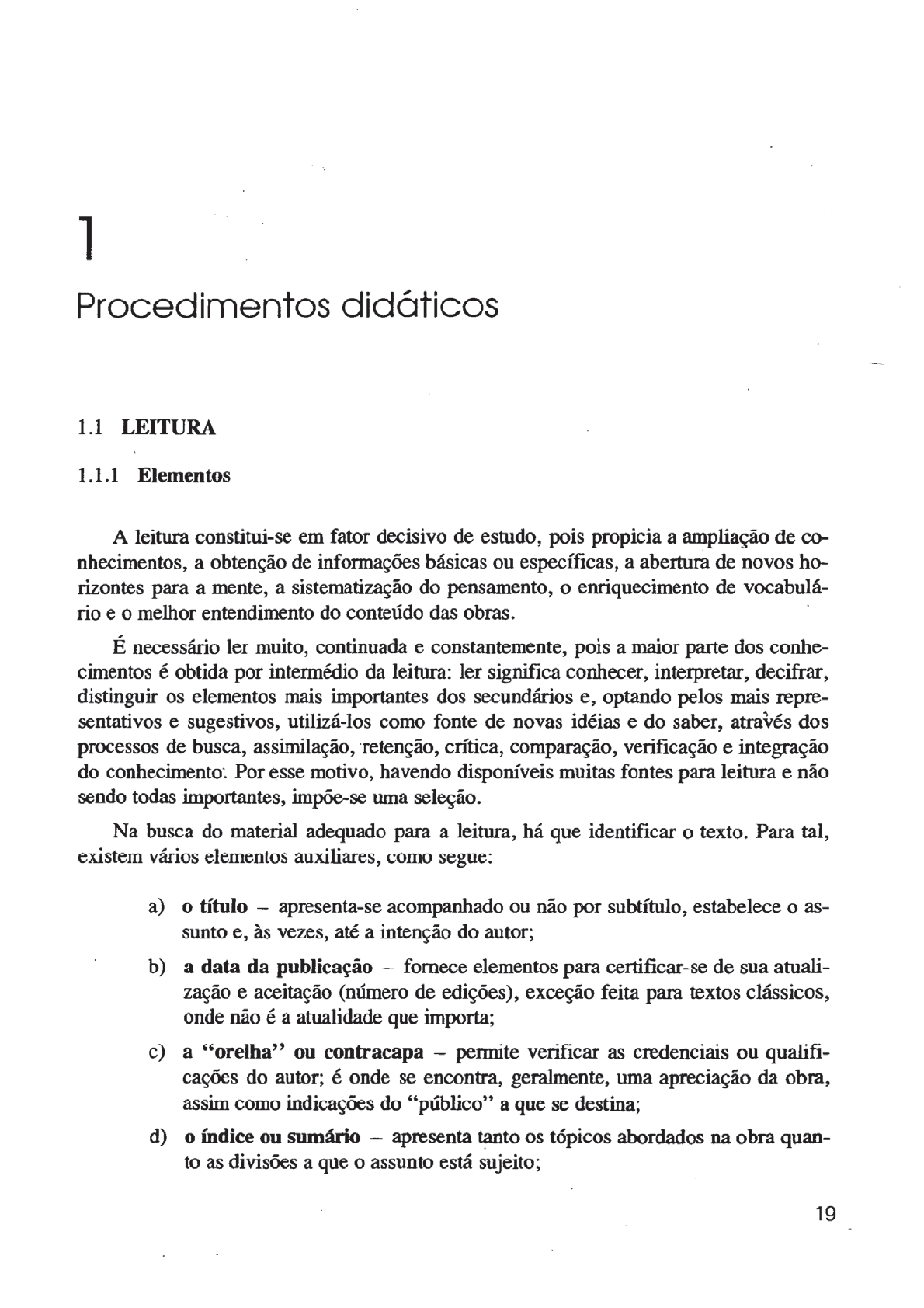 Procedimentos didáticos 1.1 LEITURA 1.1.1 Elementos A leitura constitui-se em fator decisivo de estudo, pois propicia a ampliação de co- a obtenção de informações básicas ou específicas, a abertura de novos ho- rizontes para a mente, a sistematização do pensamento, o enriquecimento de vocabulá- rio e o melhor entendimento do conteúdo das obras. É necessário ler muito, continuada e constantemente, pois a maior parte dos conhe- cimentos é obtida por intermédio da leitura: ler significa conhecer, interpretar, decifrar, distinguir os elementos mais importantes dos secundários e, optando pelos mais repre- sentativos e sugestivos, utilizá-los como fonte de novas idéias e do saber, através dos processos de busca, assimilação, retenção, crítica, comparação, verificação e integração do Por esse motivo, havendo disponíveis muitas fontes para leitura e não sendo todas importantes, impõe-se uma seleção. Na busca do material adequado para a leitura, há que identificar o texto. Para tal, existem vários elementos auxiliares, como segue: a) o título - apresenta-se acompanhado ou não por subtítulo, estabelece o as- sunto e, às vezes, até a intenção do autor; b) a data da publicação fornece elementos para certificar-se de sua atuali- zação e aceitação (número de edições), exceção feita para textos clássicos, onde não é a atualidade que importa; c) a "orelha" ou contracapa - permite verificar as credenciais ou qualifi- cações do autor; é onde se encontra, geralmente, uma apreciação da obra, assim como indicações do "público" a que se destina; d) o índice ou sumário apresenta tanto os tópicos abordados na obra quan- to as divisões a que o assunto está sujeito; 19e) a introdução, prefácio ou nota do autor propicia indícios sobre os ob- jetivos do autor e, geralmente, da metodologia por ele empregada; f) a bibliografia tanto final como as citações de rodapé, permite obter uma idéia das obras consultadas e suas características gerais. Os livros textos selecionados servem para leituras ou consultas; podem ajudar nos estudos em face dos conhecimentos técnicos e atualizados que contêm, ou oferecer subsídios para a elaboração de trabalhos científicos, incluindo seminários, trabalhos es- colares e monografias. Por esse motivo, todo estudante, na medida do possível, deve preocupar-se com a formação de uma biblioteca de obras selecionadas, já que serão seu instrumento de trabalho. Inicia-se, geralmente, por obras clássicas, que permitem obter uma fundamentação em qualquer campo da ciência a que se pretende dedicar, passando depois para outras mais especializadas e atuais, relacionadas com sua área de interesse profissional. Somente a seleção de obras não é suficiente. A leitura deve conduzir à obtenção de informações tanto básicas quanto específicas, variando a maneira de ler, segundo os propósitos em vista, mas sem perder os seguintes aspectos: leitura com objetivo deter- minado, mantendo as unidades de pensamento, avaliando o que se lê; preocupação com o conhecimento de todas as palavras, utilizando para isso glossários, dicionários espe- cializados da disciplina ou mesmo dicionário geral; interrupção da leitura, quer perió- dica quer definitivamente, se perceber que as informações não são as que esperava ou não são mais importantes; discussão do que foi lido com colegas, professores e outras pessoas. 1.1.2 Leitura Proveitosa Uma leitura deve ser proveitosa e trazer resultados satisfatórios. Para tal, alguns as- pectos são fundamentais, como estes: a) atenção aplicação cuidadosa e profunda da mente ou do espírito em de- terminado objeto, buscando o entendimento, a assimilação e apreensão dos conteúdos básicos do texto; b) intenção interesse ou propósito de conseguir algum proveito intelectual por meio da leitura; c) reflexão consideração e ponderação sobre o que se observando todos os ângulos, tentando descobrir novos pontos de vista, novas perspectivas e relações; desse modo, favorece-se a assimilação das idéias do autor, assim como o esclarecimento e o aperfeiçoamento delas, o que ajuda a aprofundar o conhecimento; d) espírito crítico avaliação do texto. Implica julgamento, comparação, aprovação ou não, aceitação ou refutação das diferentes colocações e pon- 20tos de vista. Ler com espírito crítico significa fazê-lo com reflexão, não admitindo idéias sem analisar ou ponderar, proposições sem discutir, nem raciocínio sem examinar; consiste em emitir juízo de valor, percebendo no texto o bom e o verdadeiro, da mesma forma que o fraco, o medíocre ou o falso; e) análise divisão do tema em partes, determinação das relações existentes entre elas, seguidas do entendimento de toda sua organização; f) síntese reconstituição das partes decompostas pela análise, proceden- do-se ao resumo dos aspectos essenciais, deixando de lado tudo o que for secundário e acessório, sem perder a lógica do pensamento. Resumindo, uma leitura de estudo nunca deve ser realizada sem se determinar de antemão seu objetivo ou propósito, sem entender parte do que se lê (mesmo que seja uma ou outra palavra), sem avaliar, discutir e aplicar o conhecimento emanado da análi- se e síntese do texto lido. 1.1.3 Objetivos Apesar da necessidade de que a leitura seja sempre proveitosa, existem várias ma- neiras e objetivos para quem pretende lidar com um texto. Assim, temos: a) scanning procura de certo tópico da obra, utilizando o índice ou sumá- rio, ou a leitura de algumas linhas, parágrafos, visando encontrar frases ou palavras-chave; b) skimming captação da tendência geral, sem entrar em minúcias, valen- do-se dos títulos, subtítulos e ilustrações, se houver; deve-se também ler parágrafos, tentando encontrar a metodologia e a essência do trabalho; c) do significado visão ampla do conteúdo, principalmente do que interes- sa, deixando de lad