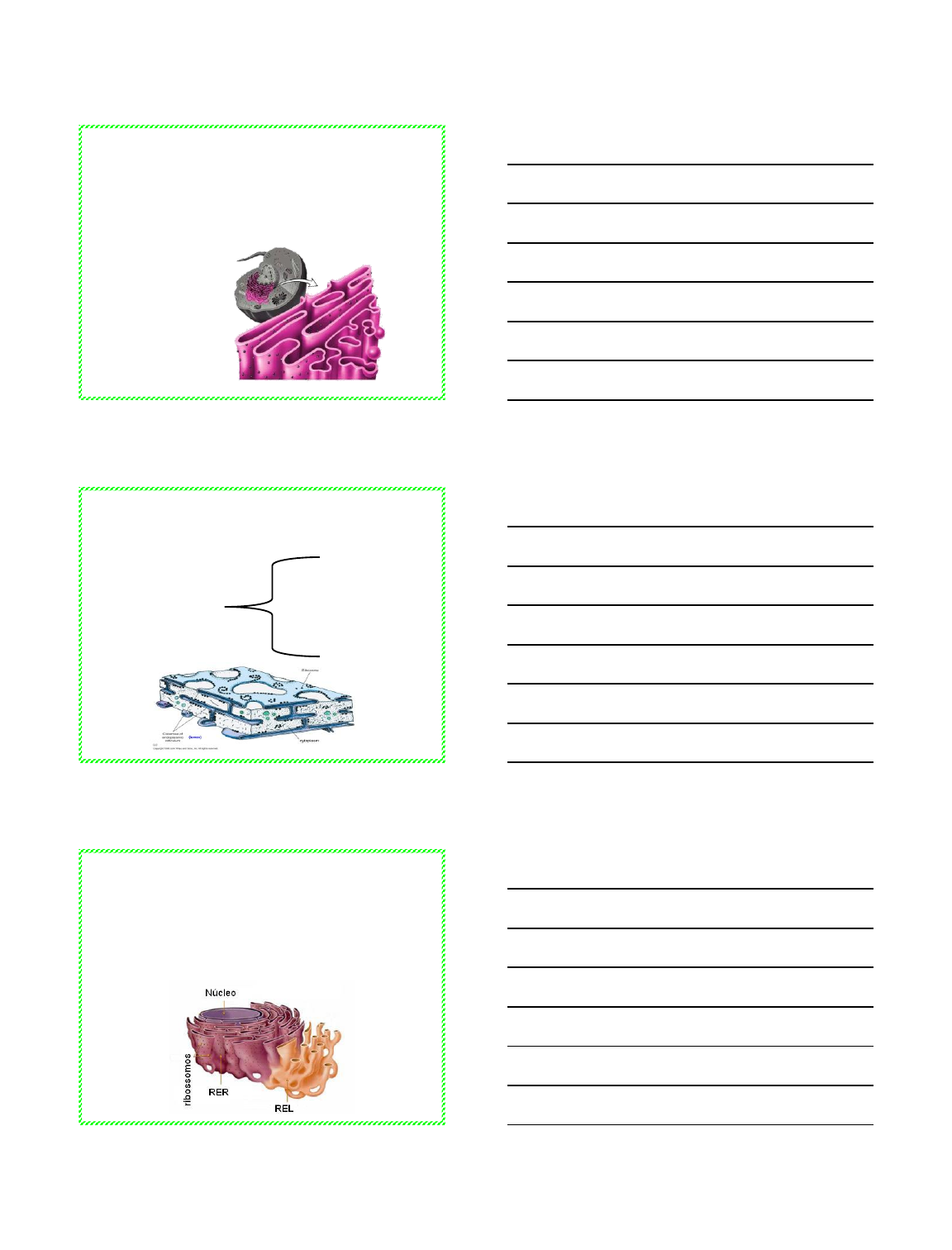 1 Retículo Endoplasmático O Retículo endoplasmático é um sistema de canais ou cisternas membranosas que chega a corresponder 50 a 60% do total de membranas das células. Retículo Endoplasmático Conteúdo das Cisternas • Variável • Normalmente Água Proteína Glicoproteína Lipoproteína Retículo Endoplasmático Existem dois tipos de retículo endoplasmático: • Rugoso ou granular (RER) • Liso ou agranular (REL) 2 Retículo Endoplasmático Rugoso Funções: – Segregação dos produtos sintetizados – Síntese e interiorização de Proteínas não-citosólica Retículo Endoplasmático Rugoso Direção e segregação de proteínas O destino final das proteínas pode ser: 1) A secreção para o exterior da célula 2) A incorporação ao interior de diversos compartimentos intracelulares Retículo Endoplasmático Liso • Vesículas globosas • Túbulos contorcidos • Podem se ligar ao (RER). • Visualização ao M.E. • As enzimas são intrínsecas à membrana do R.E. http://www.google.com.br/url?sa=i&rct=j&q=reticulo+endoplasmatico+rugoso&source=images&cd=&cad=rja&docid=iPBfcurelhaqSM&tbnid=d5RD_gaLWxBo8M:&ved=0CAUQjRw&url=http%3A%2F%2Fwww.portalescolar.net%2F2011%2F08%2Freticulo-endoplasmatico-biologia.html&ei=7hdbUeS_IY7U9AS284GYDQ&bvm=bv.44697112,d.dmQ&psig=AFQjCNFLuVm9x6Q-GsnZoJGKf0oPpWFlgQ&ust=1365010755633561 3 Retículo Endoplasmático Liso • Segregação dos produtos sintetizados • Síntese e interiorização de Lipídios • Desintoxicação do organismo (Modificação) • Elongação de Ac. Graxos • Metabolização do glicogênio • Controle da atividade de contração muscular Funções: Retículo Endoplasmático Liso • “Desintoxicação” do organismo (Modificação) Funções: Ex: Benzopireno 5,6 – epóxido (induz o câncer) Exportação dos lipídios • Ocorrem através de vesículas • São distribuídos para as membranas do CG, Lisossomos, membrana Plasmática, etc... 4 Exportação dos lipídios Transporte realizado de uma membrana rica em fosfolipídios (REL) para uma pobre em fosfolipídios (Peroxissomos, Mitocôndrias e etc.) ORGANELAS CITOPLASMÁTICAS COMPLEXO DE GOLGI COMPLEXO DE GOLGI O complexo de Golgi é formado por vários conjuntos interligados de sáculos achatados, denominados dictiossomos ou golgiossomos. 5 COMPLEXO DE GOLGI Dictiossomo (UNIDADE) • Apresentam 3 compartimentos funcionais - Face Trans - Cisterna média - Face Cis COMPLEXO DE GOLGI •Modificação e Concentração de Proteínas EX: - Glicosilação (adição de açúcar) das Glicoproteínas - Fosforilação da manose para proteínas dos lisossomos - Síntese do açúcar das proteoglicanas (atrair íons sódio/H2O) Funções: COMPLEXO DE GOLGI (Doenças relacionadas) No complexo de Golgi,as macromoléculas sofrem modificações pós-traducionais adicionais. Sindrome de Ehlers-Danlos, patologia do colágeno caracterizada por amolecimento dos ligamentos das articulações e presença de pele friável 6 Organelas Citoplasmáticas Lisossomos Organelas Citoplasmáticas Lisossomos Os lisossomos são organelas citoplasmáticas arredondadas, contendo enzimas importantes para o mecanismo de digestão intracelular. Organelas Citoplasmáticas Lisossomos Tipos de Lisossomos • Primários: Enzima + Membrana (INATIVO) • Secundário: Enzima + Membrana + Material Fagocitado • Residual: Enzima + Membrana + Material não digerido 7 Organelas Citoplasmáticas Lisossomos Função dos Lisossomos • Heterofagia:digestão de partículas englobadas • Autofagia: digestão de organelas velhas • Autólise: destruição da célula Enzimas hidrolíticas com pH ácido entre 4,5 á 5 Organelas Citoplasmáticas Lisossomos Lisossomos e Doenças Humanas: Silicose • Causas: inalação de grandes quantidades de sílica. • Sintomas: Os componentes celulares são digeridos e as células morrem , provocando diminuição da capacidade pulmonar. Organelas Citoplasmáticas Lisossomos Lisossomos e Doenças Humanas: Artrite reumática • Causas: liberação de enzimas para o espaço extracelular, causando estragos aos materiais das articulações. • Sintomas: Inflamação das articulações. 8 Organelas Citoplasmáticas Lisossomos Lisossomos e Doenças Humanas: Tay-Sachs • Causas: doença hereditária e decorrente do mal funcionamento das enzimas dos lisossomos das células nervosas do cérebro. • Sintomas: Lesões irreversíveis, determinando retardo mental e morte na infância. Organelas Citoplasmáticas Peroxissomos Os peroxissomos são organelas caracterizadas pela presença de enzimas oxidativas que transferem átomos de hidrogênio de diversos substratos para o oxigênio. Organelas Citoplasmáticas Peroxissomos Constituição Quimica (interna): • Maior parte da catalase celular 2 H2O2 2 H2O + O2 Catalase A catalase é responsável pela decomposição da água oxigenada, dando origem à água e ao oxigênio. 9 Organelas Citoplasmáticas Peroxissomos Função dos Peroxissomos • Decomposição do Peróxido de hidrogênio • Degradação dos ácidos graxos (p/síntese de ATP) • Desintoxicação do organismo (50% do álcool) Membrana Celular Nucléolo Nucleoplasma Peroxissomos Retículo Endoplasmático Liso Mitocôndria Citoplasma Ribossomos Complexo de Golgi Lisossomos Cariotéca Reticulo Endoplasmático Rugoso Centríolos Bibliografia ALBERTS, B.; BRAY, D.; JOHNSON, A.; LEWIS, J.; RAFF, M.; ROBERTS, K.; WALTER, P.; Fundamentos da Biologia Celular - Uma introdução à biologia molecular da célula. 1a ed. Porto Alegre. Artes Médicas, 1999. ALBERTS, B.; BRAY, D.; LEWIS, J.; RAFF, M.; ROBERTS, K.; WATSON, J.D. Biologia molecular da célula. 3a ed. Porto Alegre. Artes Médicas, 1997. JUNQUEIRA, L.C.; CARNEIRO, J. Biologia molecular e celular. 7a ed. Rio de Janeiro. Ed. Guanabara Koogan, 1998. DE ROBERTS e DE ROBERTS, Jr. Bases da biologia celular e molecular. 2a ed. Rio de Janeiro. Ed. Guanabara Koogan, 1993. Slide 15 Slide 16 Slide 17 Slide 18 Slide 19 Slide 20 Slide 