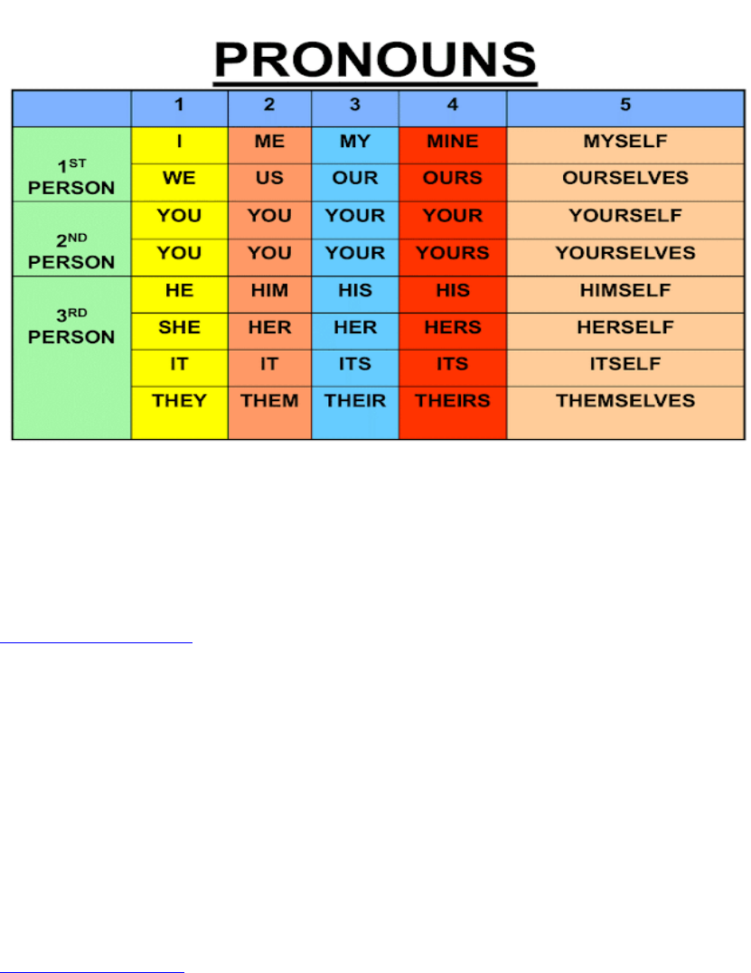 PRONOUNS IN ENGLISH Classificação dos personal pronouns Os pronomes pessoais em inglês são classificados em: Subject Pronouns: equivalentes aos pronomes pessoais do caso reto em português, eles funcionam como sujeitos que praticam a ação verbal. Normalmente, surgem no início da frase antes de verbos ou preposições. Em relação ao grau, eles são utilizados no singular (I, you, he she, it) e no plural (we, you, they). Possuem três gêneros: masculino, feminino e neutro. O gênero neutro refere-se a lugares, animais, objetos, sentimentos, ideias, etc. Ex. · I read a new romance this week. (Eu li um romance novo esta semana.) · You spend much time watching television. (Você passa muito tempo assistindo televisão.) Object Pronouns: equivalentes aos pronomes pessoais do caso oblíquo em português, eles funcionam como objetos da frase, ou seja, quem ou o que recebe a ação. São empregados após verbos e preposições e fazem parte do predicado da frase. Eles são utilizados no singular (me, you, him, her, it) e no plural (us, you, them). A forma neutra “it” faz referência a animais, objetos, lugares, ideias e sentimentos. EX: · I prefer vegetables to meat. (Eu prefiro legumes do que carne.) · You are doing really well at your job. (Você está indo muito bem em seu trabalho.) Possessive adjectives Os possessive adjectives (pronomes adjetivos possessivos) funcionam como adjetivos na frase e sempre estão acompanhados por um substantivo. Exemplos: · His dog is black. (O cachorro dele é preto.) · Her sister is an architect. (A irmã dela é arquiteta.) Possessive pronouns Os possessive pronouns (pronomes possessivos substantivos) funcionam como substantivos, substituindo-os na frase. Exemplos: • This pen is mine. (Essa caneta é minha.) • These cars are theirs. (Esses carros são deles.) • That bag is hers. (Aquela bolsa é dela.) • This money is ours. (Este dinheiro é nosso.) Reflexive Pronouns Os pronomes reflexivos em inglês (reflexive pronouns) são termos utilizados quando uma ação praticada pelo sujeito incide sobre ele mesmo. Geralmente, essas palavras aparecem após o verbo, concordando sempre com o sujeito da oração. São construídas com as terminações “-self”, no singular, e “-selves”, no plural. Classificação Os pronomes reflexivos podem desempenhar três tipos de funções em uma frase: Função reflexiva Ocorre quando a ação do verbo recai sobre o próprio sujeito. O pronome concorda com o sujeito da frase e é empregado depois dele. Exemplo: The boy cut himself with a knife. (O garoto se cortou com uma faca.) Função enfática Na função enfática, o pronome reflexivo é usado para dar ênfase à pessoa que pratica a ação. Nesse caso, o pronome concorda com o sujeito sendo empregado depois dele ou depois do objeto na frase. Exemplo: Amanda wrote the letter herself. (A própria Amanda escreveu a carta.) Função idiomática Na função idiomática, o pronome é precedido pela preposição by. Nesse caso, o sujeito pratica a ação sem ajuda ou companhia de outra pessoa, ou seja, pratica a ação sozinho. Exemplo: Did you go to school by yourself? (Você foi à escola sozinho?)