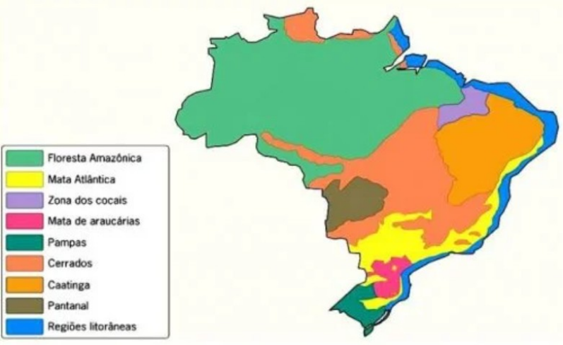 **Floresta Amazônica:** Maior floresta tropical do mundo, localizada no Norte do Brasil, com clima quente e úmido. **Mata Atlântica:** Floresta rica em biodiversidade, estende-se pelo litoral leste do Brasil, com diversos climas, predominando o Tropical. **Cerrado:** Savana brasileira, predominante no Centro-Oeste, com vegetação adaptada ao clima seco. **Caatinga:** Vegetação típica do Semiárido nordestino, com plantas adaptadas à seca. **Mata de Cocais:** Vegetação de transição entre Cerrado, Caatinga e Amazônia, com destaque para palmeiras, encontrada no Norte e Nordeste. **Pantanal:** Ecossistema diversificado com áreas alagadas, localizado no Centro-Oeste. **Campos (Pampas):** Vegetação de gramíneas típica do clima subtropical no Sul do Brasil. **Mata de Araucárias:** Floresta subtropical do Sul, dominada por araucárias, hoje reduzida pela exploração de madeira. **Mangues:** Vegetação costeira adaptada a áreas alagadas, encontrada ao longo do litoral brasileiro. Floresta Amazônica A Floresta Amazônica é um tipo de floresta equatorial ou tropical. Possui mais de cinco milhões de km² e é, em função disso, considerada a maior floresta tropical do mundo. Trata-se também da principal formação vegetal do território brasileiro, uma vez que recobre aproximadamente 60% de sua superfície. Ocorre em estados da região Norte do Brasil, onde há a predominância de climas quentes e úmidos, como o Equatorial. Mata Atlântica A Mata Atlântica era formada por florestas ombrófilas e decíduas, e, próximo da faixa costeira, observava-se a presença de vegetação litorânea como restingas e mangues. Atravessa uma grande diversidade de climas, sendo predominante em áreas de clima Tropical, estendendo-se pelo leste do território nacional, desde o Rio Grande do Norte até a porção setentrional do Rio Grande do Sul, avançando sobre grande parte da região Sudeste e também parcela do Centro-Oeste. Cerrado Chamado também de savana. Recobre mais de dois milhões de km² de área, sendo a vegetação predominante da região Centro-Oeste do Brasil. Caatinga É chamada também de savana em função da sua fisionomia. É típica de regiões de clima Semiárido, em que há uma prolongada estação sem chuvas. Essas características são encontradas na sub-região conhecida como Sertão Nordestino. A Caatinga é formada por gramíneas, arbustivas e árvores de pequeno e médio porte. Observa-se, ainda, a ocorrência de xeromorfismo em muitas das espécies que compõem a flora da Caatinga, que nada mais é do que o conjunto de mecanismos de adaptação à seca, como a armazenagem de água. Mata de cocais É uma vegetação de transição entre o Cerrado, a Caatinga e a Floresta Amazônica. É encontrada comumente entre estados das regiões Norte e Nordeste do Brasil, na sub-região denominada Meio Norte, que compreende Maranhão, Tocantins e Piauí. É caracterizada pela presença de árvores de grande e médio porte e dossel aberto, sendo marcante na paisagem palmeiras como carnaúbas, buritis e babaçus. Pantanal O Pantanal é classificado como um sistema complexo, uma vez que agrega feições bastante diversificadas e características de outros biomas e formações vegetais. Ocorre nos estados do Mato Grosso e Mato Grosso do Sul, na região Centro-Oeste do país. Em função das terras planas, observa-se a formação de extensas áreas alagadas no período das cheias dos rios. Campos ou Pampas Essa vegetação é típica das regiões de clima Subtropical da região Sul do Brasil. Mata de araucárias Chamada também de mata dos pinhais, atravessava a porção central dos três estados que integram a região Sul do Brasil, que são áreas de relevo elevado e clima Subtropical. As araucárias são o principal tipo de árvore encontrado nessa formação, por isso o seu nome. Elas podem ter dezenas de metros de altura, e são caracterizadas pelas folhas em formato de agulha, troncos largos e pela pinha, que origina a semente conhecida como pinhão. Essa vegetação se encontra hoje bastante reduzida em decorrência das atividades exploratórias de extração de madeira. Mangues Os mangues correspondem à vegetação encontrada nos manguezais. Estes compõem o sistema marinho-costeiro brasileiro, que se estende por toda a faixa litorânea do país, com exceção do Rio Grande do Sul. Os mangues se formam comumente no encontro da água doce dos rios com a água salobra do mar, e são marcados pelas planícies alagadas, onde se encontra grande quantidade de sedimentos que dão origem à lama. As árvores, de troncos e raízes finas, são adaptadas a esse ambiente, e muitas delas possuem raízes expostas para a respiração. image1.png