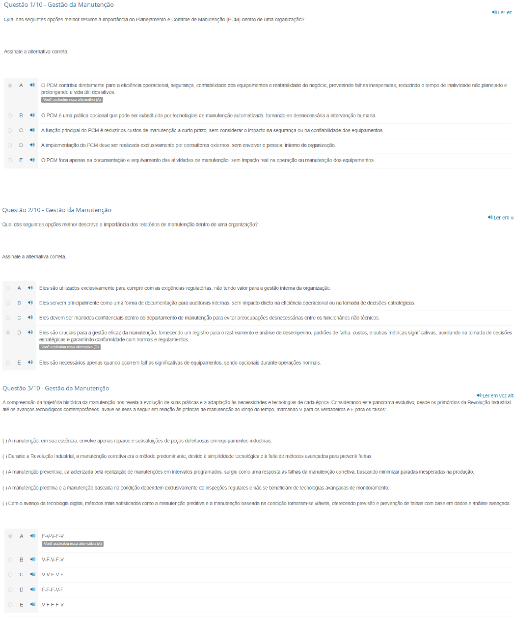 Questão 1/10 Gestão da Manutenção Ler en Qual das seguintes opções melhor resume a importância do Planejamento e Controle de Manutenção (PCM) dentro de uma organização? Assinale alternativa A PCM contribui diretamente para a eficiência operacional, confiabilidade dos equipamentos e rentabilidade do negócio, prevenindo falhas inesperadas, reduzindo tempo de inatividade não planejado e prolongando a vida dos Você assinalou essa alternativa (A) B PCM é uma prática opcional que pode ser substituída por tecnologias de manutenção automatizada, tornando-se desnecessária a intervenção humana A função principal do PCM é reduzir os custos de manutenção a curto prazo, sem considerar impacto na segurança ou na confiabilidade dos equipamentos. A implementação do PCM deve ser realizada exclusivamente por consultores externos, sem envolver pessoal interno da organização. E PCM foca apenas na documentação e arquivamento das atividades de manutenção, sem impacto real na operação ou manutenção dos Questão 2/10 Gestão da Manutenção Ler em V Qual das seguintes opções melhor descreve a importância dos relatórios de manutenção dentro de uma organização? Assinale alternativa A Eles são utilizados exclusivamente para cumprir com as exigências regulatórias, não tendo valor para a gestão interna da B Eles servem principalmente como uma forma de documentação para auditorias sem impacto direto na eficiência operacional ou na tomada de decisões C Eles devem ser mantidos confidenciais dentro do departamento de manutenção para evitar preocupações desnecessárias entre os funcionários não D Eles são cruciais para a gestão eficaz da manutenção, fornecendo um registro para rastreamento e análise de desempenho, padrões de falha, custos, e outras métricas significativas, auxiliando na tomada de decisões estratégicas e garantindo conformidade com normas e regulamentos Você assinalou essa alternativa (D) E Eles são necessários apenas quando ocorrem falhas significativas de equipamentos, sendo opcionais durante operações Questão 3/10 Gestão da Manutenção Ler em A compreensão da trajetória histórica da manutenção nos revela a evolução de suas práticas e a adaptação às necessidades e tecnologias de cada Considerando este panorama desde os primórdios da Revolução Industrial até os avanços tecnológicos avalie os itens a seguir em relação às práticas de manutenção ao longo do tempo, marcando V para os verdadeiros e F para os ( A manutenção, em sua essência, envolve apenas reparos e substituições de peças defeituosas em equipamentos Durante a Revolução a manutenção corretiva era método predominante, devido à simplicidade tecnológica e à falta de métodos avançados para prevenir ( A manutenção preventiva, caracterizada pela realização de manutenções em intervalos programados, surgiu como uma resposta às falhas da manutenção corretiva, buscando minimizar paradas inesperadas na produção ( A manutenção preditiva e a manutenção baseada na condição dependem exclusivamente de inspeções regulares e não se beneficiam de tecnologias avançadas de Com o avanço da tecnologia digital, métodos mais sofisticados como a manutenção preditiva e a manutenção baseada na condição tornaram-se viáveis, oferecendo previsão e prevenção de falhas com base em dados e análise avançada A F-V-V-F-V Você assinalou essa alternativa (A) B V-F-V-F-V C V-V-F-V-F F-F-F-V-F E V-F-F-F-VQuestão 4/10 Gestão da Manutenção Ler em Quais são os componentes principais de uma Ordem de Serviço (OS) eficiente na manutenção? Assinale a alternativa correta A Somente a assinatura do técnico e a data de conclusão do serviço, sem detalhes Exclusivamente uma lista de materiais ignorando a descrição do trabalho ou a identificação do equipamento. Apenas o da Ordem de Serviço e o nome do solicitante, sem especificar o trabalho a ser feito ou prazo. Informações Gerais, Descrição do Localização do Equipamento, Dados do Equipamento, Materiais e Ferramentas Assinatura do Técnico, Comentários e Você assinalou essa alternativa E Relatórios financeiros detalhados sobre o custo do serviço, sem fornecer informações sobre a natureza do trabalho de Questão 5/10 Gestão da Manutenção Ler Considerando tudo que se associa às funções básicas da gerência e da equipe de manutenção, qual das seguintes opções melhor descreve as responsabilidades fundamentais da gerência de manutenção? Assinale a alternativa A Focar exclusivamente no desenvolvimento de novas tecnologias de manutenção para melhorar a eficiência B Delegar todas as atividades de manutenção para fornecedores de serviços externos, minimizando a necessidade de uma equipe interna. C Concentrar-se unicamente em manutenção corretiva para reduzir custos operacionais e melhorar a eficiência a curto prazo. D Planejar e programar atividades de manutenção, controlar custos, gerenciar e liderar e gerenciar a equipe de manutenção, promovendo uma cultura de melhoria Você assinalou essa alternativa E Limitar as atividades da equipe de manutenção à execução de tarefas de manutenção preventiva, ignorando a importância da manutenção preditiva e Questão 6/10 Gestão da Manutenção Le Quais dos seguintes Key Performance Indicators (KPIs) são diretamente impactados pela implementação do Total Productive Maintenance (TPM) em uma organização? Assinale a alternativa correta A Aumento do investimento em publicidade, diminuição da retenção do cliente e aumento da hora-homem de intervenção B Redução do de satisfação do cliente, aumento da qualidade dos fornecedores e reversão de tendência de endividamento de longo prazo. Melhoria da Eficiência Geral do Equipamento (OEE), redução do tempo de inatividade do equipamento, diminuição do índice de acidentes no trabalho e aumento da qualidade do produto. Você assinalou essa alte
