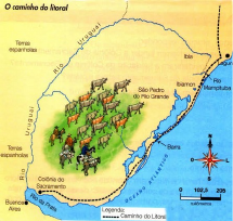 Fronteiras e tratados Os portugueses demonstravam um interesse especial pelas áreas do continente e da Foz do Rio da Prata, por isso, essas regiões foram alvo de intensas e longas disputas entre Portugueses e Espanhóis. Por causa dessas disputas, os limites do que hoje é o Rio Grande do Sul ficaram indefinidos por um longo tempo é a história do estabelecimento desses limites que você vai conhecer hoje nesta aula. Os limites do Rio Grande do Sul só foram estabelecidos em 1852, mais de três séculos depois da chegada dos portugueses ao Brasil. Durante esse período em que as fronteiras estavam definidas, o Continente muitas vezes foi uma área de livre circulação de pessoas e mercadorias onde o contrabando era comum. Nas regiões fronteiriças em geral Portugueses e Espanhóis conviviam normalmente, estabelecendo relações pessoais e comerciais. Mas ao longo de anos houve também vários conflitos e alguns tratados. Esses conflitos e tratados levaram a definição dos limites atuais do nosso Estado. Moramos na região em que ocorreu a maior batalha campal da história do Brasil, a famosa Batalha do Passo do Rosário, que veremos com mais detalhes em aulas posteriores. As disputas entre portugueses e espanhóis e os tratados Vimos que o Tratado de Tordesilhas, assinado em 1494, dividiu o Novo Mundo entre as coroas Portuguesa e Espanhola. De acordo com essa divisão, as terras do atual Rio Grande do Sul deveriam ser espanholas, já que a linha imaginária que dividia o novo mundo passava pela cidade de Laguna, hoje em Santa Catarina. Mas em 1580 as coroas de Portugal e da Espanha foram unificadas, pois não havia um herdeiro português para o trono lusitano. Assim o rei da Espanha tornou-se também rei de Portugal e a união ficou conhecida como União Ibérica. Com isso, os comerciantes portugueses passaram a fazer seus negócios na cidade de Buenos Aires, hoje capital da Argentina. Daí eles controlavam o comércio da Prata de Potosí, uma imensa mina que ficava na atual Bolívia. Quando a União Ibérica acabou em 1640 os comerciantes portugueses foram expulsos de Buenos Aires. Para não perder seus negócios eles exigiram a criação de um posto comercial na região do Rio da Prata. Assim, em 1680 a coroa portuguesa criou a Colônia do Sacramento, em frente à cidade de Buenos Aires, na outra margem do rio. Os portugueses sabiam que segundo o Tratado de Tordesilhas a Colônia do Sacramento estaria em área espanhola. Mas resolveram aplicar o princípio chamado de uti possidetis - quem ocupasse as terras teria a posse delas. Os espanhóis não concordaram com isso. Por diversas vezes eles cercaram ou ocuparam a cidade tentando expulsar os portugueses. image1.jpg