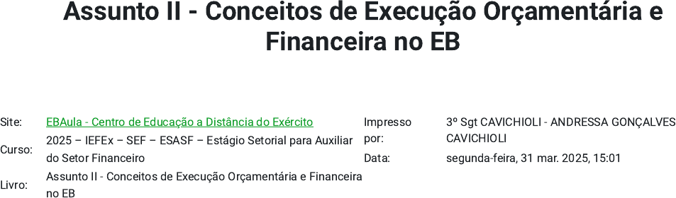 Assunto II - Conceitos de Execução Orçamentária e Financeira no EB Site: EBAula - Centro de Educação a Distância do Exército Curso: 2025 – IEFEx – SEF – ESASF – Estágio Setorial para Auxiliar do Setor Financeiro Livro: Assunto II - Conceitos de Execução Orçamentária e Financeira no EB Impresso por: 3º Sgt CAVICHIOLI - ANDRESSA GONÇALVES CAVICHIOLI Data: segunda-feira, 31 mar. 2025, 15:01 https://avaebaula.eb.mil.br/ Índice 1. Ciclo Orçamentário e Financeiro 2. Origem e Emprego dos Recursos 3. Estágios da Despesa Pública 3.1. Planejamento 3.2. Execução 4. Fundamentos de Suprimentos de Fundo 1. Ciclo Orçamentário e Financeiro O ciclo orçamentário e financeiro na Administração Pública é uma série de etapas que ocorrem num período específico de tempo e caracterizam o processamento das atividades financeiras do Estado. Vamos conversar aqui sobre os aspectos direcionados para a realidade de uma Organização Militar, ou seja, como o "dinheiro" chega, é administrado, gasto e controlado. Primeira coisa que devemos compreender é qual a estrutura em que estamos inseridos, quem são os participantes desse "jogo". Todo Encarregado do Setor Financeiro precisa conhecer os componentes, ou atores, do ciclo orçamentário e financeiro do Exército. Para tanto, antes de qualquer coisa, precisa estar familiarizado com a estrutura organizacional do Exército. Como pode ser observado na estrutura, temos Órgãos de Assessoramento Superior, Direção Geral, de Assistência e de Direção Setorial. Para nosso tema, focaremos nos Órgãos de Direção Setorial (ODS), visto que estes, na maioria dos casos, serão os gestores dos recursos, "donos do dinheiro", ou seja, são eles que descentralizarão os créditos orçamentários para a sua Unidade Gestora (UG). Os ODS farão a descentralização dos créditos orçamentários sob sua responsabilidade, conforme a atividade de sua gestão (logística, ensino, operacional etc.), podendo sua UG receber créditos de qualquer um deles, dependendo do seu tipo de OM (operacional, administrativa ou de ensino). No entanto, a SEF, tem na sua estrutura organizacional as Organizações Militares Diretamente Subordinadas (OMDS), que manterão contato permanente coa a sua UG. Veja o organograma abaixo: A SEF é o ODS responsável pelo controle de toda a execução orçamentária, financeira, patrimonial e de custos do Exército Brasileiro. As UG, no seu dia a dia, manterão permanente contato com a Diretoria de Gestão Orçamentária (DGO), para solicitar créditos orçamentários, e com a Diretoria de Contabilidade (DCont), para solicitar recursos financeiros. Ambas diretorias são OMDS à SEF, tal como o Centro de Pagamento do Exército (CPEx) e o Instituto de Economia e Finanças do Exército (IEFEx), que atuam voltados para suas áreas específicas. Como dito anteriormente, os ODS do Coimando do Exército realizam a gestão dos gastos voltados para sua área específica de atuação, sendo que a SEF, por meio da DGO, é a responsável pela vida administrativa e vegetativa das UG. Nesse sentido, a DGO se torna a mais importante gestora de créditos orçamentários, pois sua responsabilidade é manter as UG em funcionamento, portanto, o tesoureiro terá de manter contato permanente com a Diretoria. Por este e outros motivos, a DGO será nossa principal referência, portanto, quando a citarmos, pode ser entendido como qualquer ODS que descentralize créditos para sua OM. O ciclo de execução orçamentária e financeira inicia com a descentralização do crédito orçamentário e finaliza com o pagamento da despesa, conforme podemos ver abaixo: Nesse fluxo, a DGO, ou outros ODS, enviará o crédito à UG que emitirá o Empenho da Despesa, após o devido processo licitatório. Após o material ser entregue, ou o serviço ser prestado, o setor responsável fará o ateste (quitação da nota fiscal/fatura), enviando o documento de origem ao Setor Financeiro para, após conferir as formalidades documentais, realizar o registro da Liquidação no SIAFI. O tesoureiro, ao realizar o registro da etapa de Liquidação, estará ratificando no SIAFI que os requisitos para o pagamento da despesa foram cumpridos, o que é entendido pela Setorial Financeira (DCONT) como uma solicitação de numerário (R$). A DCONT por meio de um processo de análise diária das contas contábeis de liquidação verifica o valor a ser repassado à UG, realizando, então, a transferência interna do numerário (R$), ação chamada de "SUB-REPASSE do recurso financeiro", que aparecerá na conta contábil do SIAFI de "Limite de Saque" da UG, possibilitando o pagamento. Cada etapa desse ciclo deve estar bem clara para o Tesoureiro, pois o domínio da estrutura geral da execução da despesa no SIAFI permitirá uma melhor compreensão dos detalhes, assim como ajudará na identificação de possíveis problemas na execução financeira. 2. Origem e Emprego dos Recursos Os recursos orçamentários (CRÉDITO) e financeiros (NUMERÁRIO) da UG possuem uma relação de origem e aplicação, ou emprego, que é orientada, de maneira geral, pelos Programas Governamentais. Esses Programas estruturam qualitativamente o que se pretende alcançar com a realização de determinada Política Pública, sendo apresentados, principalmente, no Plano Plurianual (PPA) e na Lei Orçamentária Anual (LOA). Para mais detalhes sobre o processo de Elaboração das Leis Orçamentárias, acesse o Canal do YouTube Orçamento Fácil , que possui uma excelente série, desenvolvida pelo Senado Federal, sobre Orçamento Público. O Comando do Exército está inserido em alguns Programas Governamentais, como é o caso do Programa de Defesa Nacional, que é um Programa Temático que reúne ações relacionadas à atividade-fim do Exército. Existe, ainda, o Programa de Gestão e Manutenção do Poder Executivo, que destina-se a manutenção das atividades do dia-a-dia de cada Órgão. O Comando do Exérci