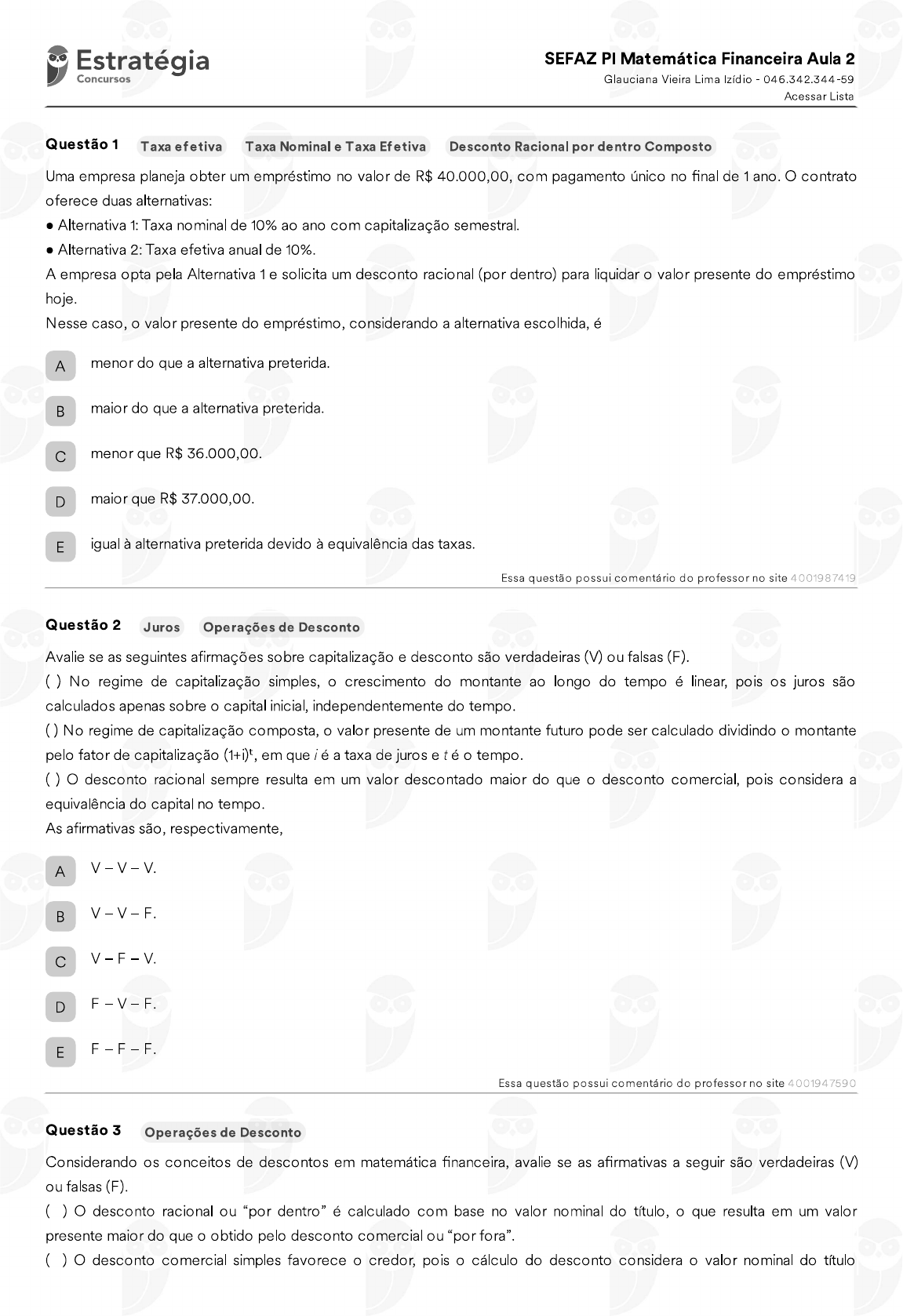 Estratégia SEFAZ PI Matemática Financeira Aula 2 Concursos Glauciana Vieira Lima Izídio 046.342.344-59 Acessar Lista Questão 1 Taxa efetiva Taxa Nominal e Taxa Efetiva Desconto Racional por dentro Composto Uma empresa planeja obter um empréstimo no valor de R$ 40.000,00, com pagamento único no final de 1 ano. contrato oferece duas alternativas: Alternativa 1: Taxa nominal de 10% ao ano com capitalização semestral. Alternativa 2: Taxa efetiva anual de A empresa opta pela Alternativa 1 e solicita um desconto racional (por dentro) para liquidar valor presente do empréstimo hoje Nesse caso, valor presente do empréstimo, considerando a alternativa escolhida, é A menor do que a alternativa preterida. B maior do que a alternativa preterida. C menor que R$ 36.000,00. D maior que R$ 37.000,00. E igual à alternativa preterida devido à equivalência das taxas. Essa questão possui comentário do professor no site 4001987419 Questão 2 Juros Operações de Desconto Avalie se as seguintes afirmações sobre capitalização e desconto são verdadeiras (V) ou falsas (F). ( ) No regime de capitalização simples, crescimento do montante ao longo do tempo é linear, pois os juros são calculados apenas sobre capital inicial, independentemente do tempo. No regime de capitalização composta, valor presente de um montante futuro pode ser calculado dividindo montante pelo fator de capitalização (1+i)t, em que i é a taxa de juros e té tempo. ( ) O desconto racional sempre resulta em um valor descontado maior do que desconto comercial, pois considera a equivalência do capital no tempo. As afirmativas são, respectivamente, A B C D E Essa questão possui comentário do professor no site 4001947590 Questão 3 Operações de Desconto Considerando os conceitos de descontos em matemática financeira, avalie se as afirmativas a seguir são verdadeiras (V) ou falsas (F). ( ) O desconto racional ou "por dentro" é calculado com base no valor nominal do título, que resulta em um valor presente maior do que obtido pelo desconto comercial ou "por fora". ( ) O desconto comercial simples favorece credor, pois cálculo do desconto considera valor nominal do títuloe ignora a equivalência do valor presente. ( ) No desconto composto, o valor presente é sempre menor do que no desconto simples, independentemente da taxa de juros e do prazo. As afirmativas são, respectivamente, A B C D E Essa questão possui comentário do professor no site 4001926821 Questão 4 Descontos Simples Porcentagem Um varejista compra seus produtos de um fornecedor por um preço P e os vende, aos seus clientes, com 30% de acréscimo. A certo cliente, o varejista resolve dar 10% de desconto sobre o preço de venda. Com tal desconto, o lucro auferido pelo vendedor nessa venda é de A B 17%. C D 22%. E Essa questão possui comentário do professor no site 4001868866 Questão 5 Operações de Desconto Porcentagem Um comerciante elevou preço de um produto em Passado um tempo, ele resolveu propagandear que o preço do produto estava sendo oferecido em promoção, com desconto. Na verdade, ele apenas retomou preço original, de antes do aumento. Nesse caso, o percentual do desconto foi aproximadamente igual a A B 13,1%. C D 14,3% E 15,1%. Essa questão possui comentário do professor no site 4001716768 Questão 6 Desconto Racional por dentro SimplesUma nota promissória com valor nominal igual a R$ 3.500,00 foi paga 8 meses antes de seu vencimento. Ao seu pagamento fo i aplicado um desconto racional simples à taxa de 5% ao mês. Nessa situação, valor da nota promissória após desconto foi igual a A R$ 1.400,00. B R$ 2.100,00. C R$ 2.500,00. D R$ 2.800,00. E R$ 3.325,00. Essa questão possui comentário do professor no site 4001648536 Questão 7 Desconto Comercial por fora Simples Izabel desconta uma promissória de valor de R$ 120,00 com vencimento em 60 dias, em um banco cuja taxa de desconto bancária é de 10% ao mês. A taxa mensal de juros que Izabel está pagando é de: (Dados: V5 = 2,236) A 10,2%; B 10,7%; C 11,8%; D 12,1%; E Essa questão possui comentário do professor no site 4001463262 Questão 8 Desconto Racional por dentro Composto Uma duplicata tem valor de face de R$ 1.210,00 e pode ser descontada com dois meses de antecedência por R$ 1.000,00. Considerando-se um desconto racional, os juros compostos mensais que estão sendo praticados são iguais a: A 10%; B 10,5%; C 11%; D 11,5%; E 12%. Essa questão possui comentário do professor no site 4001395588 Questão 9 Desconto Comercial por fora SimplesDois títulos foram resgatados antecipadamente junto a uma instituição financeira, primeiro deles, de valor nominal R$ 4.000,00, com 45 dias de antecedência, e outro, com 60 dias de antecipação. Considere mês de 30 dias. A instituição usou desconto comercial (por fora) com taxa de desconto simples de 2% ao mês. Nessas condições, os descontos nos dois títulos foram iguais. É correto afirmar que valor nominal do título descontado com 2 meses de antecedência era A maior do que R$ 3.800,00. B maior do que R$ 3.600,00 e menor do que R$ 3.800,00. C maior do que R$ 3.400,00 e menor do que R$ 3.600,00. D maior do que R$ 3.200,00 e menor do que R$ 3.400,00. E menor do que R$ 3.200,00. Essa questão possui comentário do professor no site 4001371974 Questão 10 Relação entre os descontos simples por fora e por dentro A questão refere-se a Matemática Financeira. Dois títulos de valores nominais iguais são descontados em um banco 3 meses antes de seus vencimentos. Para um dos títulos utilizou-se operação de desconto comercial simples e para outro a de desconto racional simples. Se em ambos os casos considerou-se a taxa de desconto de 24% ao ano e valor do desconto correspondente à operação de desconto racional simples foi de R$ 1.200,00, a soma dos respectivos valores atuais é de A R$ 37.600,00 B R$ 38.728,00 C R$ 39.928,00 D R$ 39.856,00 E R$ 38.328,00 Essa questão possui comentário do professor no site 