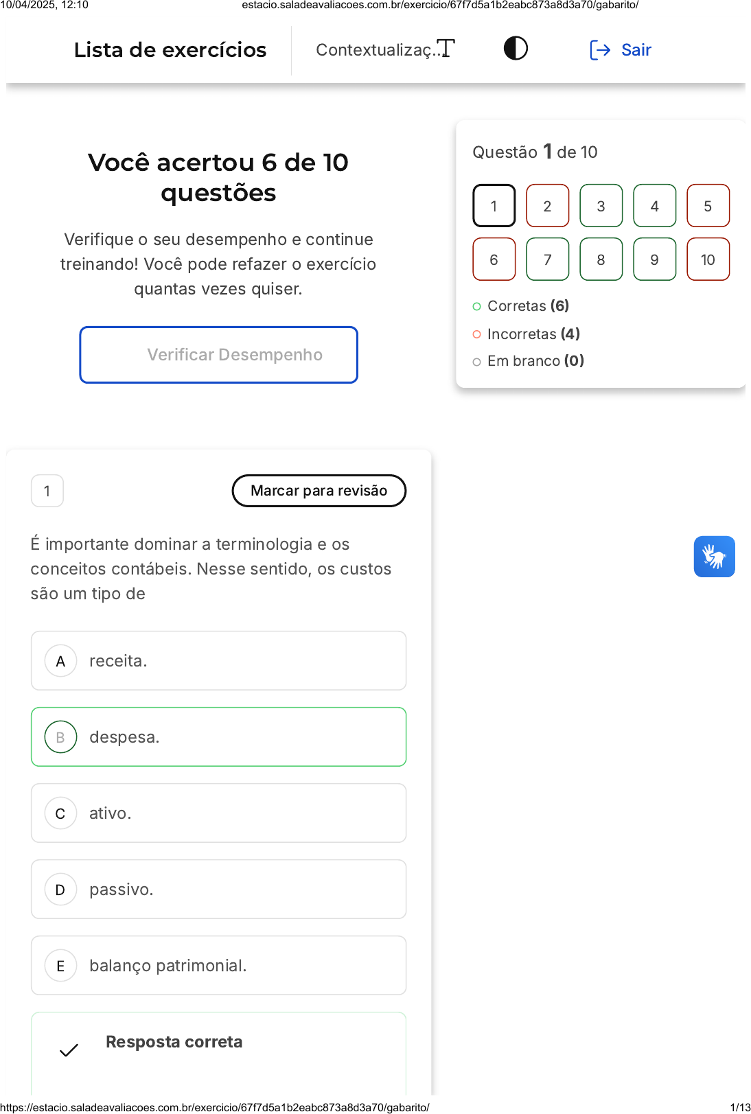 Você acertou 6 de 10 questões Verifique o seu desempenho e continue treinando! Você pode refazer o exercício quantas vezes quiser. Verificar Desempenho A B C D E 1 Marcar para revisão É importante dominar a terminologia e os conceitos contábeis. Nesse sentido, os custos são um tipo de receita. despesa. ativo. passivo. balanço patrimonial. Resposta correta Questão 1 de 10 Corretas (6) Incorretas (4) Em branco (0) 1 2 3 4 5 6 7 8 9 10 Lista de exercícios Contextualizaç… Sair 10/04/2025, 12:10 estacio.saladeavaliacoes.com.br/exercicio/67f7d5a1b2eabc873a8d3a70/gabarito/ https://estacio.saladeavaliacoes.com.br/exercicio/67f7d5a1b2eabc873a8d3a70/gabarito/ 1/13 Parabéns, você selecionou a alternativa correta. Confira o gabarito comentado! Gabarito Comentado Custo - custo é um tipo de despesa, mas que é feita para a produção de um bem ou serviço. A NPC (Norma de Procedimento de Contabilidade) 2 do IBRACON (Instituto Brasileiro dos Auditores Independentes) define custo da seguinte maneira: “Custo é a soma dos gastos incorridos e necessários para a aquisição, conversão e outros procedimentos necessários para trazer os estoques à sua condição e localização atuais, e compreende todos os gastos incorridos na sua aquisição ou produção, de modo a colocá-los em condições de serem vendidos, transformados, utilizados na elaboração de produtos ou na prestação de serviços que façam parte do objeto social da entidade, ou realizados de qualquer outra forma". 2 Marcar para revisão Uma empresa que fabrica computadores calculou o seu custo fabril como R 125.000,00, sendo 40% desse custo referente à matéria-prima. A empresa vendeu 80% da sua produção nesse período por R$ 1.000.000,00, e o estoque estava zerado no começo do período. Não houve outros gastos. Qual é o custo de transformação? 300.000, 00eoseucustoprimáriocomoR 10/04/2025, 12:10 estacio.saladeavaliacoes.com.br/exercicio/67f7d5a1b2eabc873a8d3a70/gabarito/ https://estacio.saladeavaliacoes.com.br/exercicio/67f7d5a1b2eabc873a8d3a70/gabarito/ 2/13 A B C D E R$ 60.000,00 R$ 250.000,00 R$ 75.000,00 R$ 175.000,00 R$ 760.000,00 Resposta incorreta Opa! A alternativa correta é a letra B. Confira o gabarito comentado! Gabarito Comentado 40% de 125.000 é referente a MT, então MT = 50.000. Como CP = MT + MOD, logo 125.000 = 50.000 + MOD MOD = 75.000 CF = CP + CT - MOD 300.000 = 125.000 + CT - 75.000 300.000 = 50.000 + CT CT = 250.000. 3 Marcar para revisão Contabilidade Financeira e Contabilidade de Custos são conceitos distintos. A Contabilidade de Custos, ao ser comparada com a Contabilidade Financeira 10/04/2025, 12:10 estacio.saladeavaliacoes.com.br/exercicio/67f7d5a1b2eabc873a8d3a70/gabarito/ https://estacio.saladeavaliacoes.com.br/exercicio/67f7d5a1b2eabc873a8d3a70/gabarito/ 3/13 A B C D E é mais regulada. é menos regulada. faz os mesmos demonstrativos contábeis. surgiu ao mesmo tempo. tem objetivos completamente divergentes. Resposta correta Parabéns, você selecionou a alternativa correta. Confira o gabarito comentado! Gabarito Comentado A Contabilidade Financeira visa produzir demonstrações de propósito geral para usuários externos, é bastante regulada e é pública, enquanto a Contabilidade Gerencial tem como objetivo produzir demonstrações de propósito específico para usuários internos, não sofre regulação e é confidencial. Já a Contabilidade de Custos busca gerar informações para ambas as contabilidades, tanto a Gerencial como a Financeira e, por isso, é um pouco regulada, já que também é híbrida (parte das informações é pública e parte é confidencial). 10/04/2025, 12:10 estacio.saladeavaliacoes.com.br/exercicio/67f7d5a1b2eabc873a8d3a70/gabarito/ https://estacio.saladeavaliacoes.com.br/exercicio/67f7d5a1b2eabc873a8d3a70/gabarito/ 4/13 A B C D E 4 Marcar para revisão Considere uma empresa de produção de calçados que tem os seguintes gastos: Aluguel da fábrica: R$ 50.000,00 Salário dos operários: R$ 10.000,000 Salário dos administradores e gerentes: R$ 20.000,00 Salário dos vendedores: R$ 6.000,00 Energia elétrica: R$ 1.500,00 Água: R$ 1.000,00 Matéria-prima: R$ 45.000,00 Qual é o custo primário? R$ 45.000,00 R$ 55.000,00 R$ 82.500,00 R$ 127.500,00 R$ 133.500,00 Resposta correta Parabéns, você selecionou a alternativa correta. Confira o gabarito comentado! Gabarito Comentado Sabemos que o Custo primário é a soma da matéria prima com a mão de obra direta. Neste caso, temos: CP = 45.000 + 10.000 10/04/2025, 12:10 estacio.saladeavaliacoes.com.br/exercicio/67f7d5a1b2eabc873a8d3a70/gabarito/ https://estacio.saladeavaliacoes.com.br/exercicio/67f7d5a1b2eabc873a8d3a70/gabarito/ 5/13 A B C D E CP = 55.000 5 Marcar para revisão A contabilidade de custos é essencial para a boa gestão das empresas. Quando é realizado um lançamento de um custo, é feito um crédito em custo de mercadorias vendidas. um débito em estoques. um débito em custo de mercadorias vendidas. um crédito no passivo. um débito no passivo. Resposta incorreta Opa! A alternativa correta é a letra C. Confira o gabarito comentado! Gabarito Comentado Custo é um tipo de despesa, mas que é feita para a produção de um bem ou serviço. A NPC (Norma de Procedimento de Contabilidade) 2 do IBRACON (Instituto Brasileiro dos Auditores Independentes) define custo da seguinte maneira: "Custo é a soma dos gastos incorridos e necessários para a aquisição, conversão e 10/04/2025, 12:10 estacio.saladeavaliacoes.com.br/exercicio/67f7d5a1b2eabc873a8d3a70/gabarito/ https://estacio.saladeavaliacoes.com.br/exercicio/67f7d5a1b2eabc873a8d3a70/gabarito/ 6/13 A B outros procedimentos necessários para trazer os estoques à sua condição e localização atuais, e compreende todos os gastos incorridos na sua aquisição ou produção, de modo a colocá-los em condições de serem vendidos, transformados, utilizados na elaboração de produtos ou na prestação de serviços que façam parte do obj