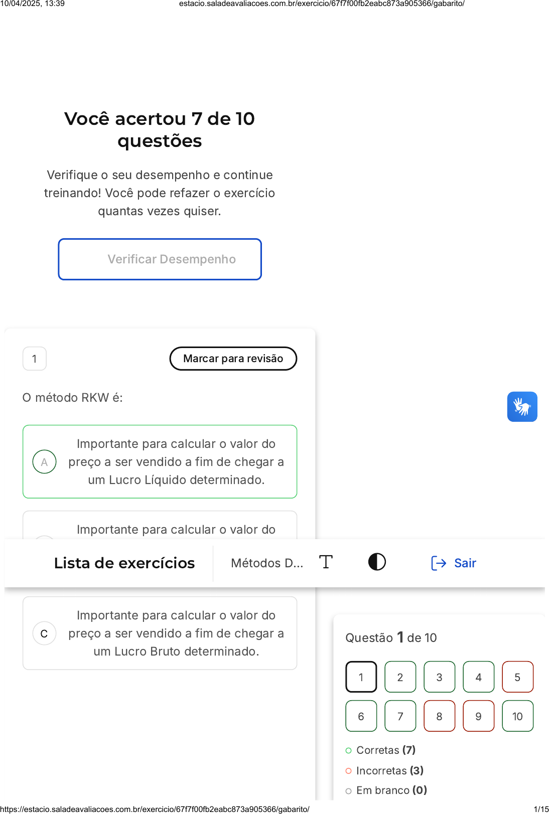 Você acertou 7 de 10 questões Verifique o seu desempenho e continue treinando! Você pode refazer o exercício quantas vezes quiser. Verificar Desempenho A B C 1 Marcar para revisão O método RKW é: Importante para calcular o valor do preço a ser vendido a fim de chegar a um Lucro Líquido determinado. Importante para calcular o valor do preço a ser vendido a fim de chegar a um Lucro Operacional determinado. Importante para calcular o valor do preço a ser vendido a fim de chegar a um Lucro Bruto determinado. Questão 1 de 10 Corretas (7) Incorretas (3) Em branco (0) 1 2 3 4 5 6 7 8 9 10 Lista de exercícios Métodos D… Sair 10/04/2025, 13:39 estacio.saladeavaliacoes.com.br/exercicio/67f7f00fb2eabc873a905366/gabarito/ https://estacio.saladeavaliacoes.com.br/exercicio/67f7f00fb2eabc873a905366/gabarito/ 1/15 D E Importante para calcular o valor do preço a ser vendido a fim de chegar a um Prejuízo Líquido determinado. Importante para calcular o valor do preço a ser vendido a fim de chegar a uma Receita Líquida determinada. Resposta correta Parabéns, você selecionou a alternativa correta. Confira o gabarito comentado! Gabarito Comentado O método RKW é uma ferramenta de gestão financeira que auxilia na determinação do preço de venda de um produto ou serviço, com o objetivo de alcançar um Lucro Líquido específico. Portanto, a alternativa correta é: "Importante para calcular o valor do preço a ser vendido a fim de chegar a um Lucro Líquido determinado". Esse método é essencial para empresas que buscam maximizar seus lucros, garantindo que o preço de venda esteja alinhado com as metas de lucro líquido. 2 Marcar para revisão Uma empresa utilizava o método de Custeio por Absorção, porém ela mudou a forma de calcular os custos para o método ABC. Pode-se então dizer que a empresa: 10/04/2025, 13:39 estacio.saladeavaliacoes.com.br/exercicio/67f7f00fb2eabc873a905366/gabarito/ https://estacio.saladeavaliacoes.com.br/exercicio/67f7f00fb2eabc873a905366/gabarito/ 2/15 A B C D E Não está de acordo com as regras contábeis. Tem uma maior chance de incorrer na "espiral da morte". Tem uma menor chance de incorrer na "espiral da morte". Deveria ter adotado o método RKW, pois é o método superior. Deveria ter continuado com o método do Custeio por Absorção, pois é o método superior. Resposta correta Parabéns, você selecionou a alternativa correta. Confira o gabarito comentado! Gabarito Comentado A alternativa correta é a que afirma que a empresa tem uma menor chance de incorrer na "espiral da morte". A "espiral da morte" é um termo utilizado na contabilidade de custos para descrever uma situação onde os custos fixos são alocados de maneira desproporcional, levando a um aumento dos custos unitários e, consequentemente, a uma diminuição das vendas. O método ABC (Activity-Based Costing ou Custeio Baseado em Atividades) busca alocar os custos de maneira mais precisa, levando em consideração as atividades que realmente 10/04/2025, 13:39 estacio.saladeavaliacoes.com.br/exercicio/67f7f00fb2eabc873a905366/gabarito/ https://estacio.saladeavaliacoes.com.br/exercicio/67f7f00fb2eabc873a905366/gabarito/ 3/15 A B C D E consomem recursos, reduzindo assim a chance de ocorrer a "espiral da morte". 3 Marcar para revisão Uma empresa utiliza o método de custeio por absorção. Ela produz dois produtos: O Produto A e o produto B, tendo o produto A 400 unidades mensalmente produzidas, e o produto B 600 unidades mensalmente produzidas. O custo unitário direto do Produto A é de R$12,00 (R$6,00 de matéria-prima e R$6,00 de mão de obra direta), e o custo unitário direto do Produto B é de R$15,00 (R$10,00 de matéria-prima e R$5,00 de mão de obra direta). Os custos indiretos são de R$50.000,00. A partir dos dados acima, calcule o rateio do custo indireto pelo método do Custeio por Absorção do Produto A utilizando mão de obra direta. R$22.727 R$27.273 R$27.773 R$27.737 R$27.777 Resposta correta 10/04/2025, 13:39 estacio.saladeavaliacoes.com.br/exercicio/67f7f00fb2eabc873a905366/gabarito/ https://estacio.saladeavaliacoes.com.br/exercicio/67f7f00fb2eabc873a905366/gabarito/ 4/15 A B C Parabéns, você selecionou a alternativa correta. Confira o gabarito comentado! Gabarito Comentado O rateio do custo indireto pelo método do Custeio por Absorção do Produto A utilizando mão de obra direta é de R$27.273,00. 4 Marcar para revisão Uma empresa utiliza o método de custeio por absorção. Ela produz dois produtos: O Produto A e o produto B, tendo o produto A 400 unidades mensalmente produzidas, e o produto B 600 unidades mensalmente produzidas. O custo unitário direto do Produto A é de R$12,00 (R$6,00 de matéria-prima e R$6,00 de mão de obra direta), e o custo unitário direto do Produto B é de R$15,00 (R$10,00 de matéria-prima e R$5,00 de mão de obra direta). Os custos indiretos são de R$50.000,00. A partir dos dados acima, calcule o rateio do custo indireto pelo método do Custeio por Absorção do Produto A utilizando unidades produzidas. R$10.000,00 R$20.000,00 R$30.000,00 10/04/2025, 13:39 estacio.saladeavaliacoes.com.br/exercicio/67f7f00fb2eabc873a905366/gabarito/ https://estacio.saladeavaliacoes.com.br/exercicio/67f7f00fb2eabc873a905366/gabarito/ 5/15 D E R$40.000,00 R$50.000,00 Resposta correta Parabéns, você selecionou a alternativa correta. Confira o gabarito comentado! Gabarito Comentado No método de custeio por absorção, os custos indiretos são distribuídos entre os produtos de acordo com algum critério de rateio. Neste caso, o critério utilizado é a quantidade de unidades produzidas. A empresa produz um total de 1000 unidades (400 do Produto A e 600 do Produto B), portanto, cada unidade produzida absorve R$50,00 de custo indireto (R$50.000,00 dividido por 1000 unidades). Como o Produto A tem 400 unidades produzidas, o total de custo indireto alocado a ele é de R$20.000,00 (400 unidades vezes R$50,00 por unidade). Portanto, a alternativa 