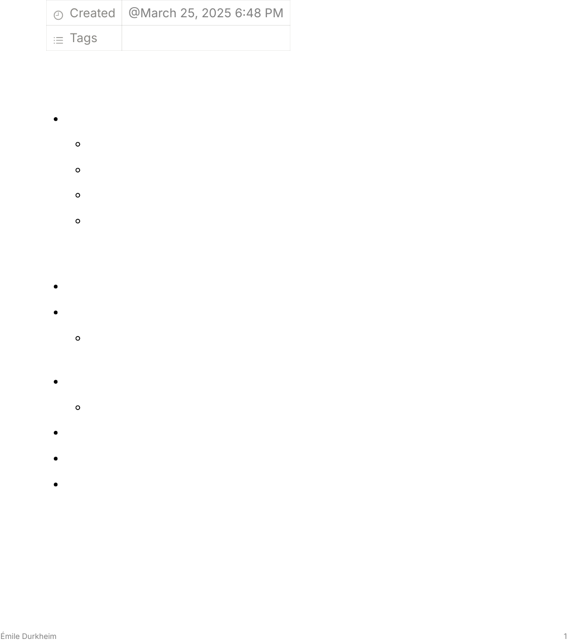 Émile Durkheim Created Tags Émile Durkheim A Sociologia é o estudo dos Fatos Sociais Coercitividade Exterioridade Generalidade “Aperto de mãoˮ Anomia Social Desregramento normativo Estado de ausência de normas claras e coercitivas em uma sociedade Ações individuais não são mais reguladas por normas sociais claras, o que leva a uma falta de direção e propósito (desorientação individual) Ruptura do equilíbrio social Resulta em um vácuo normativo Desejos individuais vêm à tona Períodos de transição social ou crise Durkheim acreditava que a solução para a anomia não estava em um retorno nostálgico à rigidez da velha ordem, mas sim no desenvolvimento de uma nova moralidade que fosse compatível com os valores e as características da sociedade moderna. Divisão do Trabalho e Solidariedade Social March 25, 2025 648 PM Émile Durkheim 1 Divisão do trabalho é um fenômeno social, pois pressupõe um sistema organizado de cooperação e troca entre os indivíduos e grupos que regem a sociedade Organização de tarefas e funções; cooperação Interdependência e coesão social Solidariedade Mecânica: Típica da ordem tradicional, onde há pouca divisão do trabalho e os indivíduos são semelhantes em suas funções, valores e crenças. A coesão social é baseada na semelhança e na forte vinculação ao grupo. Solidariedade Orgânica: Típica da sociedade moderna, onde há uma alta divisão do trabalho e os indivíduos são especializados em diferentes funções. A coesão social é baseada na interdependência e na necessidade de cooperação entre os indivíduos. Autonomia individual. O Suicídio É um fato social de três formas: Suicídio Anômico: Ocorre em momentos de crise ou transformação, quando a sociedade perde a capacidade de frear as atitudes humanas, resultando em um desregramento fundamental das relações entre indivíduo e sociedade. Suicídio Altruísta: Ocorre quando o indivíduo está tomado pela obediência e força coercitiva do grupo social ao qual pertence. Suicídio Egoísta: Ocorre quando o "ego individual se afirma demasiadamente face ao ego social", resultando em individualização desmesurada e desvinculação dos laços sociais. Émile Durkheim 2