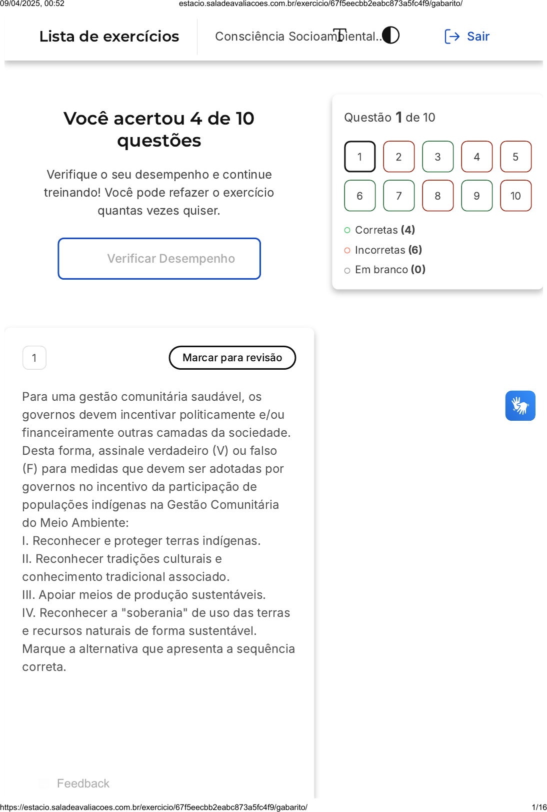 Você acertou 4 de 10 questões Verifique o seu desempenho e continue treinando! Você pode refazer o exercício quantas vezes quiser. Verificar Desempenho 1 Marcar para revisão Para uma gestão comunitária saudável, os governos devem incentivar politicamente e/ou financeiramente outras camadas da sociedade. Desta forma, assinale verdadeiro (V) ou falso (F) para medidas que devem ser adotadas por governos no incentivo da participação de populações indígenas na Gestão Comunitária do Meio Ambiente: I. Reconhecer e proteger terras indígenas. II. Reconhecer tradições culturais e conhecimento tradicional associado. III. Apoiar meios de produção sustentáveis. IV. Reconhecer a "soberania" de uso das terras e recursos naturais de forma sustentável. Marque a alternativa que apresenta a sequência correta. Questão 1 de 10 Corretas (4) Incorretas (6) Em branco (0) 1 2 3 4 5 6 7 8 9 10 Lista de exercícios Consciência Socioambiental… Sair Feedback 09/04/2025, 00:52 estacio.saladeavaliacoes.com.br/exercicio/67f5eecbb2eabc873a5fc4f9/gabarito/ https://estacio.saladeavaliacoes.com.br/exercicio/67f5eecbb2eabc873a5fc4f9/gabarito/ 1/16 A B C D E V-F-V-F F-V-F-V F-F-F-V V-V-V-V F-F-F-F Resposta incorreta Opa! A alternativa correta é a letra D. Confira o gabarito comentado! Gabarito Comentado De acordo com a Agenda 21, os governos, sejam eles nacionais ou provinciais, devem adotar uma série de medidas para incentivar a participação das populações indígenas na gestão comunitária do meio ambiente. Essas medidas incluem: (1) a adoção de políticas públicas que reconheçam e protejam as terras e tradições indígenas; (2) a proteção dessas terras contra atividades que possam prejudicar o meio ambiente; (3) o reconhecimento e a valorização das tradições culturais e dos conhecimentos tradicionais no manejo ambiental dessas regiões; (4) o reconhecimento da dependência dessas populações em relação ao uso sustentável dos recursos naturais; (5) o fortalecimento de mecanismos para resolver problemas relacionados ao manejo de terras; (6) o apoio a meios de produção sustentáveis; e 09/04/2025, 00:52 estacio.saladeavaliacoes.com.br/exercicio/67f5eecbb2eabc873a5fc4f9/gabarito/ https://estacio.saladeavaliacoes.com.br/exercicio/67f5eecbb2eabc873a5fc4f9/gabarito/ 2/16 A B C D E (7) a promoção e intensificação do intercâmbio de conhecimentos e experiências sobre o uso das terras e recursos naturais. Portanto, todas as afirmações apresentadas no enunciado são verdadeiras, o que torna a alternativa D (V- V-V-V) a resposta correta. 2 Marcar para revisão A Rio-92, também conhecida como Cúpula da Terra ou Eco-92, foi um marco internacional na política ambiental do planeta e resultou na produção de importantes documentos, dentre eles a Agenda 21. Marque a alternativa que define a Agenda 21. Instrumento de proteção de ecossistemas e florestas. Instrumento de planejamento da paz mundial, democracia e direitos humanos. Instrumento de planejamento de ações ambientais contra mudanças climáticas. Instrumento de proteção do meio ambiente tendo em vista aspectos econômicos. Instrumento de planejamento participativo, visando o desenvolvimento sustentável. 09/04/2025, 00:52 estacio.saladeavaliacoes.com.br/exercicio/67f5eecbb2eabc873a5fc4f9/gabarito/ https://estacio.saladeavaliacoes.com.br/exercicio/67f5eecbb2eabc873a5fc4f9/gabarito/ 3/16 Resposta incorreta Opa! A alternativa correta é a letra E. Confira o gabarito comentado! Gabarito Comentado A Agenda 21, surgida na Rio-92, é um instrumento de planejamento que envolve a participação de diferentes esferas da sociedade, com o objetivo de alcançar o desenvolvimento sustentável. Este documento propõe mudanças nos padrões de consumo e medidas para a proteção e conservação ambiental. As outras alternativas não descrevem corretamente a Agenda 21, pois ela não se limita à proteção de ecossistemas e florestas, ao planejamento da paz mundial, democracia e direitos humanos, ao planejamento de ações ambientais contra mudanças climáticas ou à proteção do meio ambiente considerando apenas aspectos econômicos. 3 Marcar para revisão No ano de 1981 foi criada a Política Nacional do Meio Ambiente no Brasil, abrindo espaço para a formulação e discussão de ideias no âmbito nacional. Importantes leis, decretos e órgãos ambientais foram criados. A respeito destes, leia atentamente as frases a seguir: I. Exercer o poder de polícia ambiental. II. Executar ações das políticas nacionais de meio ambiente, referentes às atribuições federais, relativas ao licenciamento ambiental, ao controle da qualidade ambiental, à autorização de uso dos recursos naturais e à fiscalização, monitoramento e controle 09/04/2025, 00:52 estacio.saladeavaliacoes.com.br/exercicio/67f5eecbb2eabc873a5fc4f9/gabarito/ https://estacio.saladeavaliacoes.com.br/exercicio/67f5eecbb2eabc873a5fc4f9/gabarito/ 4/16 A B C D E ambiental, observadas as diretrizes emanadas do Ministério do Meio Ambiente. III. Executar as ações supletivas de competência da União, de conformidade com a legislação ambiental vigente. Marque a alternativa que apresenta o órgão que remetem as finalidades acima. apresentados nas outras opções. CONAMA. SISBIO. IBAMA. MMA. SEMA. Resposta correta Parabéns, você selecionou a alternativa correta. Confira o gabarito comentado! Gabarito Comentado A Lei nº 7.735 dispõe sobre a criação do IBAMA (Instituto Brasileiro do Meio Ambiente e dos Recursos Naturais Renováveis) como uma autarquia federal e atribui estas três finalidades básicas para este órgão. Estas finalidades não estão 09/04/2025, 00:52 estacio.saladeavaliacoes.com.br/exercicio/67f5eecbb2eabc873a5fc4f9/gabarito/ https://estacio.saladeavaliacoes.com.br/exercicio/67f5eecbb2eabc873a5fc4f9/gabarito/ 5/16 A B C D E relacionadas aos órgãos apresentados nas outras opções. 4 Marcar para revisão Os países devem promover o diálogo com sua 