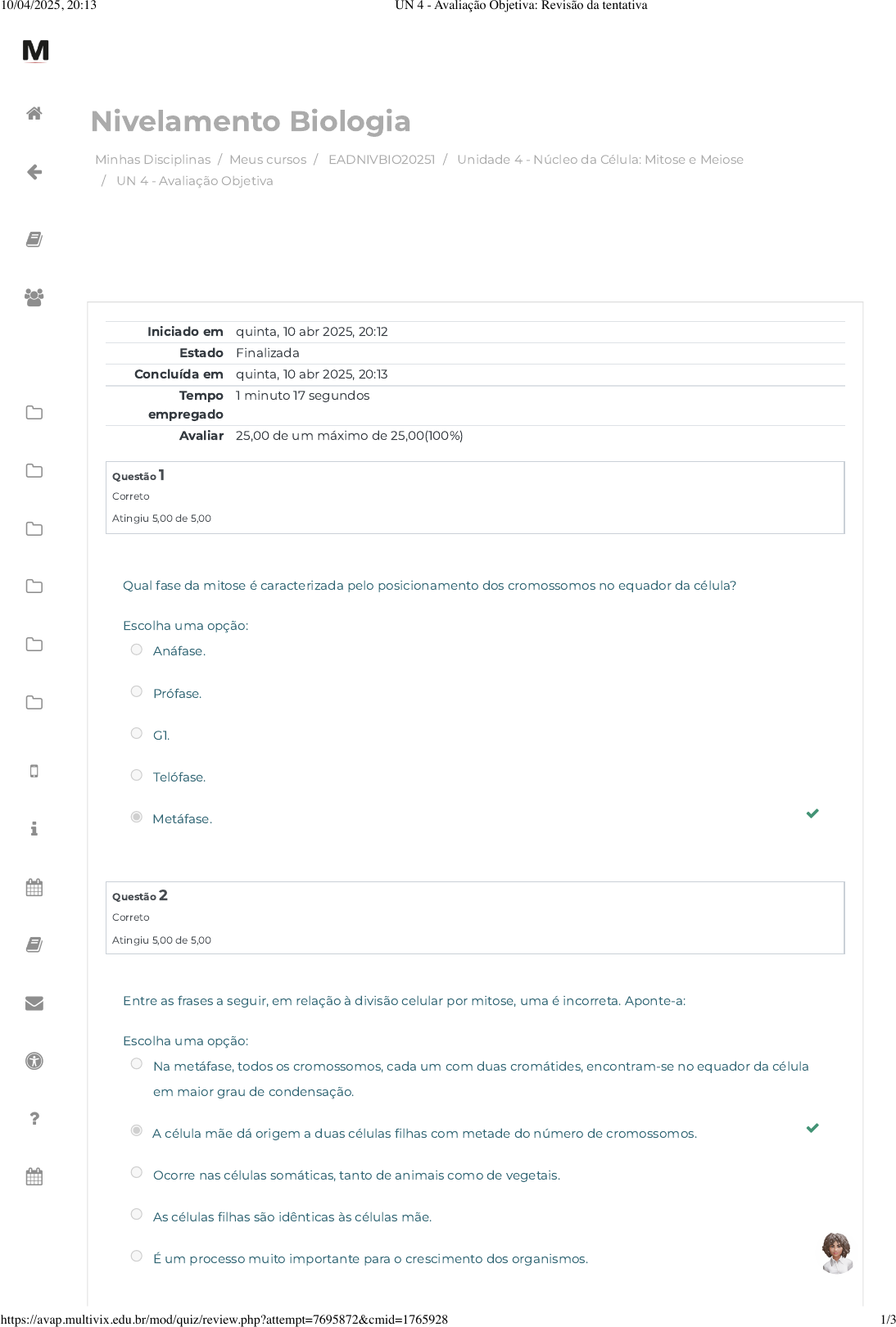 Minhas Disciplinas / Meus cursos / EADNIVBIO20251 / Unidade 4 - Núcleo da Célula: Mitose e Meiose / UN 4 - Avaliação Objetiva Nivelamento Biologia Iniciado em quinta, 10 abr 2025, 20:12 Estado Finalizada Concluída em quinta, 10 abr 2025, 20:13 Tempo empregado 1 minuto 17 segundos Avaliar 25,00 de um máximo de 25,00(100%) Questão 1 Correto Atingiu 5,00 de 5,00 Questão 2 Correto Atingiu 5,00 de 5,00 Qual fase da mitose é caracterizada pelo posicionamento dos cromossomos no equador da célula? Escolha uma opção: Anáfase. Prófase. G1. Telófase. Metáfase. Entre as frases a seguir, em relação à divisão celular por mitose, uma é incorreta. Aponte-a: Escolha uma opção: Na metáfase, todos os cromossomos, cada um com duas cromátides, encontram-se no equador da célula em maior grau de condensação. A célula mãe dá origem a duas células filhas com metade do número de cromossomos. Ocorre nas células somáticas, tanto de animais como de vegetais. As células filhas são idênticas às células mãe. É um processo muito importante para o crescimento dos organismos. 10/04/2025, 20:13 UN 4 - Avaliação Objetiva: Revisão da tentativa https://avap.multivix.edu.br/mod/quiz/review.php?attempt=7695872&cmid=1765928 1/3 https://avap.multivix.edu.br/my/ https://avap.multivix.edu.br/course/view.php?id=30859 https://avap.multivix.edu.br/course/view.php?id=30859§ion=5 https://avap.multivix.edu.br/mod/quiz/view.php?id=1765928 https://avap.multivix.edu.br/my/ https://avap.multivix.edu.br/course/view.php?id=30859 https://avap.multivix.edu.br/user/index.php?id=30859 https://avap.multivix.edu.br/course/view.php?id=30859§ion=1 https://avap.multivix.edu.br/course/view.php?id=30859§ion=2 https://avap.multivix.edu.br/course/view.php?id=30859§ion=3 https://avap.multivix.edu.br/course/view.php?id=30859§ion=4 https://avap.multivix.edu.br/course/view.php?id=30859§ion=5 https://avap.multivix.edu.br/course/view.php?id=30859§ion=6 https://avap.multivix.edu.br/hooks/portal/ https://avap.multivix.edu.br/mod/page/view.php?id=1252%2F%22%20target%3D%22_blank https://avap.multivix.edu.br/calendar/view.php/ https://avap.multivix.edu.br/local/staticpage/view.php?page=biblioteca https://multivix.edu.br/office-365/ https://multivix.edu.br/acessibilidade/ https://avap.multivix.edu.br/mod/page/view.php?id=7%2F%22%20target%3D%22_blank https://docs.google.com/forms/d/e/1FAIpQLSfyH1O0KRhpI8B0cFqDv3aXT41lziF0mULzRNTBk2x0miNkNA/viewform https://avap.multivix.edu.br/ https://avap.multivix.edu.br/ https://avap.multivix.edu.br/ https://avap.multivix.edu.br/ Questão 3 Correto Atingiu 5,00 de 5,00 Questão 4 Correto Atingiu 5,00 de 5,00 Questão 5 Correto Atingiu 5,00 de 5,00 Em relação ao processo de divisão celular, podemos afirmar que: Escolha uma opção: os óvulos e espermatozoides são produzidos por divisões mitóticas. a mitose consiste em duas divisões celulares sucessivas. durante a meiose não ocorre a permutação ou “crossing-over”. durante a mitose as cromátides irmãs não se separam. a meiose é um processo que dá origem a quatro células haploides. Sabemos que no final da mitose o citoplasma divide-se para formar duas células-filhas. O processo de divisão do citoplasma é denominado: Escolha uma opção: citocinese. fragmoplasto. prófase. telófase. cariocintese Marque a alternativa que indica uma função que pode ser atribuída diretamente ao núcleo da célula. Escolha uma opção: Sítio de realização da fotossíntese. Empacotamento, direcionamento e formação de vesículas de transporte que partem de uma célula para outra. organização e armazenamento de informações contidas no DNA. Sítio de realização da respiração celular. Digestão intracelular. 10/04/2025, 20:13 UN 4 - Avaliação Objetiva: Revisão da tentativa https://avap.multivix.edu.br/mod/quiz/review.php?attempt=7695872&cmid=1765928 2/3 https://avap.multivix.edu.br/my/ https://avap.multivix.edu.br/course/view.php?id=30859 https://avap.multivix.edu.br/user/index.php?id=30859 https://avap.multivix.edu.br/course/view.php?id=30859§ion=1 https://avap.multivix.edu.br/course/view.php?id=30859§ion=2 https://avap.multivix.edu.br/course/view.php?id=30859§ion=3 https://avap.multivix.edu.br/course/view.php?id=30859§ion=4 https://avap.multivix.edu.br/course/view.php?id=30859§ion=5 https://avap.multivix.edu.br/course/view.php?id=30859§ion=6 https://avap.multivix.edu.br/hooks/portal/ https://avap.multivix.edu.br/mod/page/view.php?id=1252%2F%22%20target%3D%22_blank https://avap.multivix.edu.br/calendar/view.php/ https://avap.multivix.edu.br/local/staticpage/view.php?page=biblioteca https://multivix.edu.br/office-365/ https://multivix.edu.br/acessibilidade/ https://avap.multivix.edu.br/mod/page/view.php?id=7%2F%22%20target%3D%22_blank https://docs.google.com/forms/d/e/1FAIpQLSfyH1O0KRhpI8B0cFqDv3aXT41lziF0mULzRNTBk2x0miNkNA/viewform https://avap.multivix.edu.br/ https://avap.multivix.edu.br/ https://avap.multivix.edu.br/ https://avap.multivix.edu.br/ ◀ UN 3 - Avaliação Objetiva Seguir para... Fale com o Tutor ▶ 10/04/2025, 20:13 UN 4 - Avaliação Objetiva: Revisão da tentativa https://avap.multivix.edu.br/mod/quiz/review.php?attempt=7695872&cmid=1765928 3/3 https://avap.multivix.edu.br/mod/quiz/view.php?id=1765927&forceview=1 https://avap.multivix.edu.br/mod/forum/view.php?id=1765929&forceview=1 https://avap.multivix.edu.br/my/ https://avap.multivix.edu.br/course/view.php?id=30859 https://avap.multivix.edu.br/user/index.php?id=30859 https://avap.multivix.edu.br/course/view.php?id=30859§ion=1 https://avap.multivix.edu.br/course/view.php?id=30859§ion=2 https://avap.multivix.edu.br/course/view.php?id=30859§ion=3 https://avap.multivix.edu.br/course/view.php?id=30859§ion=4 https://avap.multivix.edu.br/course/view.php?id=30859§ion=5 https://avap.multivix.edu.br/course/view.php?id=30859§ion=6 https://avap.multivix.edu.br/hooks/portal/ https://avap.multivix.edu.br/mod/page/view.php?id=1252%2F%22%20target%3D