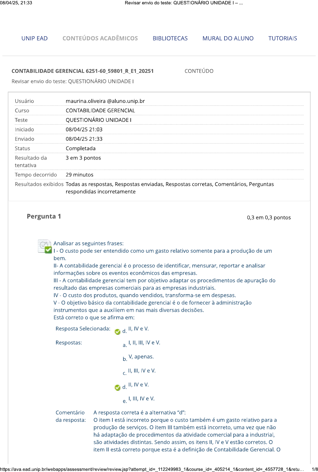 08/04/25, 21:33 Revisar envio do teste: QUESTIONÁRIO UNIDADE UNIP EAD CONTEÚDOS ACADÊMICOS BIBLIOTECAS MURAL DO ALUNO TUTORIAIS CONTABILIDADE GERENCIAL 6251-60_59801_R_E1_20251 CONTEÚDO Revisar envio do teste: QUESTIONÁRIO UNIDADE Usuário Curso CONTABILIDADE GERENCIAL Teste QUESTIONÁRIO UNIDADE Iniciado 08/04/25 21:03 Enviado 08/04/25 21:33 Status Completada Resultado da 3 em 3 pontos tentativa Tempo decorrido 29 minutos Resultados exibidos Todas as respostas, Respostas enviadas, Respostas corretas, Comentários, Perguntas respondidas incorretamente Pergunta 1 0,3 em 0,3 pontos Analisar as seguintes frases: - O custo pode ser entendido como um gasto relativo somente para a produção de um bem. A contabilidade gerencial é o processo de identificar, mensurar, reportar e analisar informações sobre os eventos econômicos das empresas. III A contabilidade gerencial tem por objetivo adaptar os procedimentos de apuração do resultado das empresas comerciais para as empresas industriais. IV O custo dos produtos, quando vendidos, transforma-se em despesas. V objetivo básico da contabilidade gerencial é o de fornecer à administração instrumentos que a auxiliem em nas mais diversas decisões. Está correto o que se afirma em: Resposta Selecionada: d. II, IV e V. Respostas: II, III, IV e V. a. b. V, apenas. C. II, III, IV e V. d. II, IV e V. I, III, IV e V. e. Comentário A resposta correta é a alternativa "d": da resposta: O item está incorreto porque o custo também é um gasto relativo para a produção de serviços. O item III também está incorreto, uma vez que não há adaptação de procedimentos da atividade comercial para a industrial, são atividades distintas. Sendo assim, os itens II, IV e V estão corretos. O item II está correto porque esta é a definição de Contabilidade Gerencial. O 1/808/04/25, 21:33 Revisar envio do teste: QUESTIONÁRIO UNIDADE - item IV está correto porque esse processo ocorre. O item V está correto porque o objetivo da Contabilidade Gerencial é esse. Pergunta 2 0,3 em 0,3 pontos A contabilidade gerencial deve fornecer informações econômicas aos seguintes usuários: Resposta Selecionada: Gerentes, funcionários e diretores. a. Respostas: Gerentes, funcionários e diretores. a. b. Bancos, clientes e fornecedores. Bancos, clientes e empresários. C. d. Diretores, acionistas e bancos. Fornecedores, administradores e sindicatos. e. Comentário A resposta correta é a alternativa "a": da resposta: A Contabilidade Gerencial é voltada para os usuários internos, para que tenham acesso amplo e facilitado à informação, de maneira rápida, detalhada, analítica e customizada para decisões sobre práticas operacionais e financeiras da empresa. Exemplos de usuários internos: corpo diretivo, administradores e gestores. Por sua vez, a Contabilidade Financeira é voltada principalmente aos usuários externos que, geralmente, só têm acesso às informações divulgadas pela empresa. Exemplos de usuários externos: governo, credores em geral, analistas de mercado de capitais. Apesar de a Contabilidade Financeira estar muito mais preocupada em atender aos usuários externos, ela também é utilizada pelos usuários internos. É o caso, por exemplo, do administrador que, com base nas demonstrações contábeis divulgadas pela Contabilidade Financeira, faz suas projeções ou altera uma prática operacional para melhorar o desempenho da empresa nos anos seguintes. Pergunta 3 0,3 em 0,3 pontos O processo contábil-financeiro (contabilidade financeira) está restrito aos requisitos obrigatórios de elaboração de relatórios por parte das autoridades, tais como o Conselho Federal de Contabilidade (CFC), o Comitê de Pronunciamento Contábil (CPC), a Comissão de Valores Mobiliários (CVM), a Receita Federal do Ministério da Fazenda, dentre outras. Logo, a contabilidade financeira é direcionada por regras, regulamentos ditados por tais entidades. Dentre os relatórios destacam-se: I- Balanço Patrimonial, Demonstração do Resultado e Relatório de Custo. II-Demonstração do Resultado, Demonstração de Desempenho Setorial e Demonstração do 2/808/04/25, 21:33 Revisar envio do teste: QUESTIONÁRIO UNIDADE Valor Adicionado. III-Demonstração de Resultado, Balanço Patrimonial e Orçamentos. IV-Demonstração das Mutações do PL, Demonstração do Fluxo de Caixa e Demonstração do Valor Adicionado. V-Relatório de Custos, Demonstração de Fluxo de Caixa e Demonstração das Mutações do PL. É o correto o que se afirma em: Resposta Selecionada: b. IV, somente. Respostas: I, II, III e IV. a. b. IV, somente. C. III, IV e V. d. I, II, IV e V. e. V, somente. Comentário A resposta correta é a alternativa "b": da resposta: A contabilidade financeira atende a legislação, portanto os relatórios exigidos são Balanço Patrimonial; Demonstração do Resultado; Demonstração da Mutação do Patrimônio Líquido; Demonstração do Fluxo de Caixa; (*) e Demonstração do Valor Adicionado(*), os dois últimos por força da Lei n° 11.638/07. Dentre esses relatórios exigidos, os que se destacam são os mencionados na afirmativa IV: Demonstração das Mutações do PL, Demonstração do Fluxo de Caixa e Demonstração do Valor Adicionado. Os demais relatórios mencionados nas outras afirmativas atendem a Contabilidade Gerencial, ou seja, Relatório de Custos e Demonstração de Desempenho Setorial Pergunta 4 0,3 em 0,3 pontos Entende-se que o que diferencia um contador gerencial de um contador financeiro, nada mais é do que a "mentalidade gerencial" ou seja, o conhecimento de como "tratar", refinar e apresentar de maneira clara, resumida e operacional dados esparsos contidos nos registros da contabilidade financeira, de custos etc. Sendo assim, são atitudes de um contador gerencial: I- Explicar as divergências apontadas entre o orçamento e o gasto realizado para a produção de um determinado produto. II- Apurar as variações entre o custo orçado