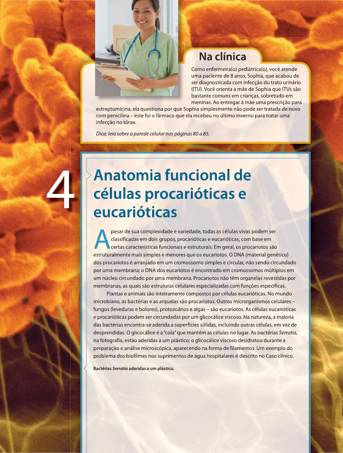 Na clínica Como pediátrica(o), você atende uma paciente de 8 anos, Sophia, que acabou de ser diagnosticada com infecção do trato urinário (ITU). Você orienta a mãe de Sophia que ITUs são bastante comuns em crianças, sobretudo em meninas. Ao entregar à mãe uma prescrição para estreptomicina, ela questiona por que Sophia simplesmente não pode ser tratada de novo com penicilina este foi o fármaco que ela recebeu no último inverno para tratar uma infecção no tórax. Dica: leia sobre a parede celular nas páginas 80 a 85. Anatomia funcional de células procarióticas e eucarióticas pesar de sua complexidade e variedade, todas as células vivas podem ser A classificadas em dois grupos, procarióticas e eucarióticas, com base em certas características funcionais e estruturais. Em geral, os procariotos são estruturalmente mais simples e menores que os eucariotos. DNA (material genético) dos procariotos é arranjado em um cromossomo simples e circular, não sendo circundado por uma membrana; o DNA dos eucariotos é encontrado em cromossomos múltiplos em um núcleo circundado por uma membrana. Procariotos não têm organelas revestidas por membranas, as quais são estruturas celulares especializadas com funções específicas. Plantas e animais são inteiramente compostos por células eucarióticas. No mundo microbiano, as bactérias e as arqueias são procariotos. Outros microrganismos celulares fungos (leveduras e bolores), protozoários e algas são eucariotos. As células eucarióticas e procarióticas podem ser circundadas por um glicocálice viscoso. Na natureza, a maioria das bactérias encontra-se aderida a superfícies sólidas, incluindo outras células, em vez de desprendidas. glicocálice é que mantém as células no lugar. As bactérias Serratia, na fotografia, estão aderidas a um plástico; o glicocálice viscoso desidratou durante a preparação e análise microscópica, aparecendo na forma de filamentos. Um exemplo do problema dos biofilmes nos suprimentos de água hospitalares é descrito no Caso clínico. Bactérias Serratia aderidas a um plástico.CAPÍTULO 4 Anatomia funcional de células procarióticas e eucarióticas 73 Comparando as células 1. Seu DNA é encontrado no núcleo das células, que é sepa- rado do citoplasma por uma membrana nuclear, em cro- procarióticas e eucarióticas: mossomos múltiplos. visão geral 2. Seu DNA está consistentemente associado a proteínas cro- mossômicas, denominadas histonas, e a outras proteínas. OBJETIVO DO APRENDIZADO 3. Eles possuem diversas organelas revestidas por membranas, 4-1 Comparar a estrutura celular de procariotos e euca- incluindo mitocôndrias, retículo endoplasmático, aparelho riotos. de Golgi, lisossomos e, às vezes, cloroplastos. 4. Suas paredes celulares, quando presentes, são quimica- Procariotos e eucariotos contêm ácidos nucleicos, proteínas, mente simples. lipídeos e carboidratos. Eles usam os mesmos tipos de reações químicas para metabolizar o alimento, formar proteínas e arma- 5. A divisão celular normalmente envolve a mitose, na qual zenar energia. É principalmente a estrutura das paredes celulares os cromossomos são replicados e um conjunto idêntico é distribuído em cada um dos dois núcleos. A divisão do ci- e membranas, e a ausência de organelas (estruturas celulares es- pecializadas que possuem funções específicas) que distinguem toplasma e de outras organelas segue-se a esse processo, de procariotos de eucariotos. As principais características diferen- modo que haverá a produção de duas células idênticas. ciais dos procariotos (derivado do termo grego que significa TESTE SEU CONHECIMENTO pré-núcleo) são as seguintes: Qual é a principal característica que diferencia procariotos de 1. Em geral, seu DNA não está envolto por membrana e con- eucariotos? 4-1 siste em um único cromossomo, arranjado de forma circu- lar. Gemma obscuriglobus tem uma membrana dupla cir- Caso clínico: detectando a infecção cundando o seu núcleo. (Algumas bactérias, como Vibrio cholerae, possuem dois cromossomos, ao passo que outras Irene Matthews, enfermeira responsável pelo controle de possuem um cromossomo com arranjo linear.) infecções, vive um dilema. Três pacientes em seu hospital 2. Seu DNA não está associado com histonas (proteínas cro- contraíram septicemia bacteriana pós-procedimento. Todos mossômicas especiais, encontradas em eucariotos); outras apresentaram febre e pressão arterial perigosamente baixa. proteínas estão associadas ao DNA. Os pacientes estão em diferentes unidades e foram subme- tidos a procedimentos distintos. O primeiro paciente, Joe, 3. Em geral, não possuem organelas. Avanços na área de operário de obras de 32 anos de idade, está se recuperando de microscopia revelaram a existência de algumas organe- uma cirurgia no manguito rotador. Ele está com saúde relativa- las envoltas por membrana (p. ex., algumas inclusões). mente boa. A segunda paciente, Jessie, estudante de 16 anos No entanto, os procariotos não apresentam outras organe- em tratamento intensivo, está em condições críticas após um las revestidas por membrana, como núcleo, mitocôndria e acidente de carro. Ela está sob ventilação mecânica e não con- cloroplastos. segue respirar sem auxílio de aparelhos. A terceira paciente, Maureen, avó de 57 anos, está se recuperando de uma cirurgia 4. Suas paredes celulares quase sempre contêm o polissacarí- de revascularização miocárdica. Até onde Irene consegue dizer, deo complexo peptideoglicano. a única coisa que esses pacientes possuem em comum é 5. Normalmente se dividem por fissão binária, de forma que agente infeccioso Klebsiella pneumoniae. o DNA é copiado, e a célula se divide em duas. Isso envolve De que maneira três pacientes, em diferentes unidades menos estruturas e processos do que a divisão celular eu- de um hospital, contraíram Klebsiella pneumoniae? Leia cariótica. mais p