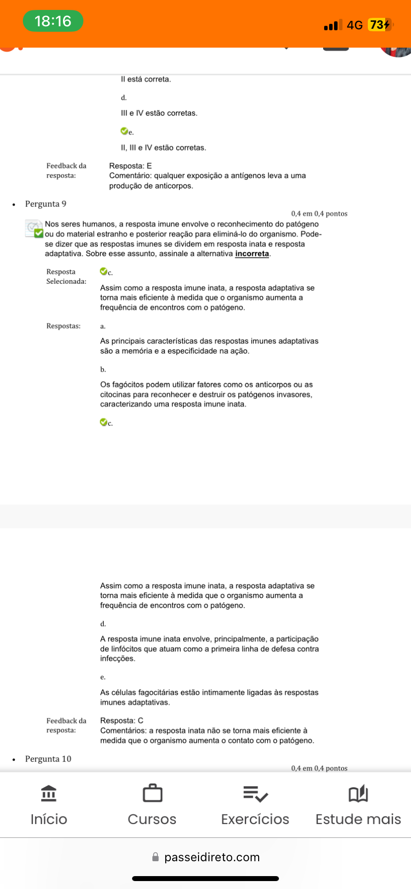 18:16 4G 734 II está correta. d. III e IV estão III e IV estão corretas. Feedback da Resposta: E resposta: Comentário: qualquer exposição a leva a uma produção de anticorpos. Pergunta 9 0,4 em 0,4 pontos Nos seres humanos, a resposta imune envolve reconhecimento do patógeno ou do material estranho e posterior reação para eliminá-lo do organismo. Pode- se dizer que as respostas imunes se dividem em resposta inata e resposta adaptativa. Sobre esse assunto, assinale a alternativa incorreta. Resposta c. Selecionada: Assim como a resposta imune inata, a resposta adaptativa se torna mais eficiente à medida que organismo aumenta a frequência de encontros com patógeno. Respostas: a. As principais características das respostas imunes adaptativas são a memória e a especificidade na ação. b. Os podem utilizar fatores como os anticorpos ou as citocinas para reconhecer e destruir os patógenos invasores, caracterizando uma resposta imune inata. Assim como a resposta imune inata, a resposta adaptativa se torna mais eficiente à medida que organismo aumenta a frequência de encontros com patógeno. d. A resposta imune inata envolve, principalmente, a participação de linfócitos que atuam como a primeira linha de defesa contra infecções. e. As células fagocitárias estão intimamente ligadas às respostas imunes adaptativas. Feedback da Resposta: C resposta: Comentários: a resposta inata não se torna mais eficiente à medida que organismo aumenta contato com patógeno. Pergunta 10 0,4 em 0,4 pontos Início Cursos Exercícios Estude mais passeidireto.com