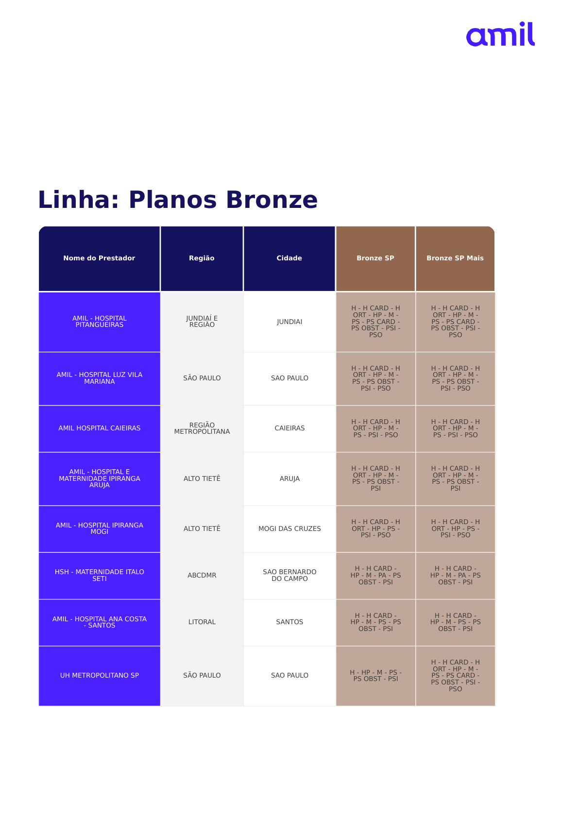Sempre utilize a versão mais atualizada deste material. Data da impressão: 20/02/2025 Página 1 de 56 Resumo da Rede Linha: Planos Bronze Nome do Prestador Região Cidade Bronze SP Bronze SP Mais AMIL - HOSPITAL PITANGUEIRAS JUNDIAÍ E REGIÃO JUNDIAI H - H CARD - H ORT - HP - M - PS - PS CARD - PS OBST - PSI - PSO H - H CARD - H ORT - HP - M - PS - PS CARD - PS OBST - PSI - PSO AMIL - HOSPITAL LUZ VILA MARIANA SÃO PAULO SAO PAULO H - H CARD - H ORT - HP - M - PS - PS OBST - PSI - PSO H - H CARD - H ORT - HP - M - PS - PS OBST - PSI - PSO AMIL HOSPITAL CAIEIRAS REGIÃO METROPOLITANA CAIEIRAS H - H CARD - H ORT - HP - M - PS - PSI - PSO H - H CARD - H ORT - HP - M - PS - PSI - PSO AMIL - HOSPITAL E MATERNIDADE IPIRANGA ARUJA ALTO TIETÊ ARUJA H - H CARD - H ORT - HP - M - PS - PS OBST - PSI H - H CARD - H ORT - HP - M - PS - PS OBST - PSI AMIL - HOSPITAL IPIRANGA MOGI ALTO TIETÊ MOGI DAS CRUZES H - H CARD - H ORT - HP - PS - PSI - PSO H - H CARD - H ORT - HP - PS - PSI - PSO HSH - MATERNIDADE ITALO SETI ABCDMR SAO BERNARDO DO CAMPO H - H CARD - HP - M - PA - PS OBST - PSI H - H CARD - HP - M - PA - PS OBST - PSI AMIL - HOSPITAL ANA COSTA - SANTOS LITORAL SANTOS H - H CARD - HP - M - PS - PS OBST - PSI H - H CARD - HP - M - PS - PS OBST - PSI UH METROPOLITANO SP SÃO PAULO SAO PAULO H - HP - M - PS - PS OBST - PSI H - H CARD - H ORT - HP - M - PS - PS CARD - PS OBST - PSI - PSO Sempre utilize a versão mais atualizada deste material. Data da impressão: 20/02/2025 Página 2 de 56 Nome do Prestador Região Cidade Bronze SP Bronze SP Mais AMIL - HOSPITAL CARLOS CHAGAS ALTO TIETÊ GUARULHOS H - H CARD - H ORT - HP - M - PS OBST H - H CARD - H ORT - HP - M - PS OBST AP - HOSPITAL SANTA HELENA SAO BERNARDO - ABC CIRURGICO ABCDMR SAO BERNARDO DO CAMPO H - H CARD - H ORT - PS - PS CARD H - H CARD - H ORT - PS - PS CARD AP - HOSPITAL SANTA HELENA SAO BERNARDO - ABC CIRURGICO ABCDMR SAO BERNARDO DO CAMPO H - H CARD - H ORT - PS - PS CARD H - H CARD - H ORT - PS - PS CARD AP - HSH - HOSPITAL SANTA HELENA ABCDMR SANTO ANDRE H - H CARD - H ORT - PS - PSO H - H CARD - H ORT - PS - PSO AMIL - HOSPITAL VITORIA ANALIA FRANCO SÃO PAULO SAO PAULO H - M - PS - PS OBST - PSO H - M - PS - PS OBST - PSO AMIL ESPACO SAUDE TATUAPE SÃO PAULO SAO PAULO PA - PS - PSI - PSO PA - PS - PSI - PSO AMIL - HOSPITAL PAULISTANO SÃO PAULO SAO PAULO H - H CARD - H ORT H - H CARD - H ORT AMIL UNIDADE AVANCADA CARLOS CHAGAS ALTO TIETÊ GUARULHOS PS - PSI - PSO PS - PSI - PSO AMIL - ANA COSTA ENSEADA - GUARUJA LITORAL GUARUJA PA - PS - PSI PA - PS - PSI AMIL - HOSPITAL LUZ SANTO AMARO SÃO PAULO SAO PAULO PS - PSI - PSO PS - PSI - PSO AMIL LUZ BUTANTA SÃO PAULO SAO PAULO PS - PSI - PSO PS - PSI - PSO AMIL - ANA COSTA - PRAIA GRANDE LITORAL PRAIA GRANDE PS - PSI PS - PSI AMIL - ANA COSTA - SAO VICENTE LITORAL SAO VICENTE PS - PSI PS - PSI OPHTHAL HOSPITAL ESPECIALIZADO LTDA SÃO PAULO SAO PAULO H - PS H - PS Sempre utilize a versão mais atualizada deste material. Data da impressão: 20/02/2025 Página 3 de 56 Nome do Prestador Região Cidade Bronze SP Bronze SP Mais AMIL ESPACO SAUDE SANTANA SÃO PAULO SAO PAULO PA PA HOSPITAL DIA OFTALMOLOGICO JUNDIAÍ E REGIÃO JUNDIAI H H AP - PRONTO ATENDIMENTO GUAPITUBA - MAUA ABCDMR MAUA PA PA AP - PRONTO ATENDIMENTO LUCAS NOGUEIRA GARCEZ ABCDMR SAO BERNARDO DO CAMPO PA PA AMIL - CENTRO MEDICO AMA - UNIDADE ITAQUAQUECETUBA GRU E ALTO TIETÊ ITAQUAQUECETUBA PA PA AMIL - ANA COSTA - CUBATAO LITORAL CUBATAO PA PA CASA DE SAUDE CAMPINAS E REGIÃO CAMPINAS X H - H CARD - H ORT - HP - M - PS - PS CARD - PS OBST - PSI ASM - HOSPITAL MADRE THEODORA CAMPINAS CAMPINAS E REGIÃO CAMPINAS X H - H CARD - H ORT - HP - M - PS - PS OBST - PSI - PSO HOSPITAL GABRIEL CIANFLONE GRU E ALTO TIETÊ SANTA ISABEL X H - H CARD - H ORT - HP - M - PS - PS OBST - PSI HOSPITAL E MATERNIDADE CELSO PIERRO CAMPINAS E REGIÃO CAMPINAS X H - H CARD - HP - M - PS - PS OBST - PSI - PSO HOSPITAL IMACULADA CONCEICAO DE MAUA ABCDMR MAUA X H - HP - M - PS - PS OBST - PSI - PSO IRMANDADE DA SANTA CASA DE LOUVEIRA JUNDIAÍ E REGIÃO LOUVEIRA X H - H CARD - HP - M - PS - PS OBST - PSI HOSPITAL YES REGIÃO METROPOLITANA ITAPEVI X H - H ORT - PS - PS OBST - PSI - PSO Sempre utilize a versão mais atualizada deste material. Data da impressão: 20/02/2025 Página 4 de 56 Nome do Prestador Região Cidade Bronze SP Bronze SP Mais IRMAND. DE SANTA CASA DE MISERICORDIA DE VALINHOS CAMPINAS E REGIÃO VALINHOS X H - H CARD - H ORT - HP - M - PS SANTA CASA DE VINHEDO JUNDIAÍ VINHEDO X H - HP - M - PS - PS OBST - PSI HOSPITAL SANTA MARIA DE SUZANO GRU E ALTO TIETÊ SUZANO X H - M - PS - PS OBST - PSI - PSO HOSPITAL SANTA CLARA SÃO PAULO SAO PAULO X H - H CARD - H ORT - PS - PSI - PSO SANTA CASA DE MISERICORDIA DE GUARAREMA GRU E ALTO TIETÊ GUARAREMA X H - HP - M - PS - PSI HOSPITAL CRUZEIRO DO SUL - ITAPEVI REGIÃO METROPOLITANA ITAPEVI X H - H CARD - H ORT - HP - PA CENTRO INFANTIL DE INVEST HEMAT DR D A BOLDRINI CAMPINAS E REGIÃO CAMPINAS X H - H ORT - HP - PS - PSI ASSOCIACAO HOSPITALAR CONEGO DOMENICO RAGONI LITORAL GUARUJA X H - H CARD - H ORT - HP HOSPITAL NOVE DE JULHO ALPHAVILLE REGIÃO METROPOLITANA BARUERI X PA - PS - PS CARD - PSI HOSPITAL SAO FRANCISCO COTIA REGIÃO METROPOLITANA COTIA X H - HP - PS - PSI HOSPITAL CENTRAL SAO CAETANO ABCDMR SAO CAETANO DO SUL X H - H CARD - H ORT - M GRAACC-GRUPO DE APOIO AO ADOLESCENTE E A CRIANCA COM CANCER SÃO PAULO SAO PAULO X H - H ORT - PS OPHTHAL SERVICOS ESPECIALIZADOS EM OFTALMOLOGIA ABCDMR SAO BERNARDO DO CAMPO X H - PA - PS Sempre utilize a versão mais atualizada deste material. Data da impressão: 20/02/2025 Página 5 de 56 PS – Pronto Socorro PS CARD – Pronto Socorro Cardiológico PS OBST – Pronto Socorro Obstétrico PSI – Pronto Socorro Infantil PSO – Pronto Socorro Ortopédico * – Opção QP Nome do Prestador Região Cidade Bronze SP Bronze SP Mais HOSPITAL E MAT. NOSSA SENHORA DE FATIMA - OSASCO REGIÃO METROPOLITANA OSASCO X H - PS - PSO OPHTHAL SERVICOS ES