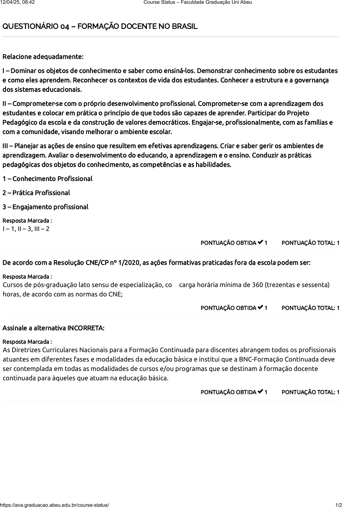 QUESTIONÁRIO 04 – FORMAÇÃO DOCENTE NO BRASIL PONTUAÇÃO TOTAL: 1PONTUAÇÃO OBTIDA 1 Relacione adequadamente: I – Dominar os objetos de conhecimento e saber como ensiná-los. Demonstrar conhecimento sobre os estudantes e como eles aprendem. Reconhecer os contextos de vida dos estudantes. Conhecer a estrutura e a governança dos sistemas educacionais. II – Comprometer-se com o próprio desenvolvimento profissional. Comprometer-se com a aprendizagem dos estudantes e colocar em prática o princípio de que todos são capazes de aprender. Participar do Projeto Pedagógico da escola e da construção de valores democráticos. Engajar-se, profissionalmente, com as famílias e com a comunidade, visando melhorar o ambiente escolar. III – Planejar as ações de ensino que resultem em efetivas aprendizagens. Criar e saber gerir os ambientes de aprendizagem. Avaliar o desenvolvimento do educando, a aprendizagem e o ensino. Conduzir as práticas pedagógicas dos objetos do conhecimento, as competências e as habilidades. 1 – Conhecimento Profissional 2 – Prática Profissional 3 – Engajamento profissional Resposta Marcada : I – 1, II – 3, III – 2 PONTUAÇÃO TOTAL: 1PONTUAÇÃO OBTIDA 1 De acordo com a Resolução CNE/CP nº 1/2020, as ações formativas praticadas fora da escola podem ser: Resposta Marcada : Cursos de pós-graduação lato sensu de especialização, com carga horária mínima de 360 (trezentas e sessenta) horas, de acordo com as normas do CNE; PONTUAÇÃO TOTAL: 1PONTUAÇÃO OBTIDA 1 Assinale a alternativa INCORRETA: Resposta Marcada : As Diretrizes Curriculares Nacionais para a Formação Continuada para discentes abrangem todos os profissionais atuantes em diferentes fases e modalidades da educação básica e institui que a BNC-Formação Continuada deve ser contemplada em todas as modalidades de cursos e/ou programas que se destinam à formação docente continuada para àqueles que atuam na educação básica. 12/04/25, 08:42 Course Status – Faculdade Graduação Uni Abeu https://ava.graduacao.abeu.edu.br/course-status/ 1/2 5 / 5 PONTUAÇÃO TOTAL: 1PONTUAÇÃO OBTIDA 1 As políticas públicas voltadas para a formação inicial docente no Brasil têm como objetivo: Resposta Marcada : Promover a construção dos fundamentos científicos e sociais necessários para a profissão docente, além de articular teoria e prática pedagógica. PONTUAÇÃO TOTAL: 1PONTUAÇÃO OBTIDA 1 Complete adequadamente: “De acordo com o art. 11 da Lei nº 13.415, de 16 de fevereiro de 2017, após a __________ da BNCC, as instituições de ensino responsáveis pela __________ inicial dos professores teriam o prazo de dois anos para a adequação curricular __________.” Resposta Marcada : Homologação, formação, docente. Total de Pontos 12/04/25, 08:42 Course Status – Faculdade Graduação Uni Abeu https://ava.graduacao.abeu.edu.br/course-status/ 2/2