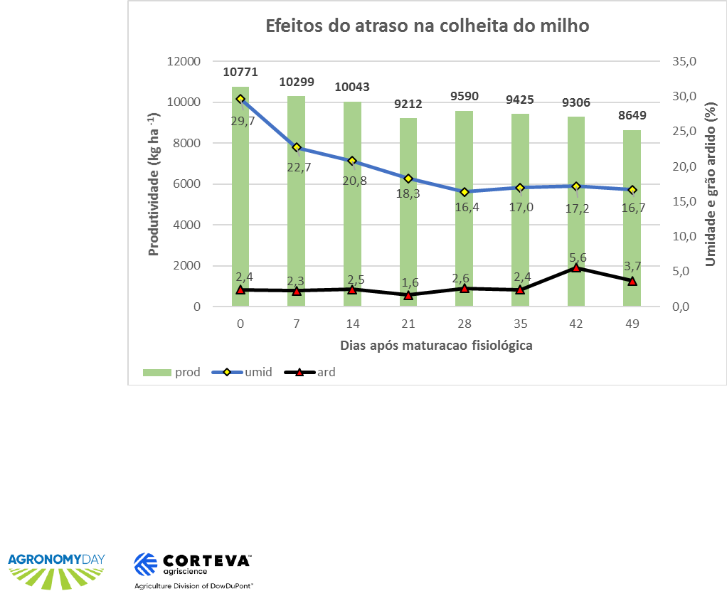 COMUNICADO TÉCNICO – AGRONOMIA TORRE LESTE EFEITOS DO ATRASO NA COLHEITA DO MILHO Nesta safrinha 2019, tivemos um bom desenvolvimento de lavouras na fase vegetativa, com chuvas regulares na maioria das regiões produtoras. No estádio de enchimento de grãos houve um período de falta de chuva em algumas regiões, prejudicando a expressão de todo potencial das lavouras Essas condições de clima que ocorrem nos estádios fenológicos antecedentes á colheita do milho interferem com grande peso na manutenção da máxima produtividade a campo e também para a qualidade desses grãos. Nos últimos dias tivemos o retorno de chuvas e mudança brusca de temperatura na maioria das regiões produtoras. No gráfico abaixo podemos observar que após a maturação fisiológica, com a permanência prolongada dos grãos no campo, há uma visível perda de produtividade, em média 43 kg ha/dia. Fonte: Ronaldo gonzaga (Adaptado de Kochinski et al; 2011). COMUNICADO TÉCNICO – AGRONOMIA TORRE LESTE Como pudemos observar, o atraso na colheita do milho (em relação á maturação fisiológica) possui relação direta com a produtividade final e percentagem de grãos ardidos, que são os fatores mais perceptíveis ao agricultor. Mas essa relação direta também se estende para colmos exauridos, colmos quebrados e acamados, incidência de espigas com podridões (diplodia, fusarium e giberela) e ainda grãos com Penicillium sp. e micotoxinas. Quais são as práticas a serem utilizadas para minimizar perdas de produtividade por atraso na colheita e redução de grãos ardidos em milho: - Rotação de culturas - Sementes certificadas com qualidade sanitária comprovada - Semeadura de genótipos de milho com grãos de melhor qualidade - Uso da população de plantas recomendada, evitando altas densidades - Se possível escalonar semeadura para haver colheita escalonada evitando exposição prolongada no campo. - Manejo fitossanitário de ervas daninhas e principalmente de doenças (folha, colmo e espiga) evitando exaurimento precoce de colmo - Utilizar híbridos com traits eficazes no manejo de insetos que possam danificar colmo e ou espiga (lagartas na espiga por exemplo) - Realizar a colheita o mais próximo da maturação fisiológica - Processo de secagem e armazenamento eficiente Referências: Kochinski, E. G., Tsukahara, R. Y., & Fialho, W. M. B. (2011). Efeito do atraso na colheita sobre os componentes de produção de milho. XVII Congresso Brasileiro de Agrometeorologia – 18 a 21 de Julho de 2011 – Guarapari-ES.