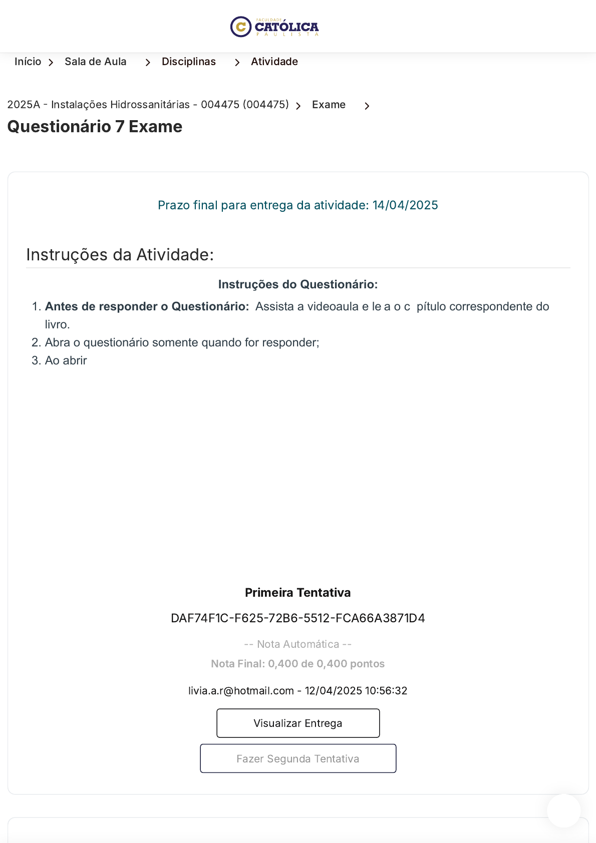 Início 〉 Sala de Aula 〉 Disciplinas 〉 Atividade 2025A - Instalações Hidrossanitárias - 004475 (004475) 〉 Exame 〉 Questionário 7 Exame Instruções da Atividade: Prazo final para entrega da atividade: 14/04/2025 Instruções do Questionário: 1. Antes de responder o Questionário: Assista a videoaula e leia o capítulo correspondente do livro. 2. Abra o questionário somente quando for responder; 3. Ao abrir o questionário você terá 4 questões para responder; 4. Leia com calma todas as questões e entenda o que pede a questão: se pede a incorreta, a correta e qual o tema da questão; 5. Lembre-se de Clicar no botão "Enviar"; 6. Você tem duas tentativas para fazer o teste, a segunda tentativa é opcional; 7. Lembre-se que as respostas mudam de lugar em cada tentativa; 8. As respostas corretas só aparecem após o envio da segunda tentativa; 9. O sistema considera a maior nota entre as duas tentativas; 10. Lembre-se que na segunda tentativa zera TODAS as questões, inclusive as que você acertou na primeira tentativa. Bons estudos! Primeira Tentativa DAF74F1C-F625-72B6-5512-FCA66A3871D4 -- Nota Automática -- Nota Final: 0,400 de 0,400 pontos livia.a.r@hotmail.com - 12/04/2025 10:56:32 Visualizar Entrega Fazer Segunda Tentativa https://ava.uca.edu.br/aluno/sala-de-aula/disciplina/modulo/atividade/328997 https://ava.uca.edu.br/aluno/sala-de-aula/disciplina/modulo/atividade/328997 https://ava.uca.edu.br/aluno/sala-de-aula/disciplina https://ava.uca.edu.br/aluno/sala-de-aula/disciplina/modulo/atividade/:id/:nome https://api.whatsapp.com/send?phone=5514988263000&text=Suporte javascript:void(0); Perguntas Pergunta 1. Pergunta 2. Pergunta 3. Pergunta 4. pontos: 0,100Pergunta 1. O projeto técnico ao ser protocolado no Corpo de Bombeiros, deve estar composto por diversas documentações. Portanto, é correto afirmar: Múltipla Escolha: A. Memorial básico da construção: descrição dos processos industriais, matérias-primas e etc. B. Memorial de cálculo: documento que e expõe resumidamente as medidas de segurança contra incêndio e pânico adotadas na edificação de acordo com as suas respectivas normas C. Memorial industrial de segurança contra incêndio: documento com a descrição das características estruturais da edificação ou área de risco D. Formulário de segurança contra incêndio de projeto técnico: documento que contém os dados básicos da edificação ou área de risco, os signatários e as medidas de segurança contra incêndio previstas nas normas E. Procuração do proprietário: instrumento emitido por meio de conselho de classe do profissional para a comprovação de sua responsabilidade técnica Avaliação https://api.whatsapp.com/send?phone=5514988263000&text=Suporte javascript:void(0); pontos: 0,100Pergunta 2. Considera-se como altura da edificação a distância vertical entre o piso mais alto e o acesso ou nível de descarga da edificação. Entretanto, não se considera: Múltipla Escolha: A. O pavimento superior da unidade dúplex de uso residencial unifamiliar B. Mezaninos cuja área ultrapasse 1/3 da área do pavimento onde se situa C. Os subsolos destinados a estacionamentos D. Os subsolos destinados a casa de máquinas E. Pavimentos superiores destinados a unidades autônomas Nota Avaliada: 0,100 de 0,100 Avaliação Nota Avaliada: 0,100 de 0,100 https://api.whatsapp.com/send?phone=5514988263000&text=Suporte javascript:void(0); pontos: 0,100Pergunta 3. Considera-se como área da edificação o somatório em metros quadrados da área a construir e da área construída da edificação. No cálculo da área a ser protegida contra as medidas de segurança contra incêndio, não serão computados: Múltipla Escolha: A. Projeção de coberturas e beirais e telhado com até 5 m de projeção B. Escadas não enclausuradas C. Coberturas de bombas de combustível, desde que não sejam utilizadas para outros fins e sejam abertas lateralmente em pelo menos 30% do perímetro D. Telheiros com laterais abertas destinados à proteção de utensílios desde que não tenham área superior a 10 m E. Passagens cobertas com largura máxima de 5 m, com laterais abertas destinadas apenas à circulação de pessoas ou mercadorias Avaliação Nota Avaliada: 0,100 de 0,100 https://api.whatsapp.com/send?phone=5514988263000&text=Suporte javascript:void(0); pontos: 0,100Pergunta 4. O projeto técnico deve ser utilizado para apresentação das medidas de segurança contra incêndio das edificações e áreas de risco. À respeito da sua aplicação, é incorreto afirmar: Múltipla Escolha: A. Edificações que possuem proteção por chuveiro automático, controle de fumaça, sistema de detecção de incêndio e de espuma de resfriamento B. Edificações existentes que possuem interligação entre blocos por meio de passarelas ou passadiço protegido no mesmo lote ou entre edificações vizinhas C. Edificações com necessidade comprovada de separação entre edificações e áreas de risco D. Edificação ou área de risco que possuir área construída maior que 500 m² com mais de três pavimentos ou área construída maior que 1000 m² com mais de seis metros de altura E. Para fins de cômputo de quantidade de pavimentos, desconsidera-se ou subsolos usados exclusivamente para estacionamento de veículos Fechar Visualização Avaliação Nota Avaliada: 0,100 de 0,100 https://api.whatsapp.com/send?phone=5514988263000&text=Suporte javascript:void(0); 〈 Voltar aos Módulos 〈 Anterior Próxima 〉 Faculdade Católica Paulista Contato Endereço Avenida Cristo Rei, 305 – Banzato Marília, São Paulo – CEP: 17515-200 Horário De Funcionamento Segunda a quinta, das 8:00 às 20:00 horas As sextas, das 8:00 às 18:00 horas. WhatsApp : (14) 9.8826-3000 Telefone Sede: (14) 3422-1815 Central de Atendimento: 0800 664 5583 E-mail : secretaria@uca.edu.br https://www.instagram.com/faculdadecatolicaead/ https://facebook.com/ucaead https://www.youtube.com/@UcaEduBr https: