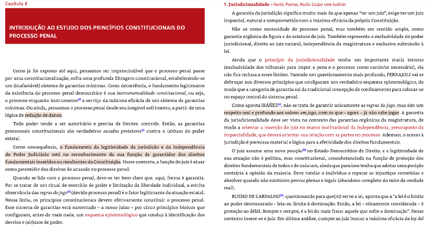 Capítulo 1. Jurisdicionalidade Nulla Poena, Nulla Culpa sine ludicio A garantia da jurisdição significa muito mais do que apenas "ter um juiz", exige ter um juiz imparcial, natural e comprometido com a máxima eficácia da própria Constituição. INTRODUÇÃO AO ESTUDO DOS PRINCÍPIOS CONSTITUCIONAIS DO Não só como necessidade do processo penal, mas também em sentido amplo, como PROCESSO PENAL garantia orgânica da figura e do estatuto do juiz. Também representa a exclusividade do poder jurisdicional, direito ao juiz natural, independência da magistratura e exclusiva submissão à lei. Ainda que o princípio da jurisdicionalidade tenha um importante matiz interno (exclusividade dos tribunais para impor a pena e o processo como caminho necessário), ela Como já foi exposto até aqui, pensamos ser imprescindível que o processo penal passe não fica reclusa a esses limites. Fazendo um questionamento mais profundo, FERRAJOLI vai se por uma constitucionalização, sofra uma profunda filtragem constitucional, estabelecendo-se debruçar nos diversos princípios que configuram um verdadeiro esquema epistemológico, de um (inafastável) sistema de garantias mínimas. Como decorrência, fundamento legitimante modo que a categoria de garantia sai da tradicional concepção de confinamento para colocar-se da existência do processo penal democrático é sua instrumentalidade constitucional, ou seja, no espaço central do sistema penal. o processo enquanto a serviço da máxima eficácia de um sistema de garantias mínimas. Ou ainda, pensamos o processo penal desde seu inegável sofrimento, a partir de uma Como aponta não se trata de garantir unicamente as regras do jogo, mas sim um lógica de redução de danos. respeito real e profundo aos valores em jogo, com os que agora já não cabe jogar. A garantia da jurisdicionalidade deve ser vista no contexto das garantias orgânicas da magistratura, de Todo poder tende a ser autoritário e precisa de limites, controle. Então, as garantias modo a orientar a inserção do juiz no marco institucional da independência, pressuposto da processuais constitucionais são verdadeiros escudos contra o (ab)uso do poder imparcialidade, que deverá orientar sua relação com as partes no processo. Ademais, o acesso à estatal. jurisdição é premissa material e lógica para a efetividade dos direitos Como consequência, o fundamento da legitimidade da jurisdição e da independência o juiz assume uma nova no Estado Democrático de Direito, e a legitimidade de do Poder Judiciário está no reconhecimento da sua função de garantidor dos direitos sua atuação não é política, mas constitucional, consubstanciada na função de proteção dos fundamentais inseridos ou resultantes da Constituição. Nesse contexto, a função do juiz é atuar direitos fundamentais de todos e de cada um, ainda que para isso tenha que adotar uma posição como garantidor dos direitos do acusado no processo penal. contrária à opinião da maioria. Deve tutelar o indivíduo e reparar as injustiças cometidas e Quando se lida com o processo penal, deve-se ter bem claro que, aqui, forma é garantia. absolver quando não existirem provas plenas e legais (abandono completo do mito da verdade Por se tratar de um ritual de exercício de poder e limitação da liberdade individual, a estrita real). observância das regras do (devido processo penal) é o fator legitimante da atuação estatal. BUENO DE questionando para que(m) serve a lei, aponta que a "a lei é o limite Nessa linha, os princípios constitucionais devem efetivamente constituir o processo penal. ao poder desmesurado leia-se, limite à dominação. Então, a lei eticamente considerada é Esse sistema de garantias está sustentado a nosso juízo por cinco princípios básicos que proteção ao débil. Sempre e sempre, é a lei do mais fraco: aquele que sofre a dominação". Nesse configuram, antes de mais nada, um esquema epistemológico que conduz à identificação dos contexto insere-se o juiz. Em última análise, cumpre ao juiz buscar a máxima eficácia da ley del desvios e (ab)usos de poder.más No momento do crime, a vítima é o débil e, por isso, recebe a tutela penal. Contudo, o princípio do juiz natural não é mero atributo do juiz, senão um verdadeiro pressuposto no processo penal opera-se uma importante modificação: o mais débil passa a ser o acusado, para a sua própria existência. que, frente ao poder de acusar do Estado, sofre a violência institucionalizada do processo e, Nesse tema, imprescindível a leitura de ADELINO que considera o Princípio posteriormente, da pena. o sujeito passivo do processo, aponta passa a ser o do Juiz Natural como um princípio universal, fundante do Estado Democrático de Direito. protagonista, porque ele é o eixo em torno do qual giram todos os atos do processo. Consiste, na síntese do autor, no direito que cada cidadão tem de saber, de antemão, a Esse princípio impõe, ainda, a inderrogabilidade do juízo, no sentido de infungibilidade e autoridade que irá processá-lo e qual o juiz ou tribunal que irá julgá-lo, caso pratique uma indeclinabilidade da jurisdição. conduta definida como crime no ordenamento jurídico-penal. Ademais, o acesso à jurisdição é premissa material e lógica para a efetividade dos direitos Importante que MARCON sublinha o necessário deslocamento do nascimento da garantia fundamentais. para o momento da prática do delito e não para o do início do processo, como o fazem outros. Isso significa uma ampliação na esfera de proteção, evitando manipulações nos critérios de 1.1. A Função do Juiz no Processo Penal competência, bem como a definição posterior (ao fato, mas antes do processo) do juiz da causa. Não basta apenas ter um juiz; devemos perquirir quem é esse juiz, que garantias ele deve Elementar que essa definição posterior afetaria, também, a garantia da imparcialidade do possuir e a serviço de que(m) 
