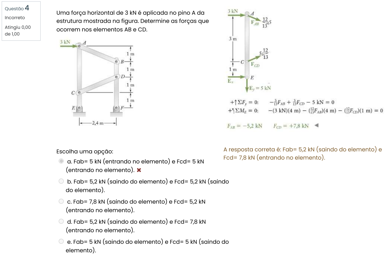 Questão 4 Uma força horizontal de 3 é aplicada no pino A da 3 kN A Incorreto estrutura mostrada na figura. Determine as forças que 12 Atingiu 0,00 ocorrem nos elementos AB e CD. de 1,00 3 m 3 kN A 12 13 B C FCD 1 m D E E. C E F - = 2,4 m Escolha uma opção: A resposta correta é: Fab= 5,2 (saindo do elemento) e a. Fab= 5 (entrando no elemento) e (entrando no elemento). (entrando no elemento). x b. Fab= 5,2 (saindo do elemento) e Fcd= 5,2 (saindo do elemento). C. Fab= 7,8 kN (saindo do elemento) e 5,2 (entrando no elemento). d. 5,2 (saindo do elemento) e Fcd= 7,8 (entrando no elemento). e. Fab= 5 (saindo do elemento) e Fcd= 5 (saindo do elemento).