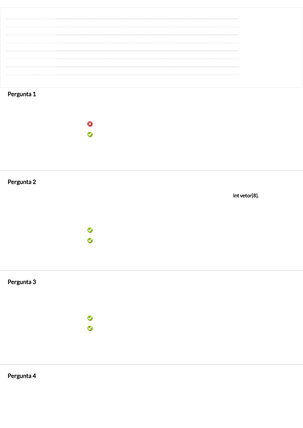 / Usuário HEITOR ADAME DA SILVA Curso CCO04046 ALGORITMOS E PROGRAMAÇÃO GR0049202 - 202020.ead-11066.01 Teste ATIVIDADE 4 (A4) Iniciado 01/09/20 20:19 Enviado 01/09/20 20:38 Status Completada Resultado da tentativa 9 em 10 pontos Tempo decorrido 19 minutos Resultados exibidos Respostas enviadas, Respostas corretas, Comentários Pergunta 1 Resposta Selecionada: [Sem Resposta] Resposta Correta: Feedback da resposta: A linguagem C de�ne uma matriz como um vetor, no qual ambos os elementos são vetores do mesmo tipo e também do mesmo tamanho. Sabendo disso, assinale a alternativa correta. Matriz pode ser declarada através do comando int matriz[2][1]. Sua resposta está incorreta. A alternativa correta é apenas a que diz que a declaração de matriz pode ser feita através do seguinte comando int matriz[2][1]. Pois está sendo de�nido o tipo, nome, quantidade de linhas e colunas. Pergunta 2 Resposta Selecionada: Resposta Correta: Feedback da resposta: A criação de um vetor do tipo inteiro com oito posições pode ser declarado através do código int vetor[8]. A partir da declaração, ao realizarmos a atribuição do valor de cada índice sendo o próprio índice + 1, qual será o valor do vetor no índice número 4? Assinale a alternativa que corresponde à resposta correta: 5 5 Resposta correta. O valor do vetor no índice de número 4 será 5, pois será o valor do índice somado o número 1, que resulta um total de 5. Pergunta 3 Resposta Selecionada: Resposta Correta: Feedback da resposta: A linguagem C de�ne uma matriz como um vetor multidimensional, no qual ambos os elementos são vetores do mesmo tipo e também do mesmo tamanho. Por exemplo, uma matriz que possui um vetor do tipo char com tamanho 5, todos os outros serão iguais. Assinale a alternativa que complementa a explicação de uma matriz. Uma matriz pode ter múltiplas dimensões, por exemplo matriz[3][3][3]. Uma matriz pode ter múltiplas dimensões, por exemplo matriz[3][3][3]. Resposta correta. A resposta que complementa uma matriz é que uma matriz pode ser multidimensional, podendo ter dimensões maiores do que apenas 2, ou seja, matriz com 3 dimensões existe e é utilizado. Pergunta 4 Com base nos estudos sobre matriz, observe o seguinte código: #include int main() { int matriz[3][2]; 0 em 1 pontos 1 em 1 pontos 1 em 1 pontos 1 em 1 pontos / Resposta Selecionada: Resposta Correta: Feedback da resposta: int y; int x; for (y = 0; y int main() { int vetor[5]; int indice; printf("Escreva 5 números: "); for (indice = 0; indice #include #include int main() { int vetor[5], i; for (i = 0; i #include #include int main(void) { int numero, d, numerod = 0, vetor[numerod], contador = 0; scanf("%d",&numero); for (d = 1; dA alternativa está incorreta, já que a resposta correta é 20 e 25, o algoritmo vai realizar a divisão de 100 até 1, ou seja 20 é divisor de 100 e 25 é divisor de 100, ou seja vai ser apresentando então na ordem 20 e 25, pois primeiramente ele faz 100 dividido por 4 igual a 25 e depois 100 dividido por 5 igual a 20, e apresentando inversamente 20 e 25. ← OK 1 em 1 pontos javascript:launch('/webapps/blackboard/content/listContent.jsp?content_id=_14068560_1&course_id=_610113_1&nolaunch_after_review=true');