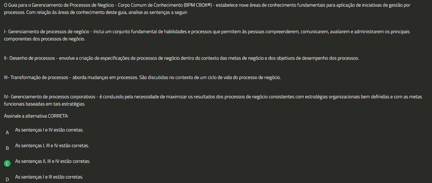 Guia para Gerenciamento de Processos de Negócio - Corpo Comum de Conhecimento (BPM CBOK - estabelece nove áreas de conhecimento fundamentais para aplicação de iniciativas de gestão por processos. Com relação às áreas de conhecimento deste guia, analise as sentenças a I- Gerenciamento de processos de negócio - Inclui um conjunto fundamental de habilidades e processos que permitem às pessoas compreenderem, comunicarem, avaliarem e administrarem os principais componentes dos processos de negócio. Desenho de processos - envolve a criação de especificações de processos de negócio dentro do contexto das metas de negócio e dos objetivos de desempenho dos processos. III- Transformação de processos - aborda mudanças em processos. São discutidas no contexto de um ciclo de vida do processo de negócio IV- Gerenciamento de processos corporativos - é conduzido pela necessidade de maximizar os resultados dos processos de negócio consistentes com estratégias organizacionais bem definidas e com as metas funcionais baseadas em tais estratégias. Assinale a alternativa CORRETA: A As sentenças e IV estão corretas. B As sentenças I, III e IV estão corretas. As sentenças II, III e IV estão corretas. D As sentenças e III estão corretas.